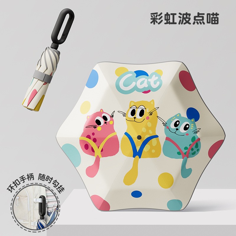 • 링 버클 6본 안전 둥근 모서리 어린이 우산 무지개 물방울 무늬 야옹