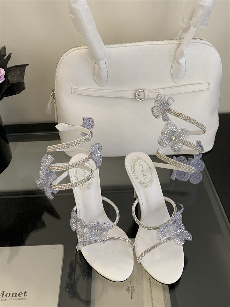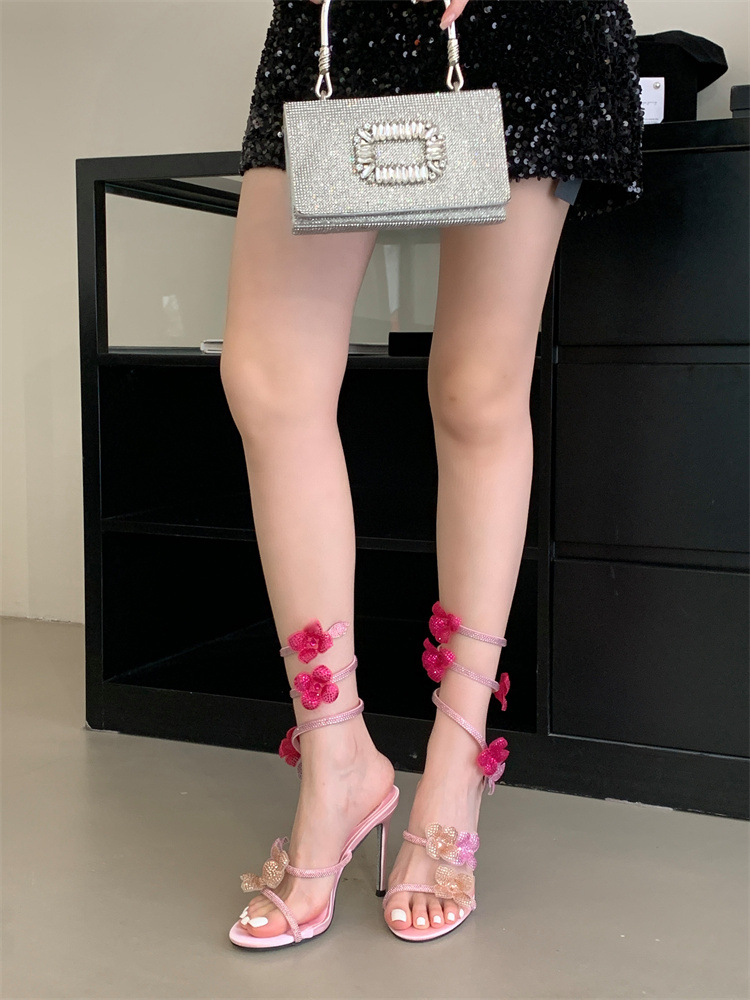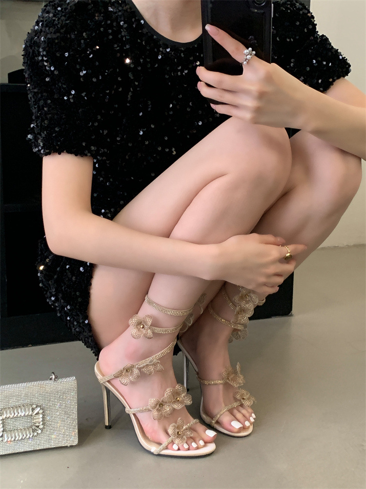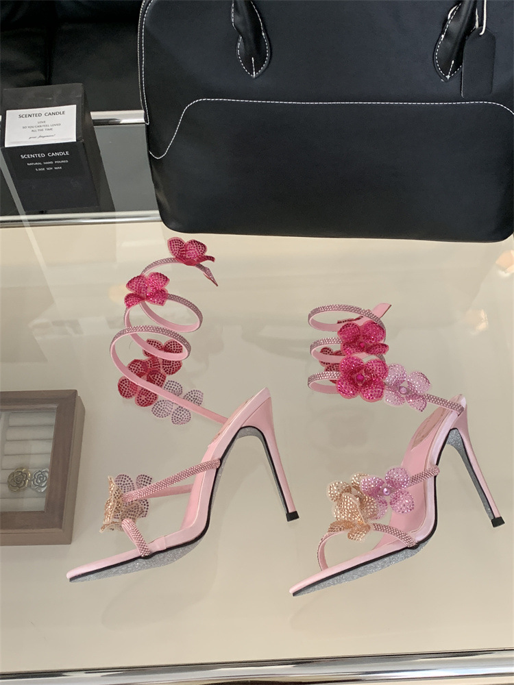 스네이크 모양의 랩 얇은 힐 샌들 여자 2025 봄 새 라운드 발가락 한 발가락 활 하이힐스토어 가기