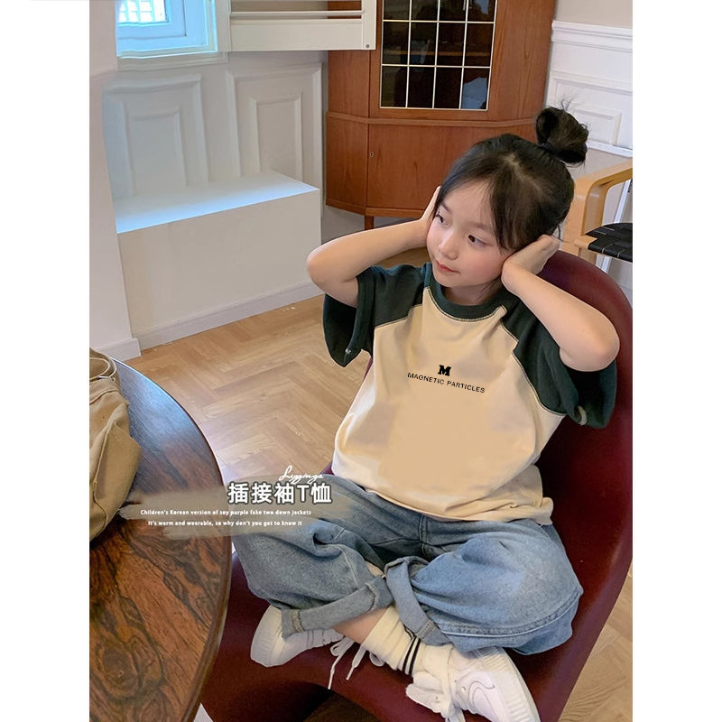 아동복 소녀면 반팔 티셔츠 여름 어린이 한국 스타일 소녀 라글란 슬리브 스티칭 탑 트렌디스토어 가기