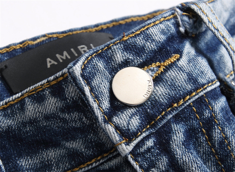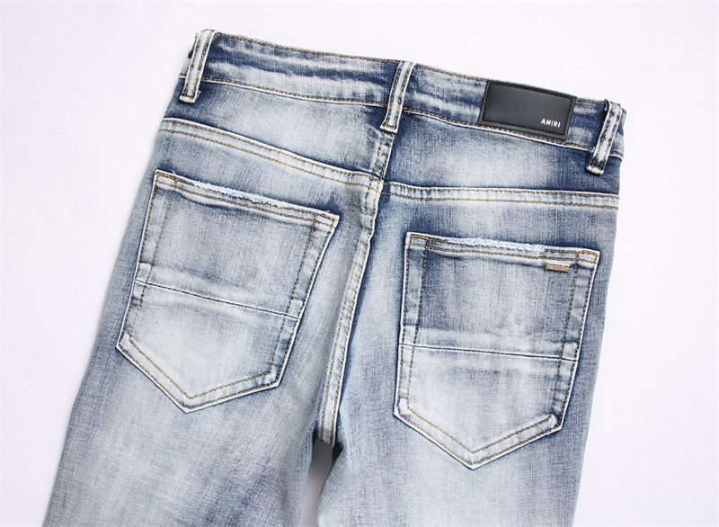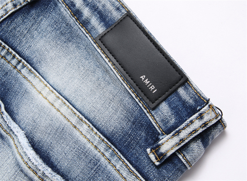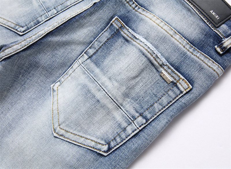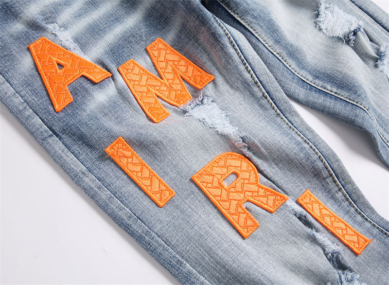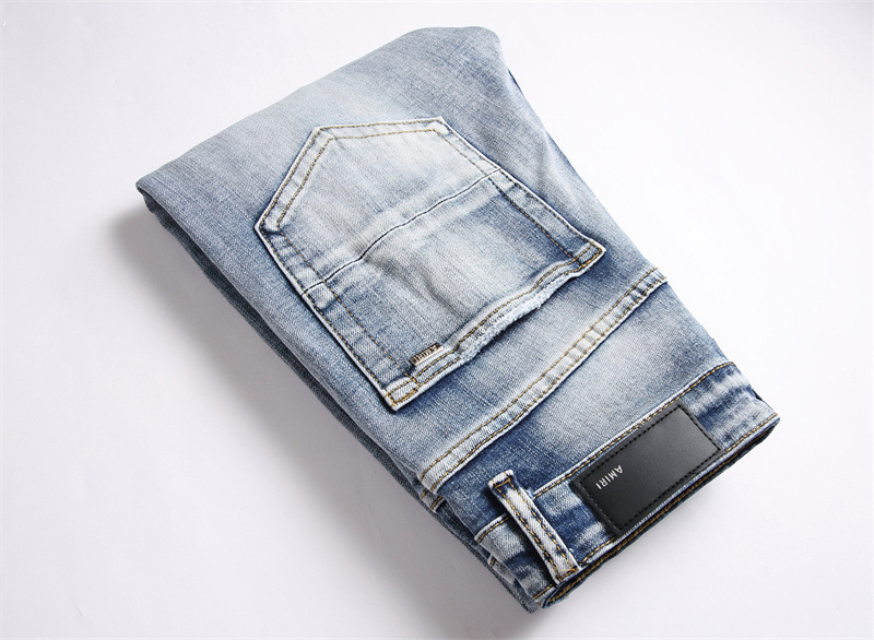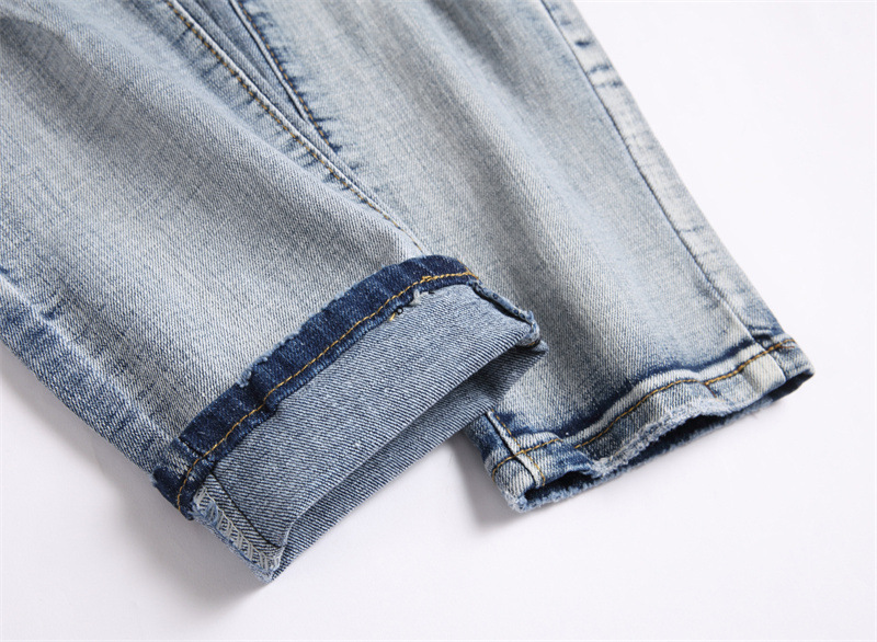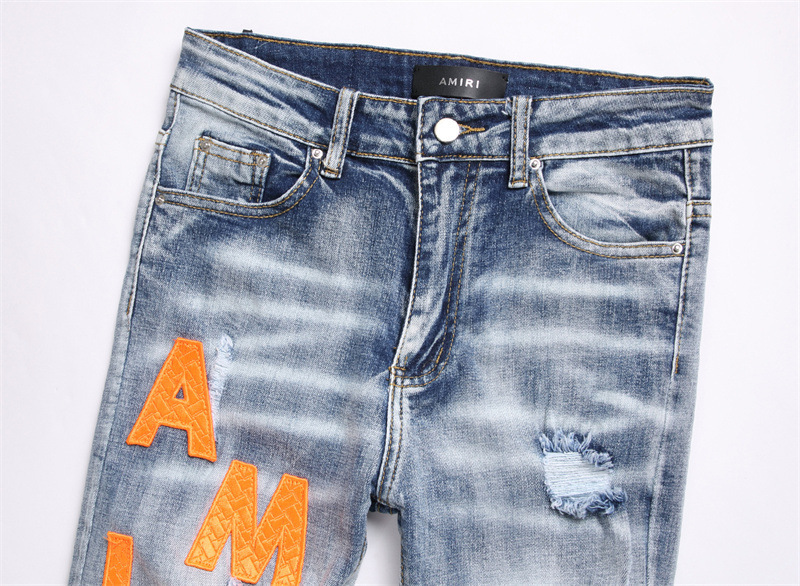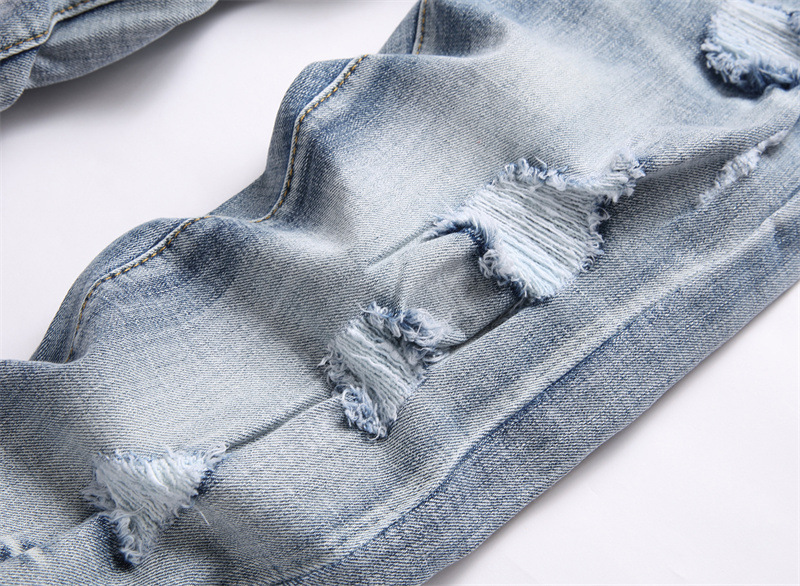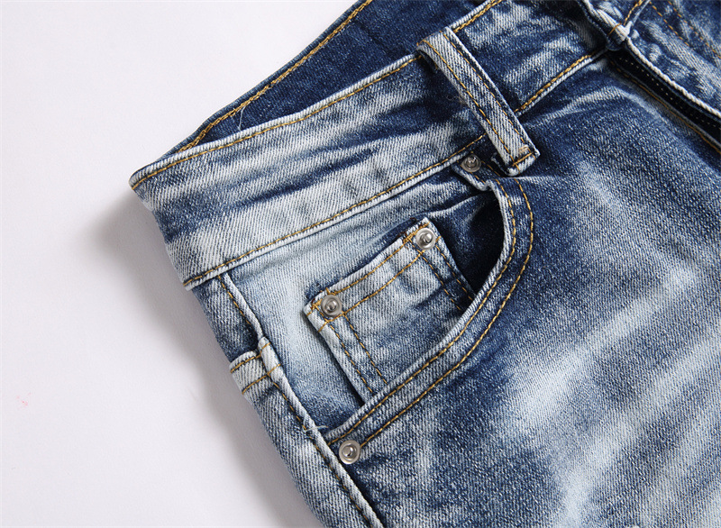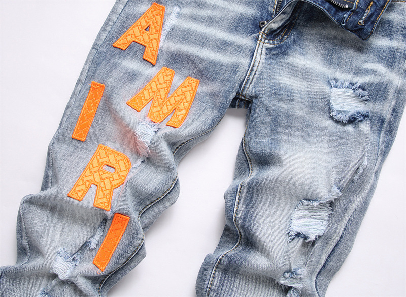 새로운 대외 무역 스타일 블루 찢어진 편지 단단한 스트레치 하이 스트리트 미드 웨이스트 남성 청바지 트렌디 3839스토어 가기