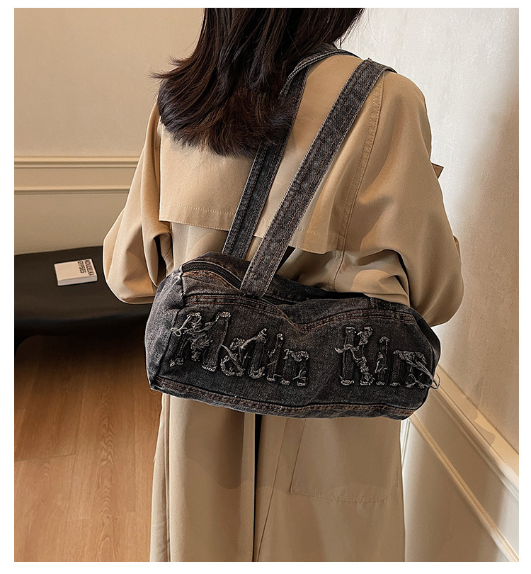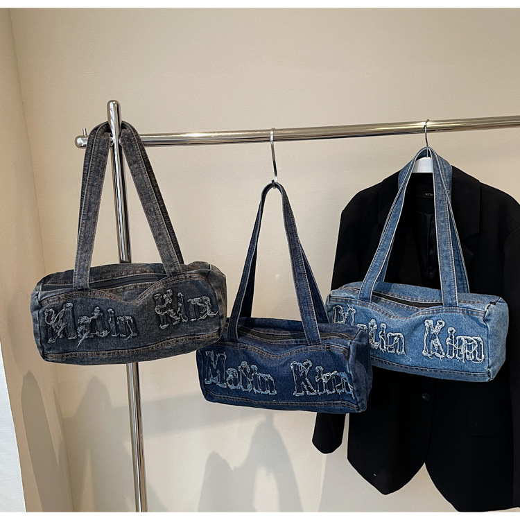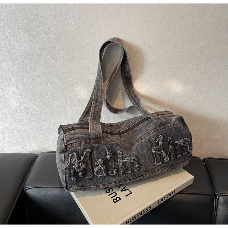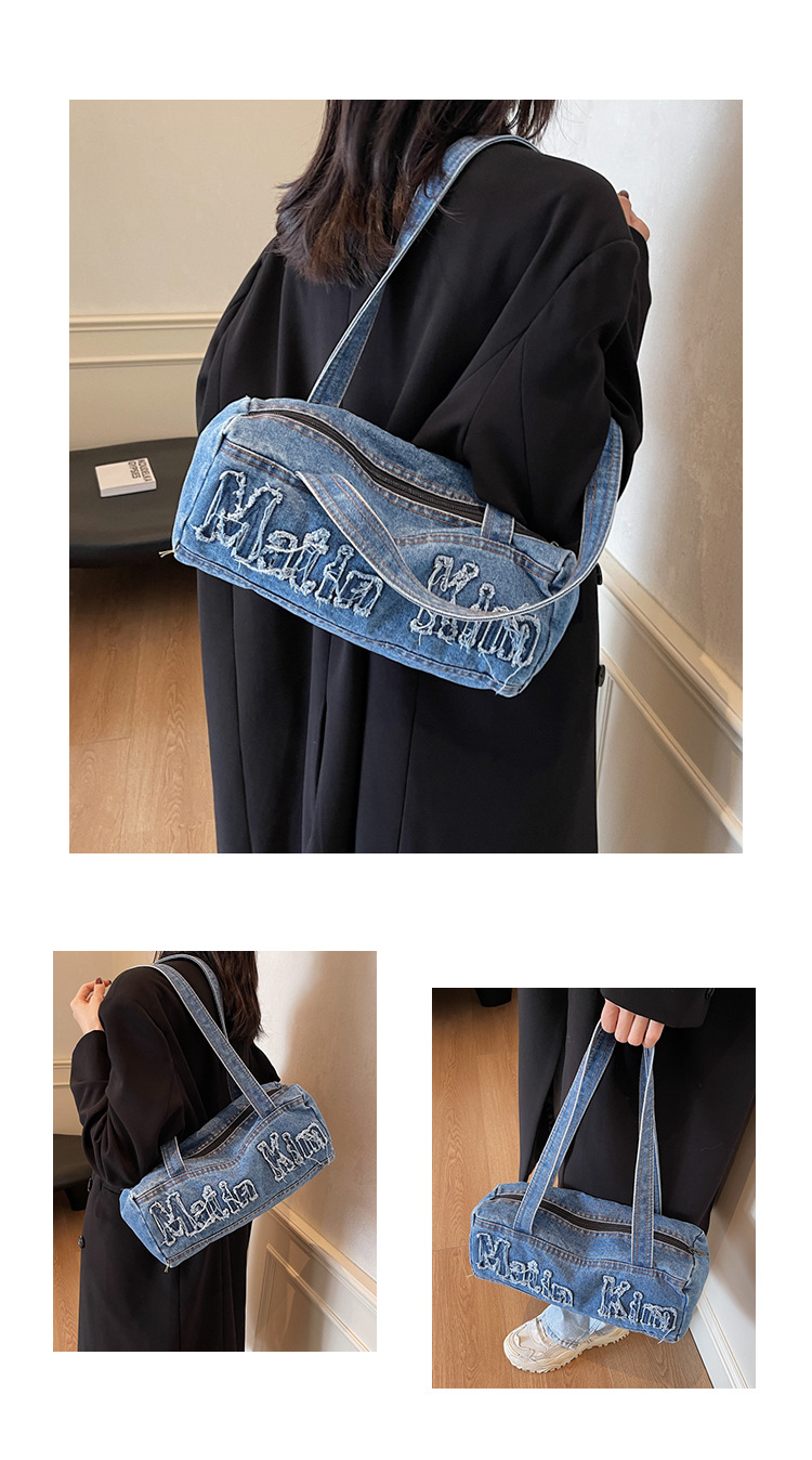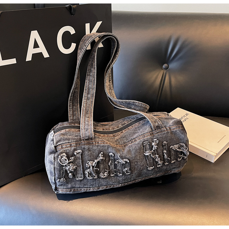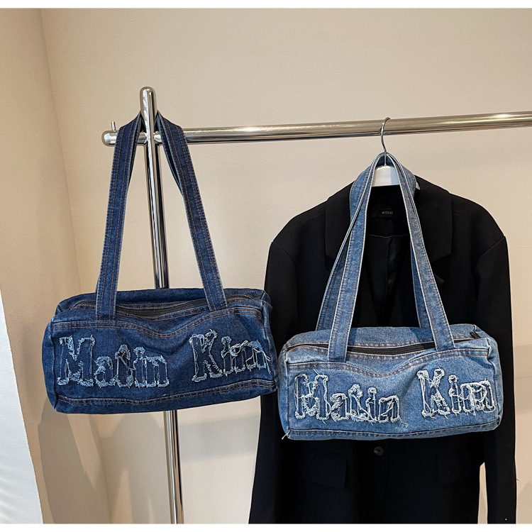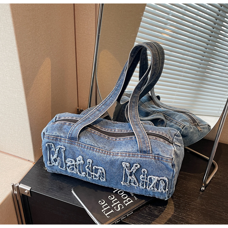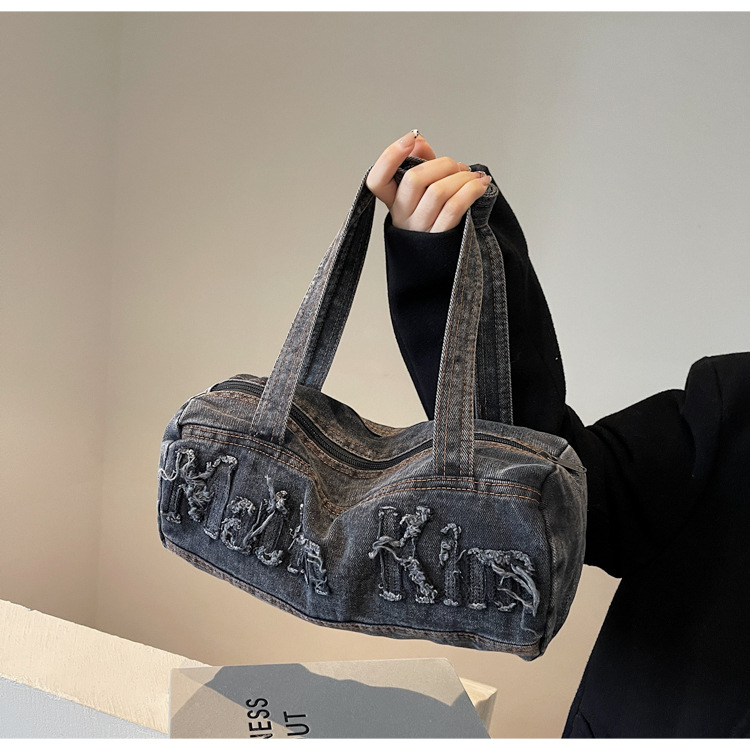 한국어 자수 워싱 데님 숄더백 대용량 여행 피트니스 보스턴백 2025 신상스토어 가기