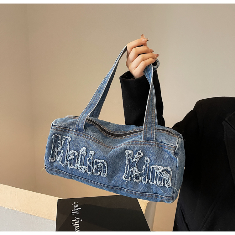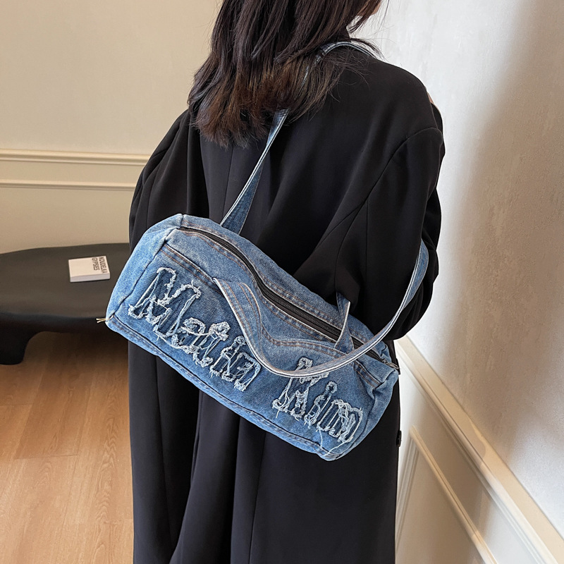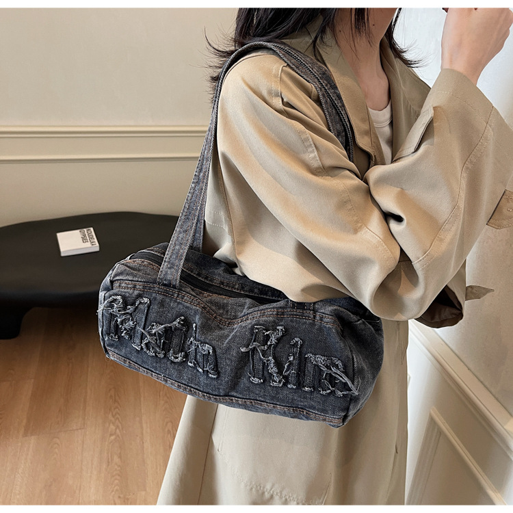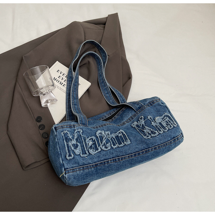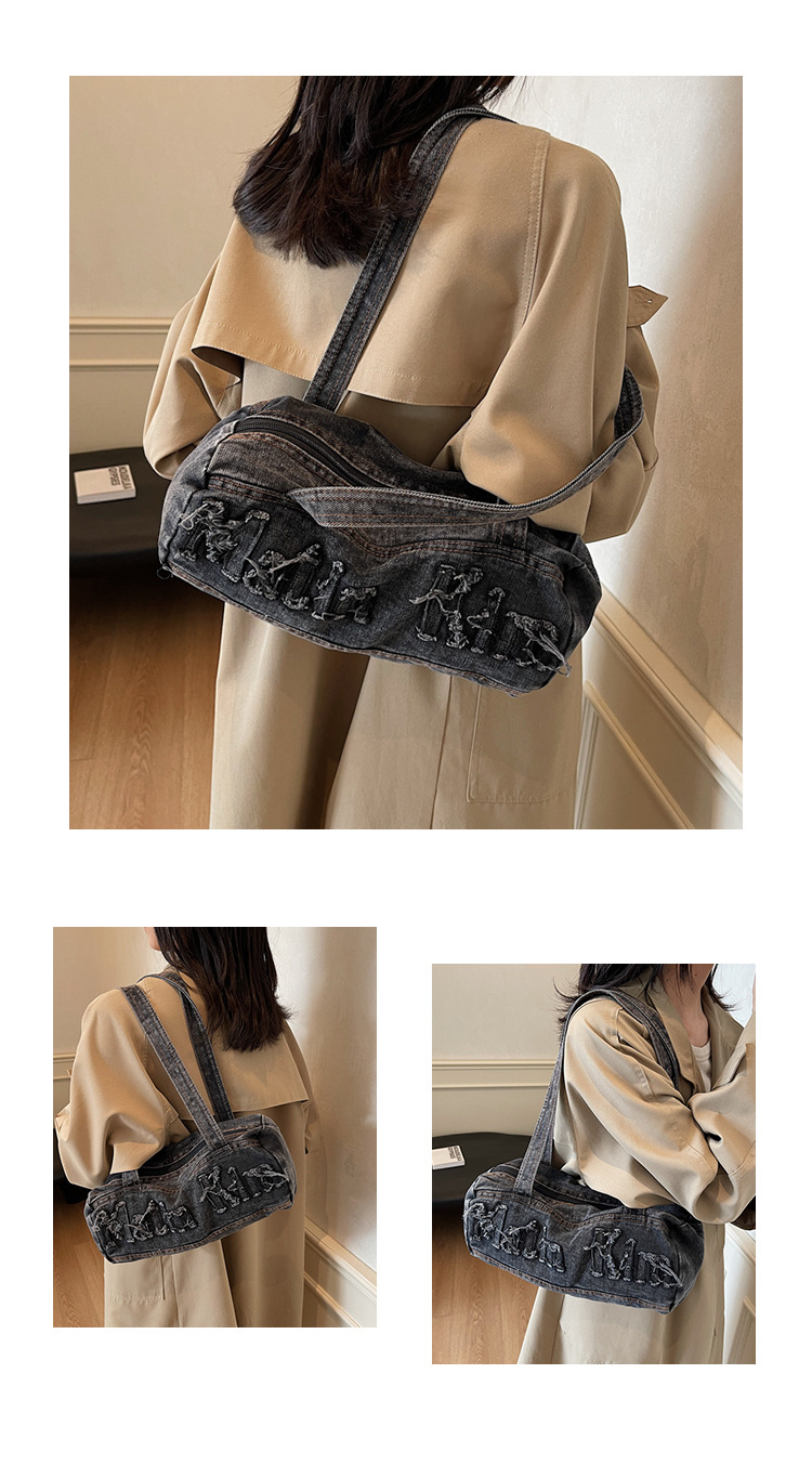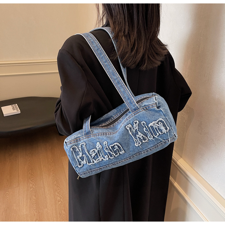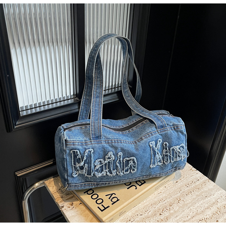 한국어 자수 워싱 데님 숄더백 대용량 여행 피트니스 보스턴백 2025 신상스토어 가기