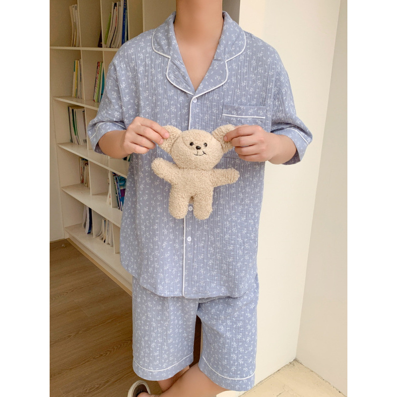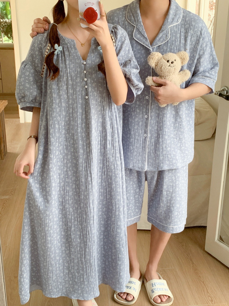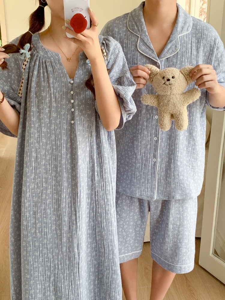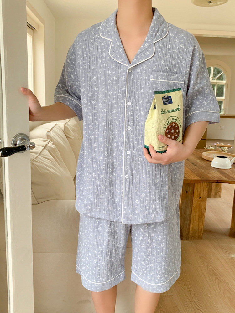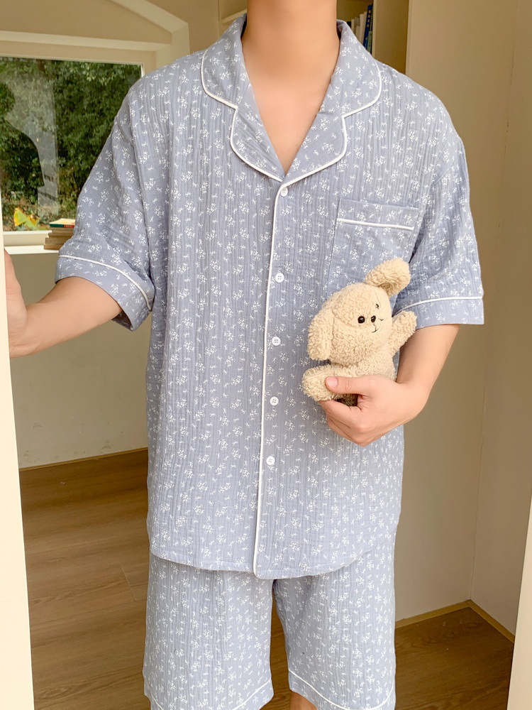대외 무역 커플을위한 국경 특별 파자마 잠옷 여름 반팔 꽃 할로우 아웃 캐주얼 의상 남성 세트스토어 가기