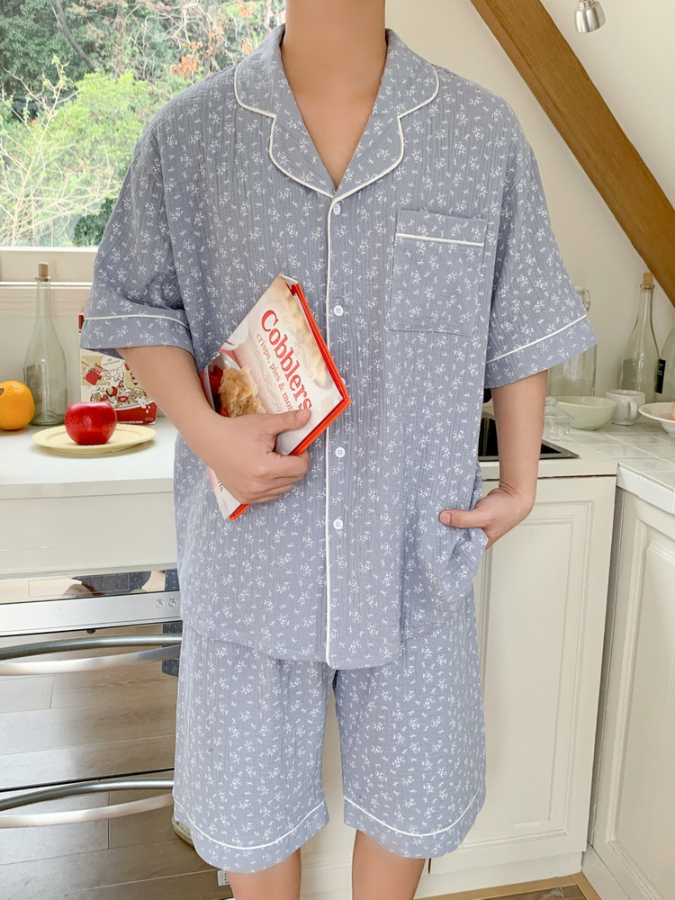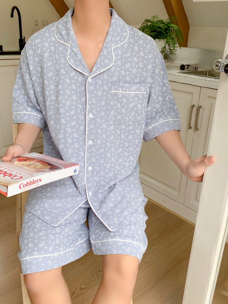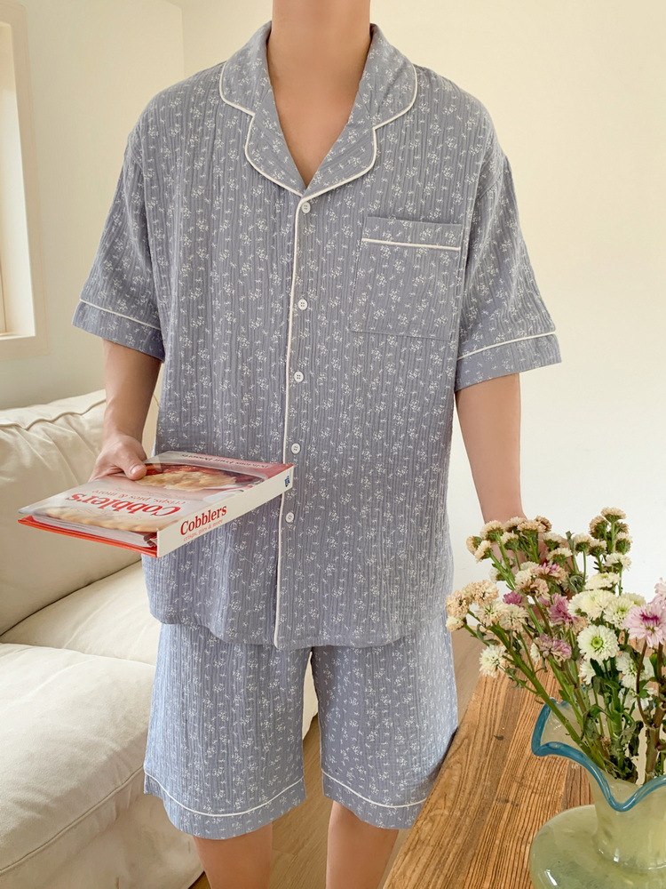 대외 무역 커플을위한 국경 특별 파자마 잠옷 여름 반팔 꽃 할로우 아웃 캐주얼 의상 남성 세트