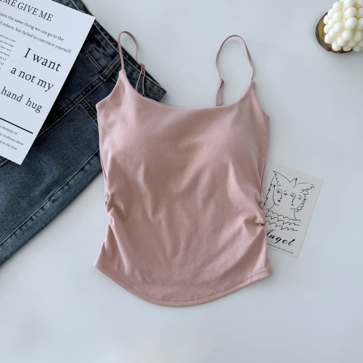 도파민 신선한 작은 카미 솔 여성 탑 가슴 패드 주름 외부 착용 내부 슬림 핏 베이스 순수한 욕망 소녀 탑
