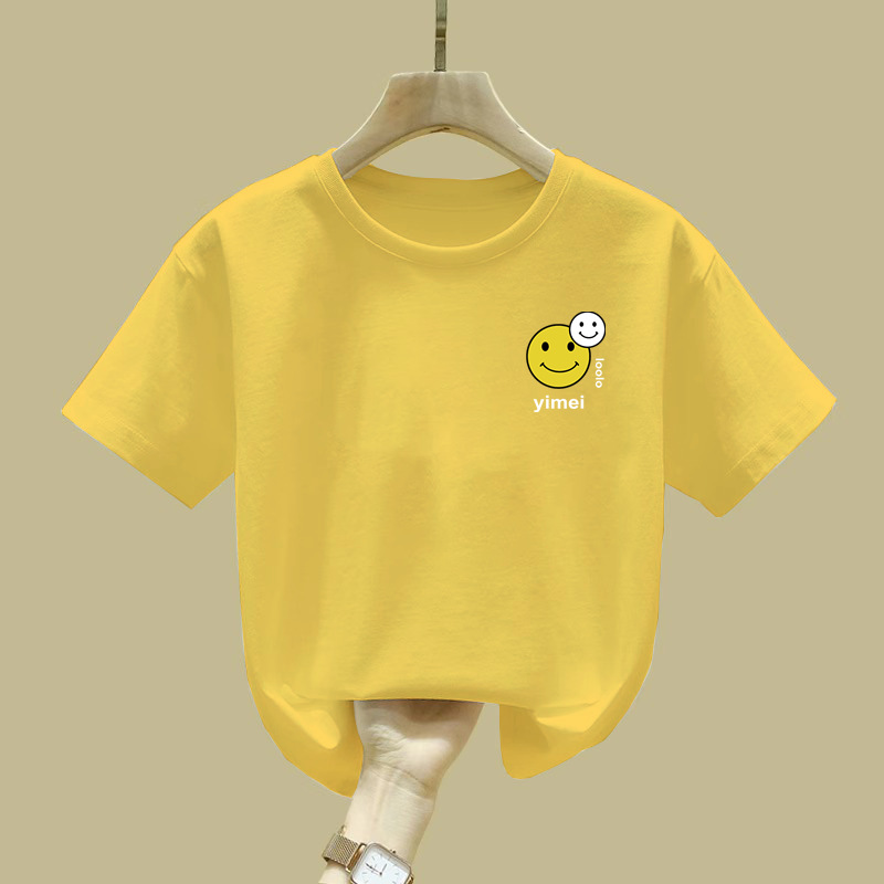 2398 # 어린이 스마일리 인쇄 된 흰색 반팔 티셔츠 소년 소녀 여름 패션 심플 코튼 탑 중 큰 어린이스토어 가기