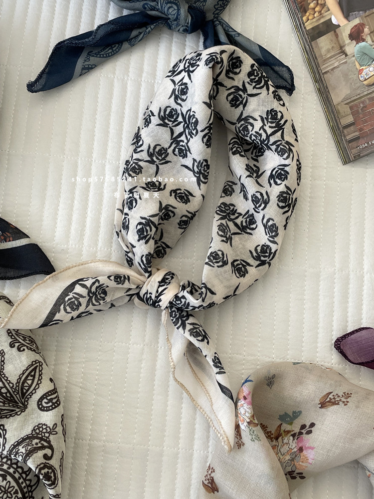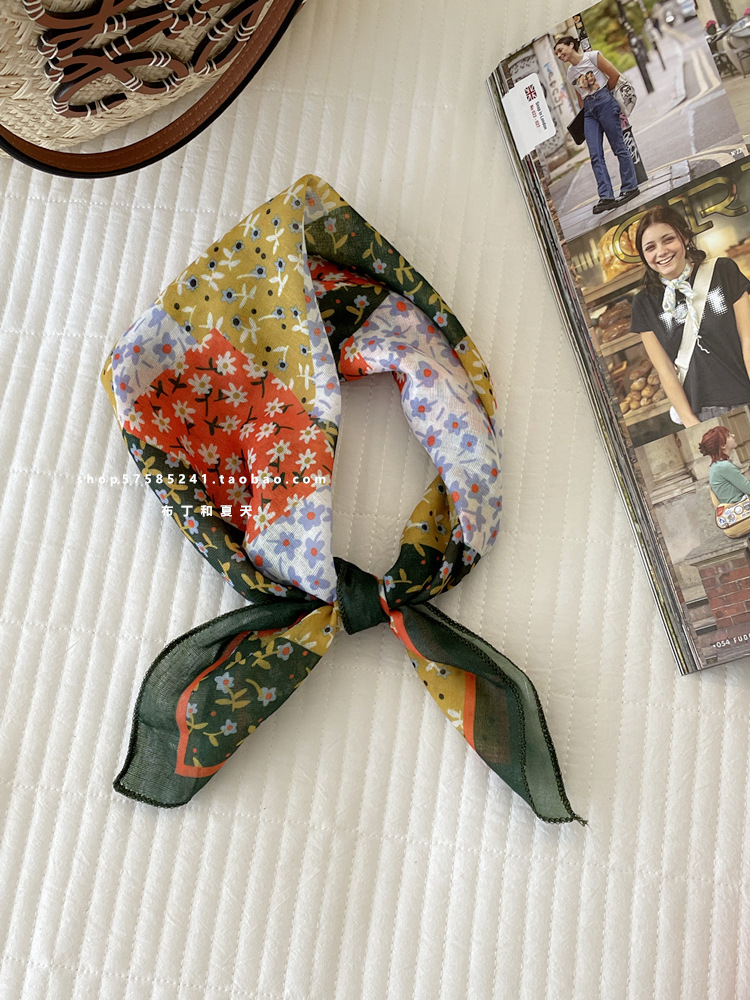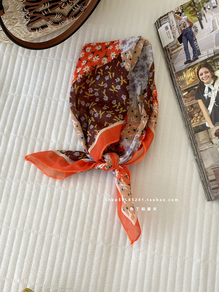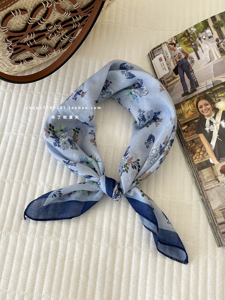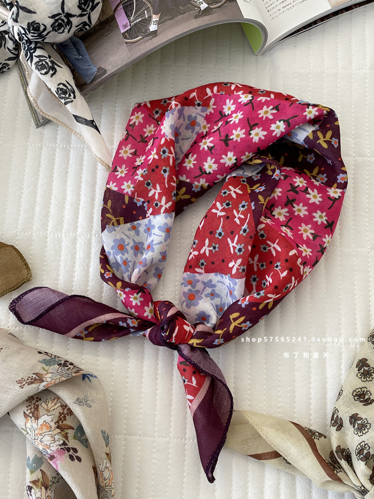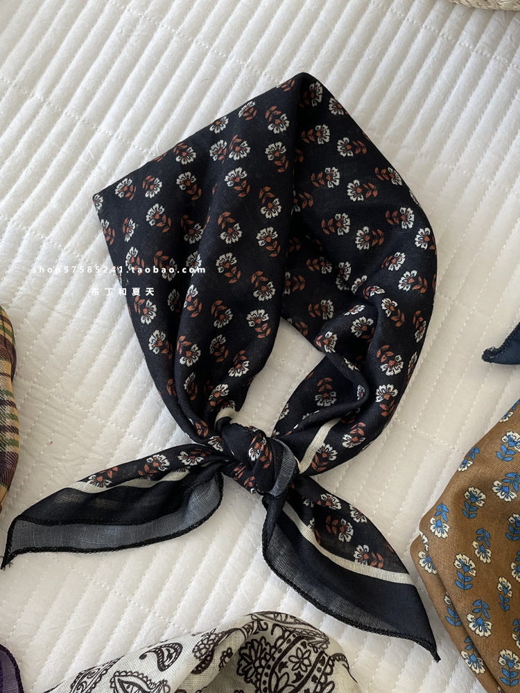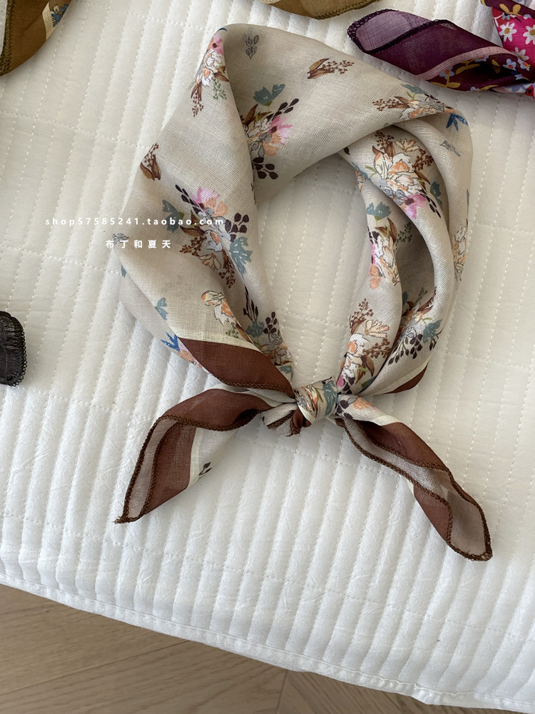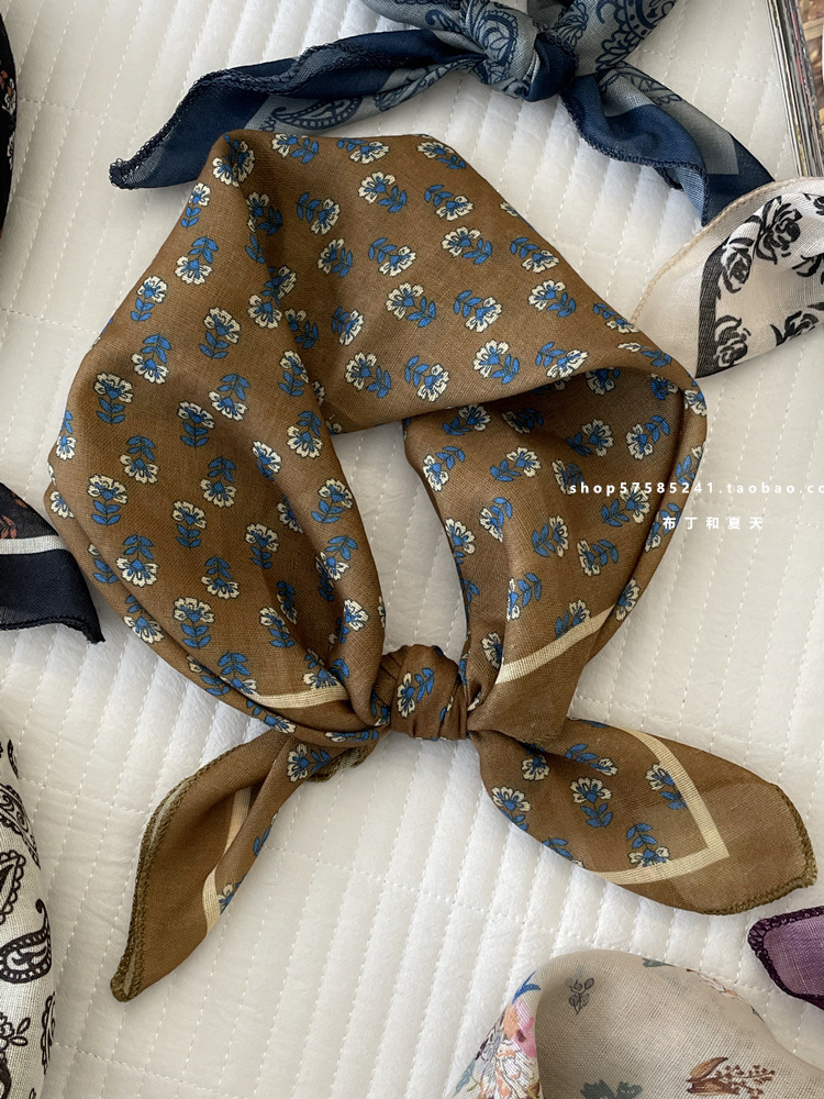 일본 스타일 라이트 빈티지 예술적 겹쳐진 모리 스타일 꽃 작은 스퀘어 스카프 통근 실크 스카프 헤드 스카프 면 리넨 스카프 한국 스타일스토어 가기