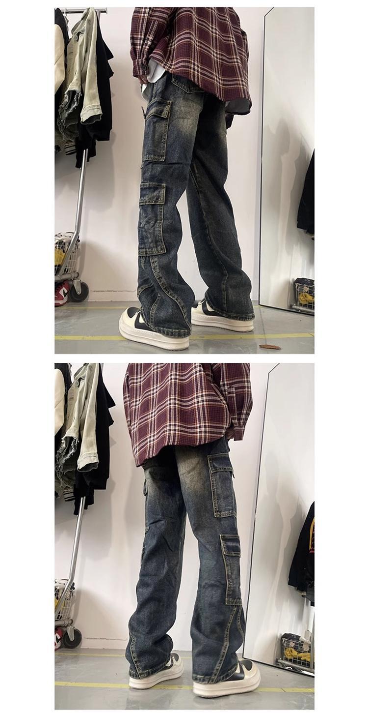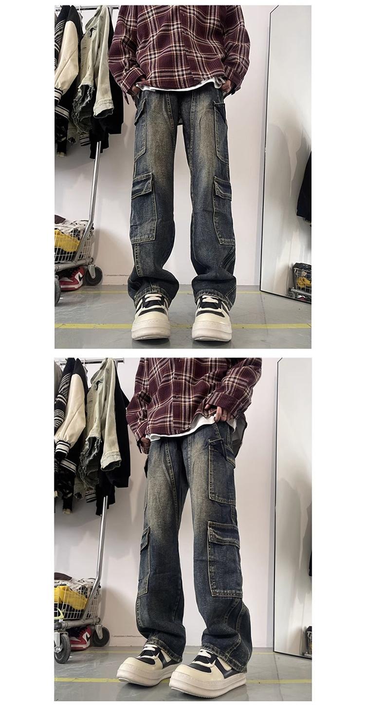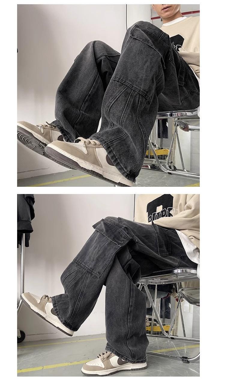 세탁 된 툴링 청바지 남성용 스트레이트 튜브 느슨한 넓은 다리 미국 스타일 하이 스트리트 팬츠 트렌디 브랜드 레트로 포켓 디자인