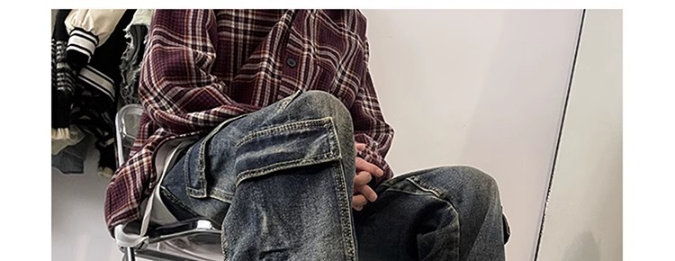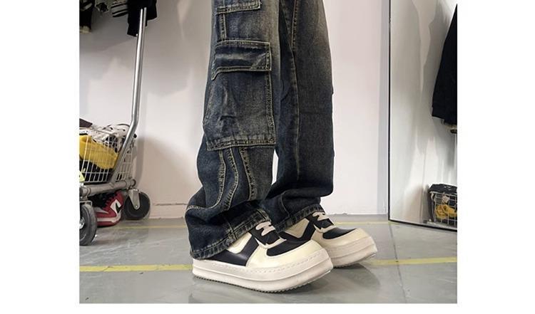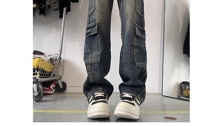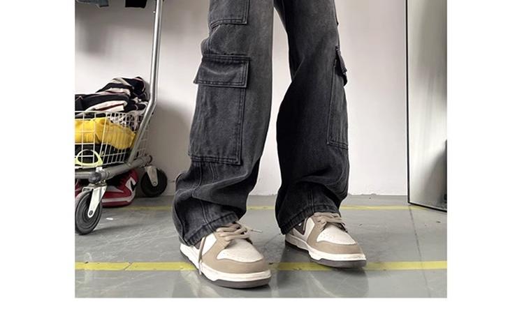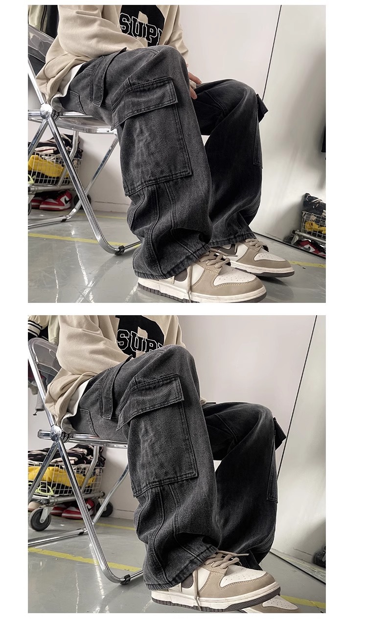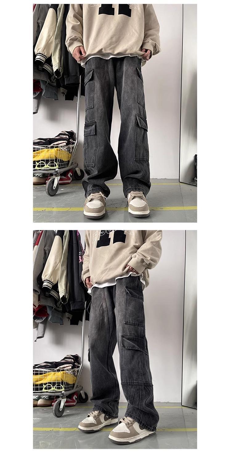 세탁 된 툴링 청바지 남성용 스트레이트 튜브 느슨한 넓은 다리 미국 스타일 하이 스트리트 팬츠 트렌디 브랜드 레트로 포켓 디자인