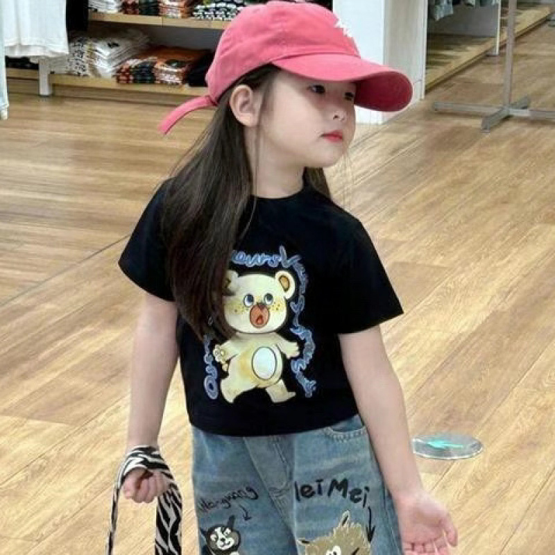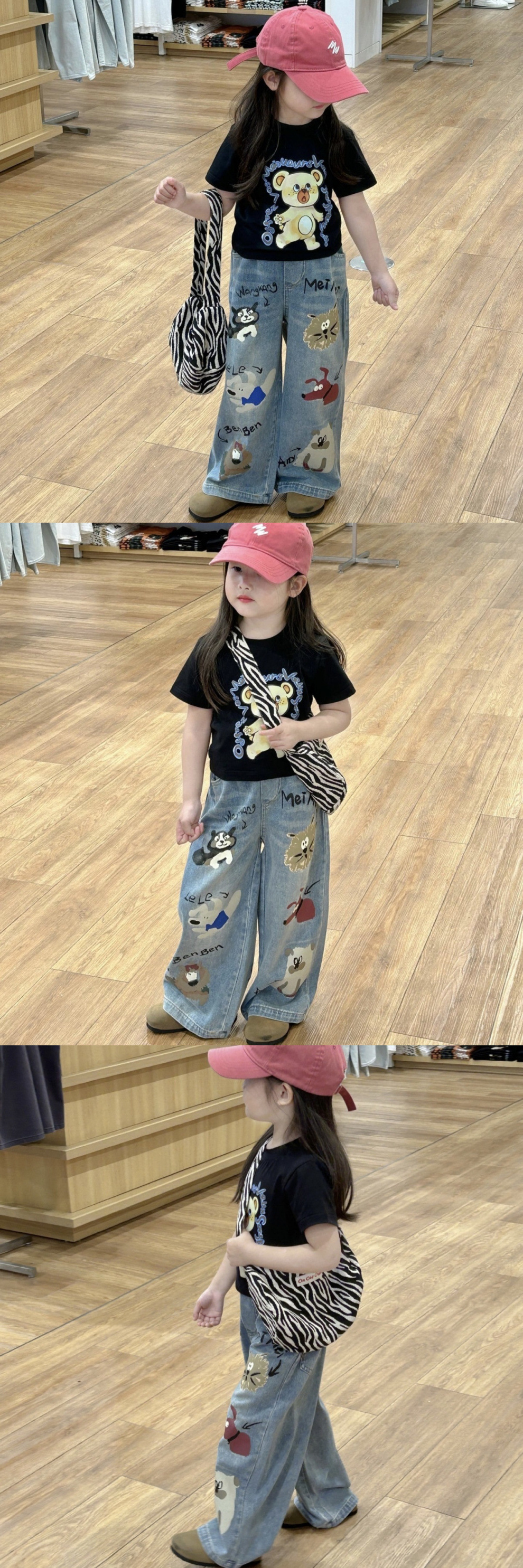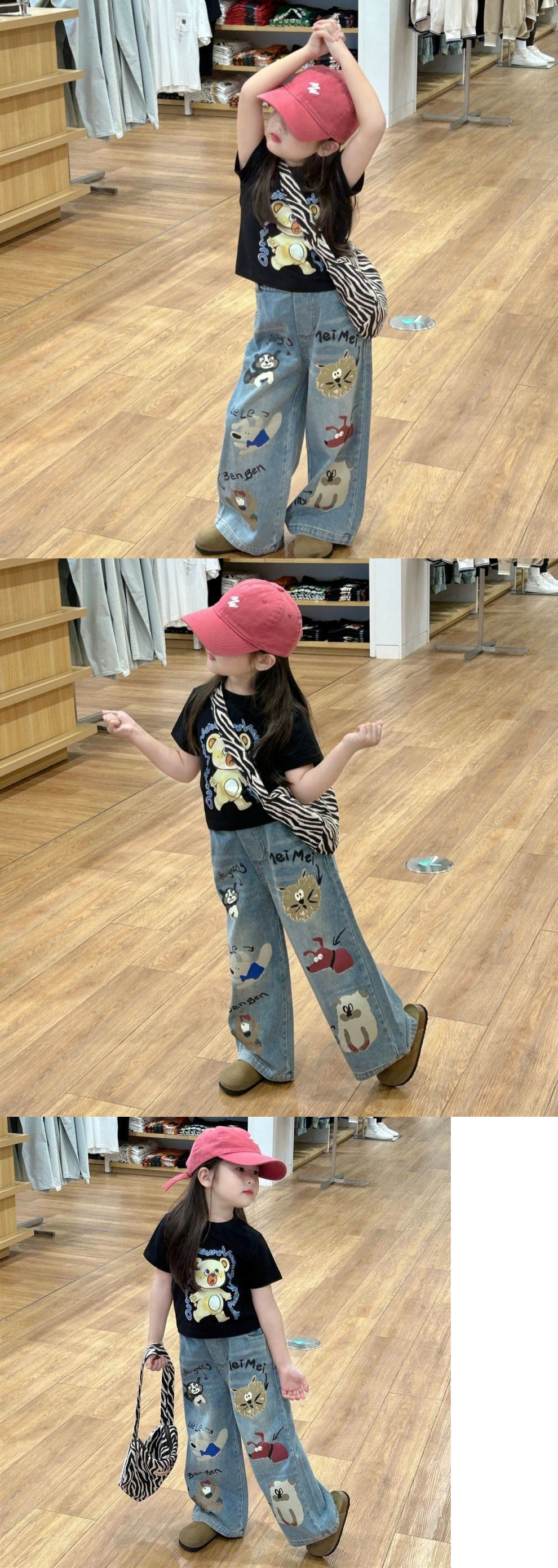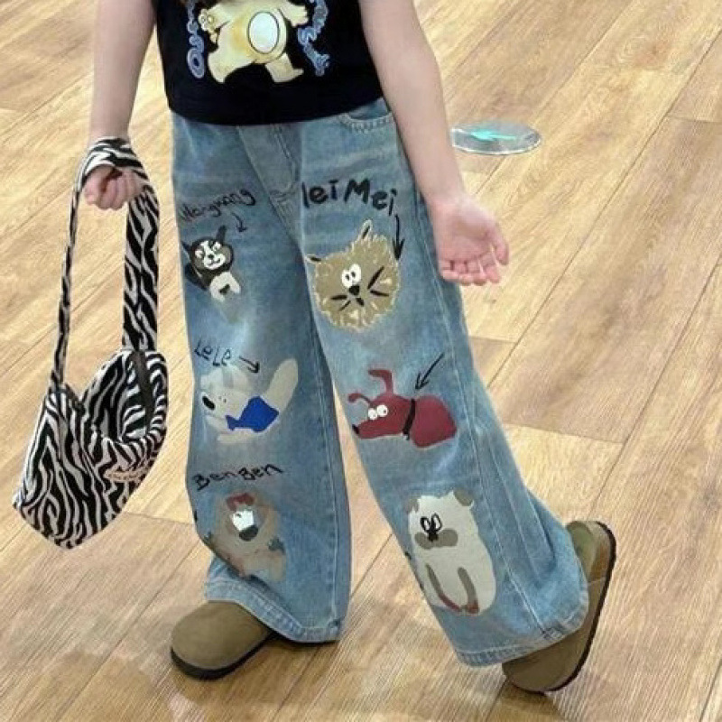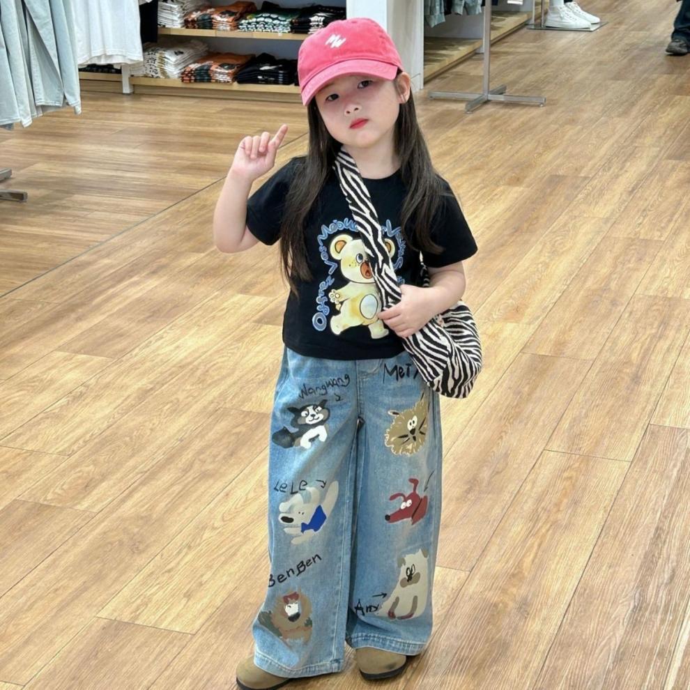2025 여름 한국 스타일 소녀 낙서 만화 데님 넓은 다리 바지 올매치 인쇄 반팔 티셔츠 투피스 세트 트렌디스토어 가기
