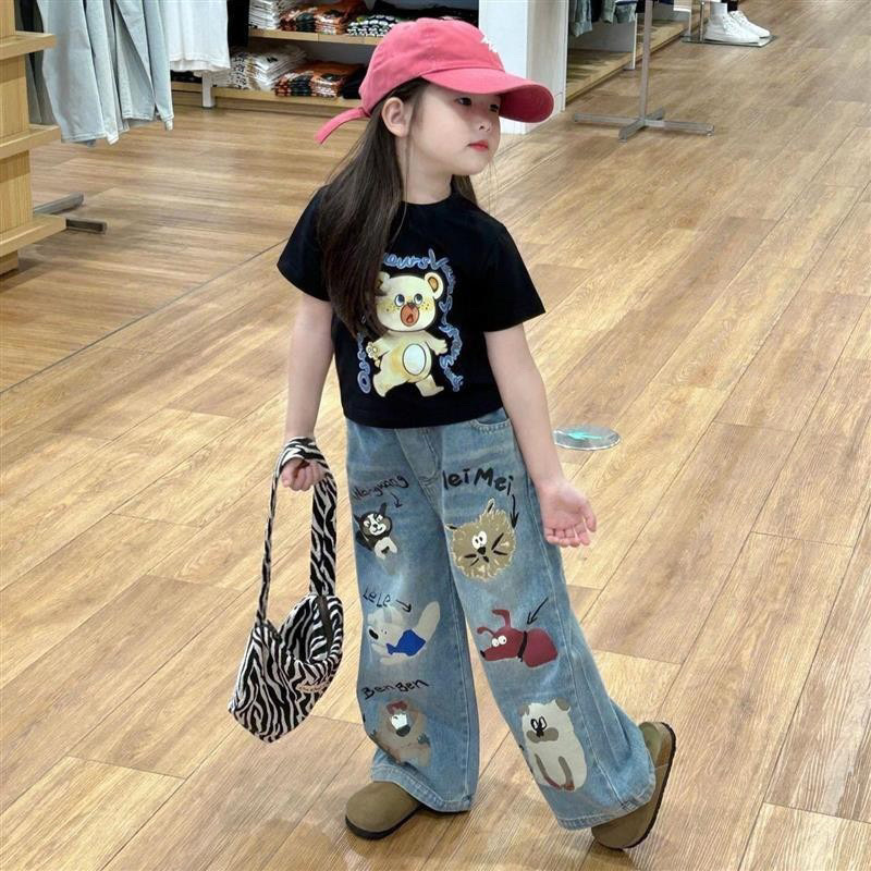 2025 여름 한국 스타일 소녀 낙서 만화 데님 넓은 다리 바지 올매치 인쇄 반팔 티셔츠 투피스 세트 트렌디