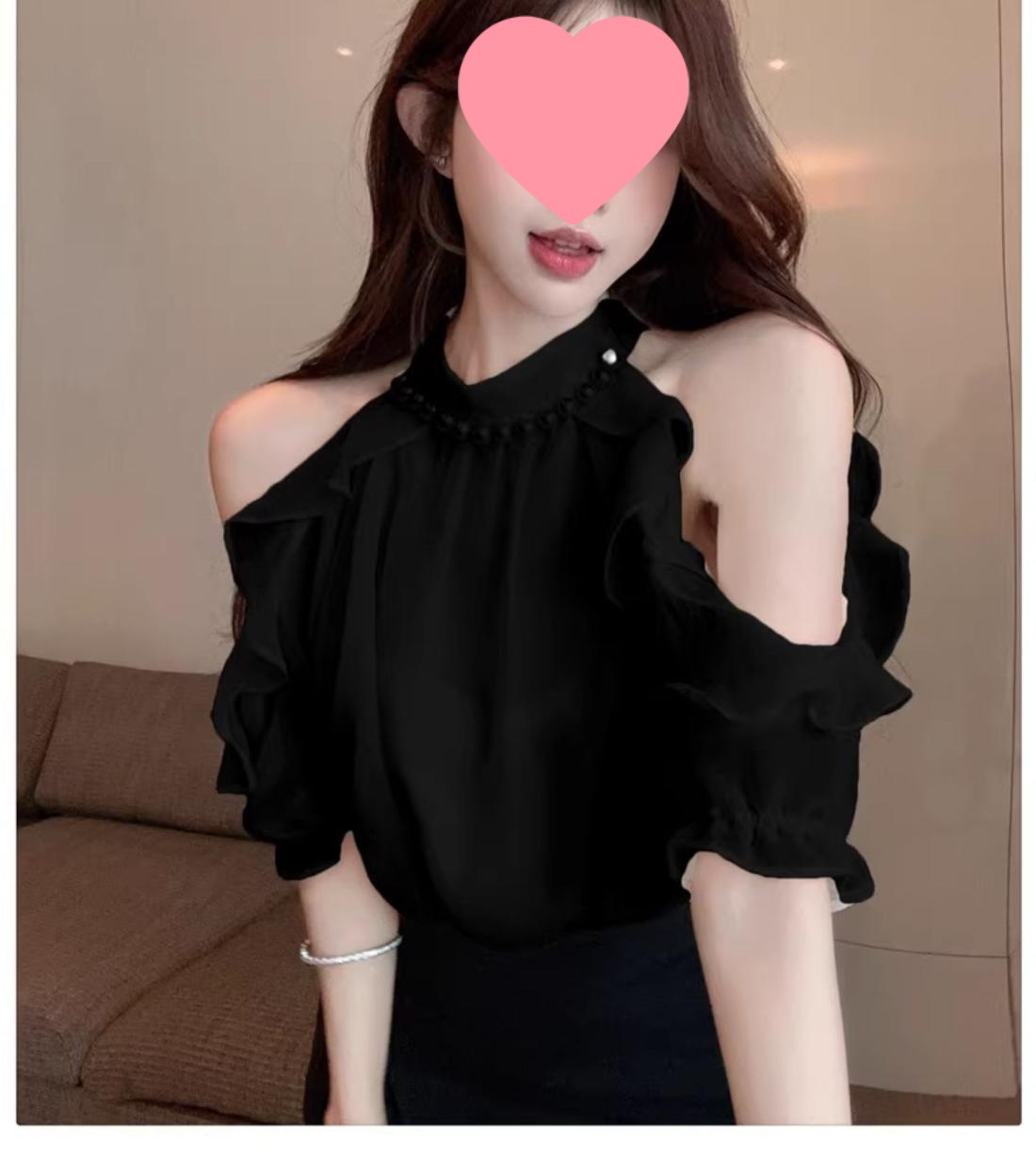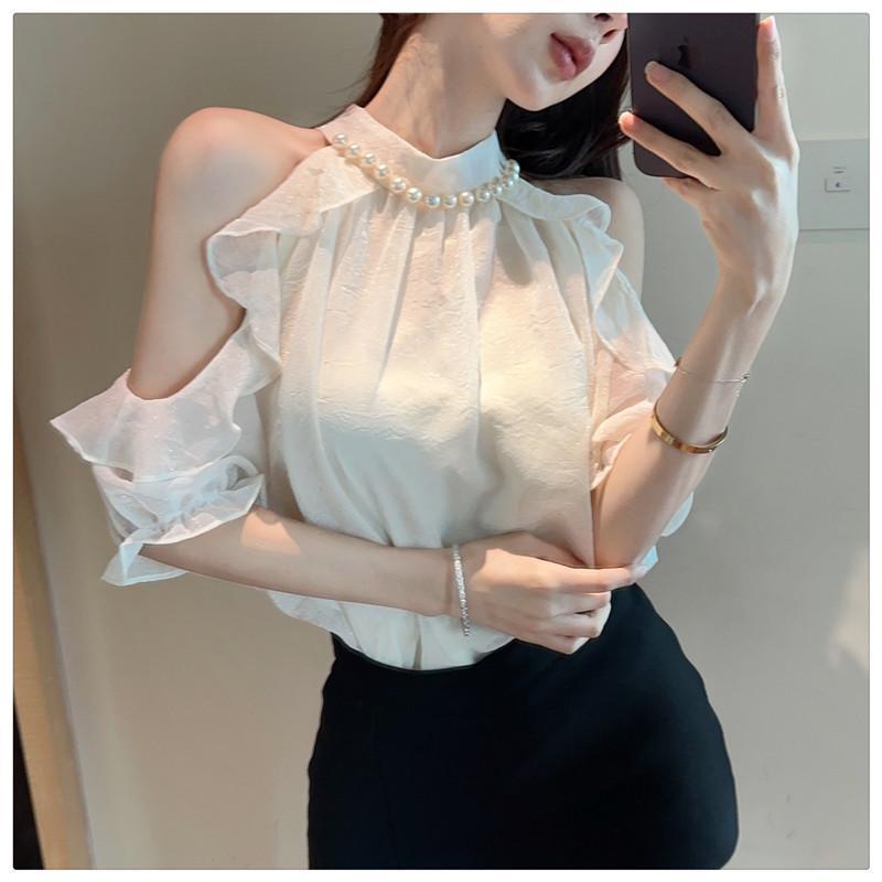 주름진 프랑스 요정 쉬폰 셔츠 여성용 여름 순수한 욕망 스파이스 어깨 목 탑 세련된 아름다운 셔츠