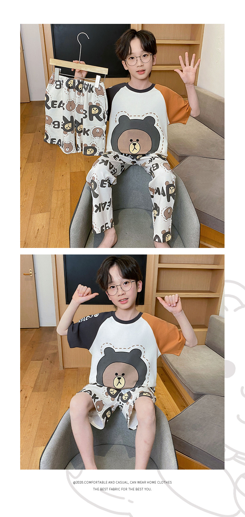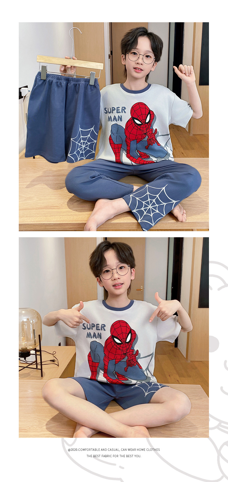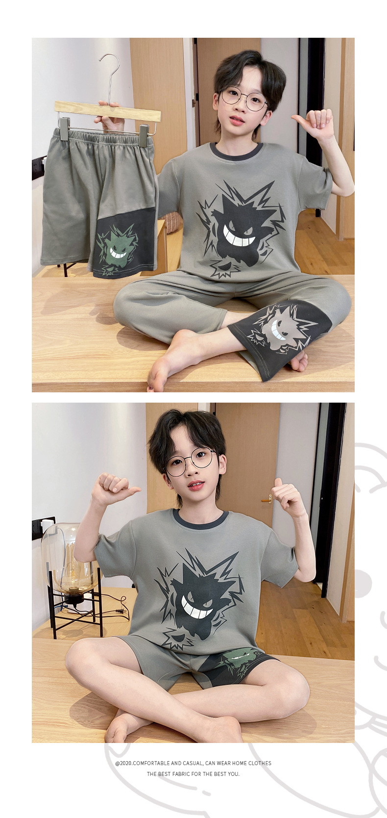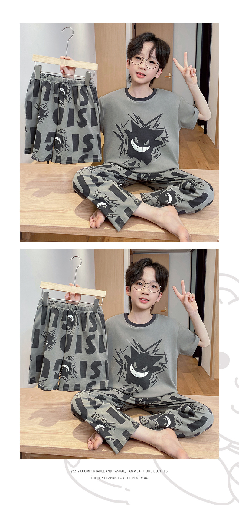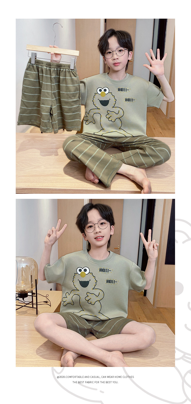 어린이 잠옷 3 피스 여름 순수 코튼 얇은 새로운 스타일 소년 중대형 어린이 소년 청소년 홈웨어스토어 가기