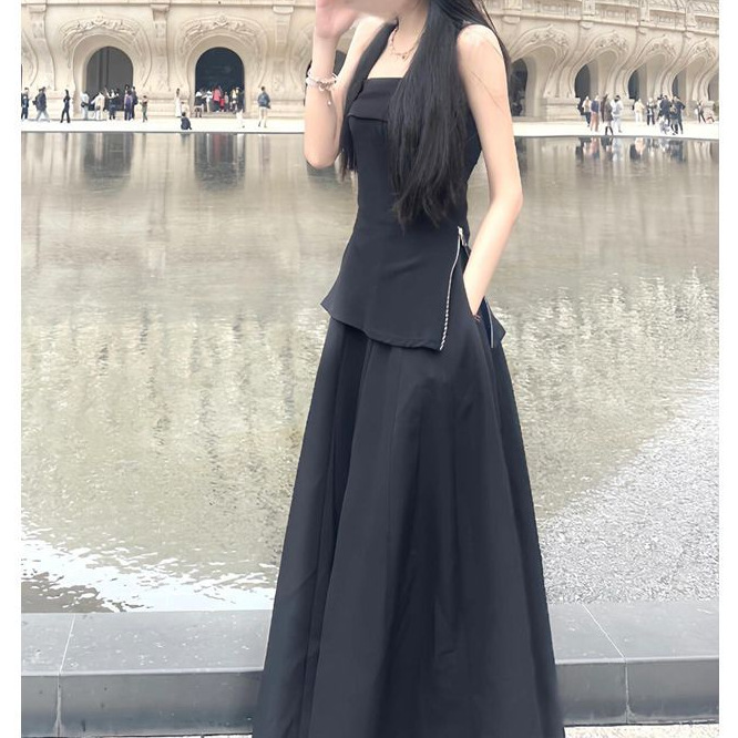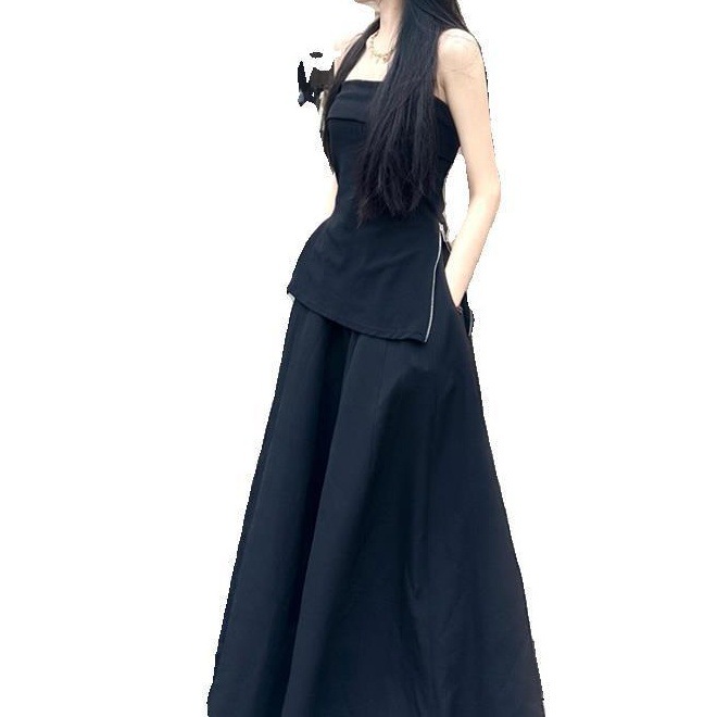 고급스러운 튜브탑 짧은 지퍼 조끼 탑 여성 2026 여름 하이웨이스트 솔리드 컬러 롱 팬츠 스커트 투피스 세트