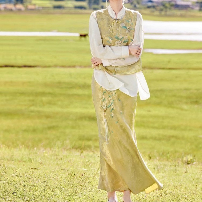 새로운 중국 스타일 국가 스타일 세트 여성 민족 스타일 자수 셔츠 조끼 3 종 세트 봄과 가을 패션 서양식스토어 가기