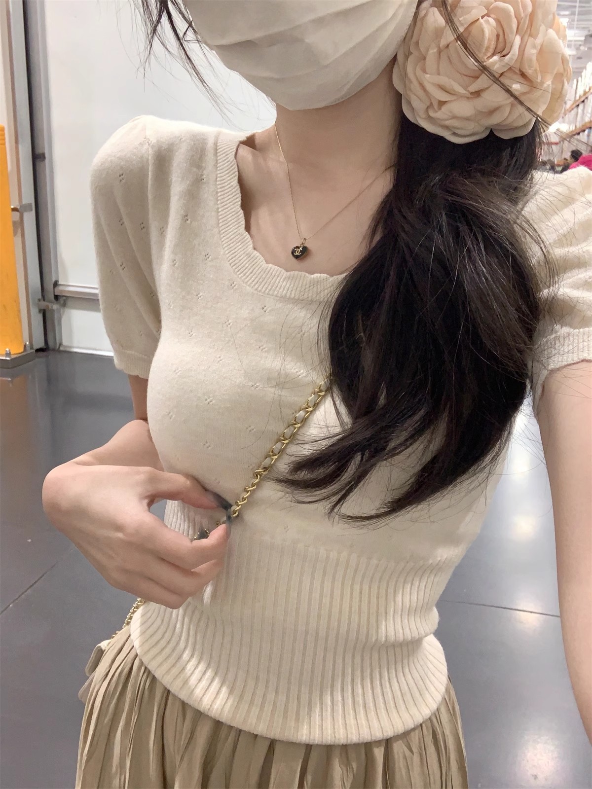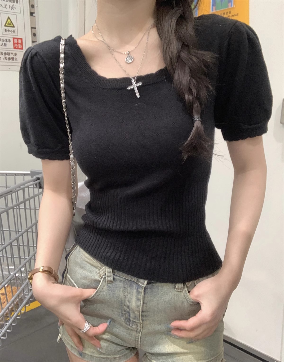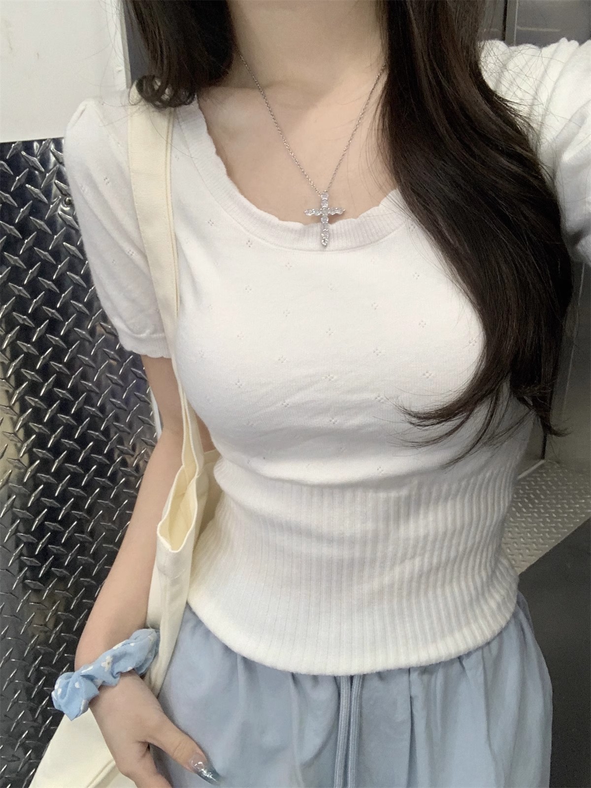 국경 도매 여름 한국 스타일 기질 반팔 니트 스웨터 여성 서양식 달콤하고 핫 슬림 핏 탄성 슬림 핏 이너 탑스토어 가기