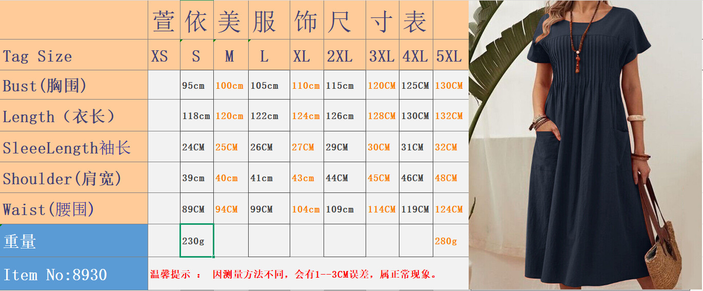 2025 국경 아마존 유럽과 미국 여성 원피스 새로운 단색 둥근 목 주름 짧은 소매면 및 린넨 원피스스토어 가기