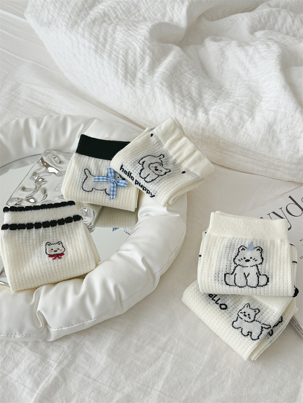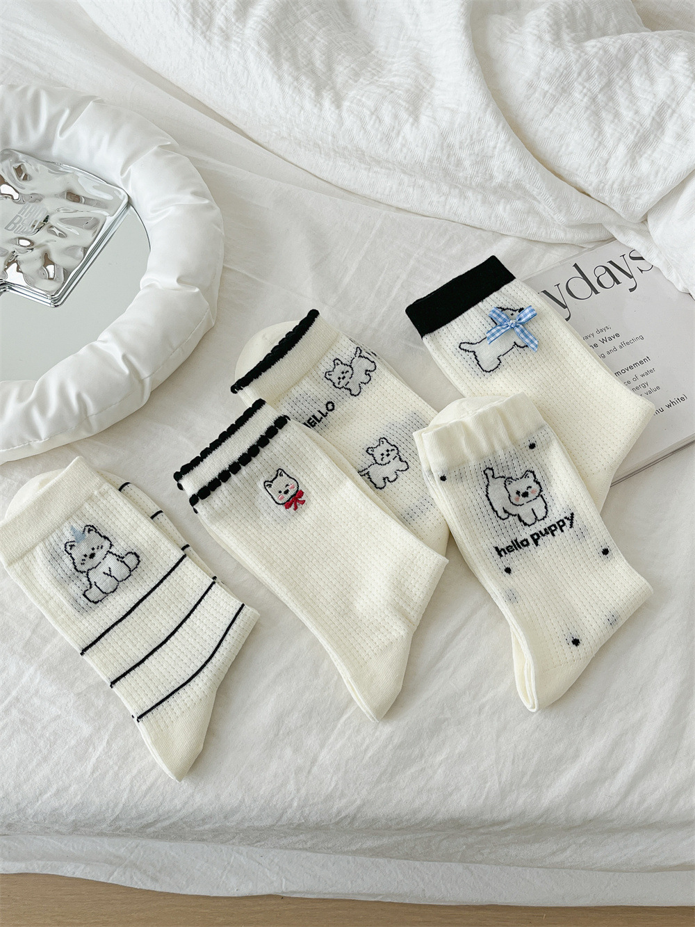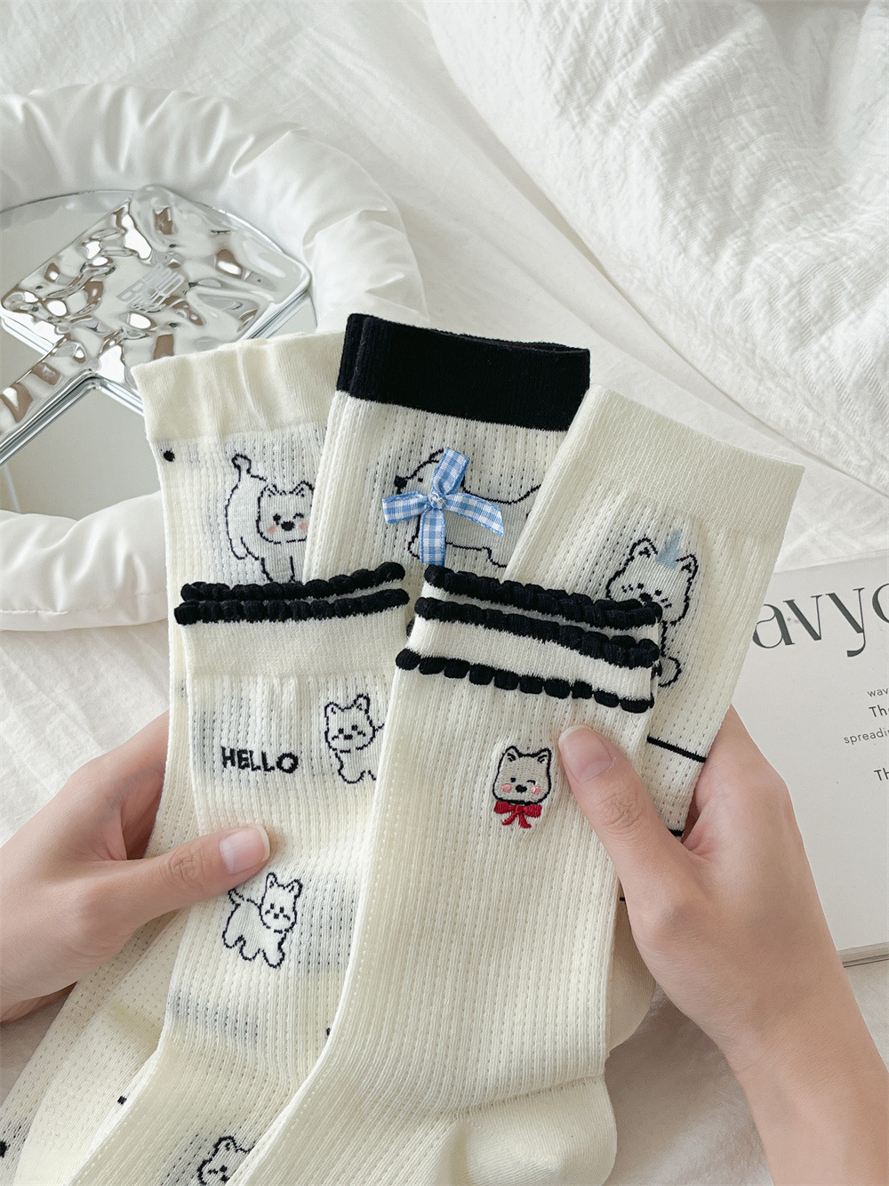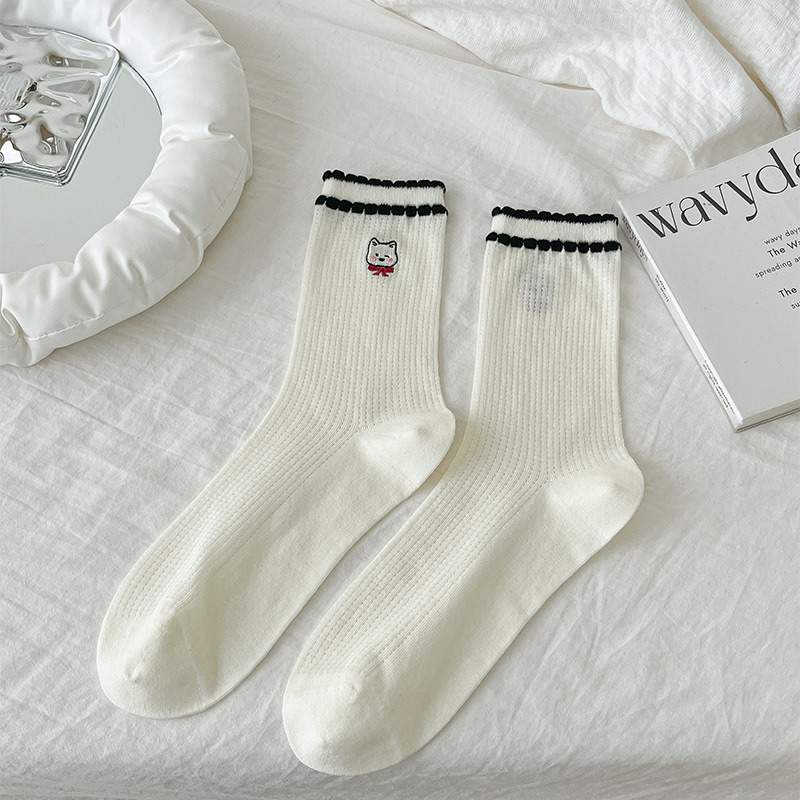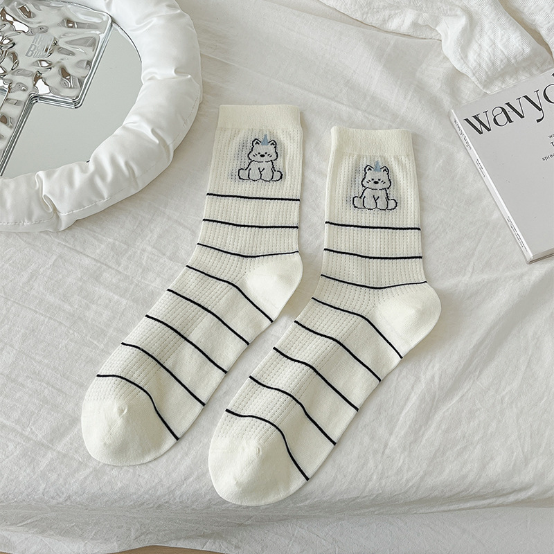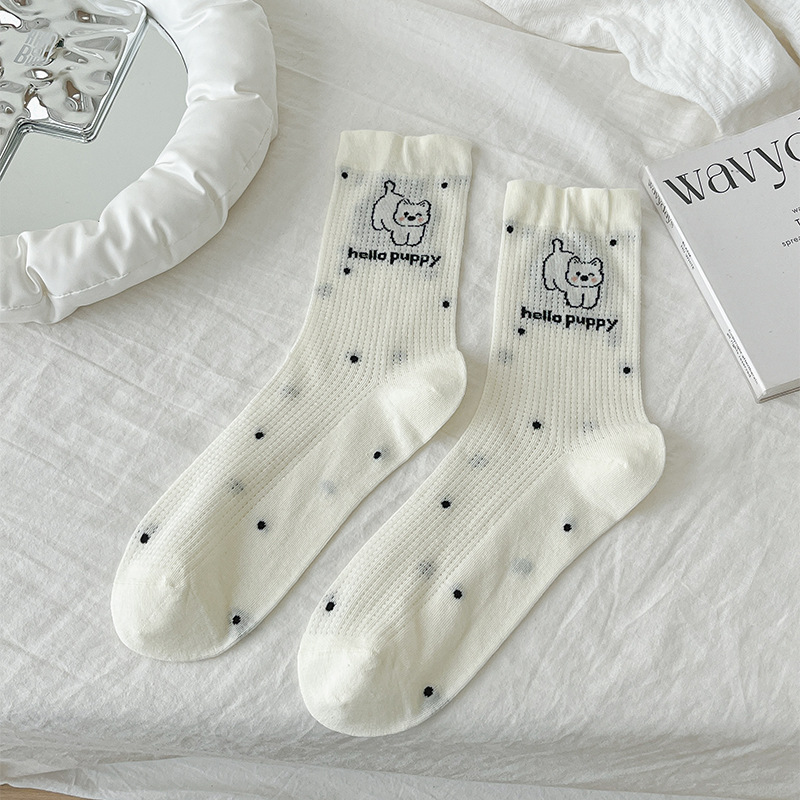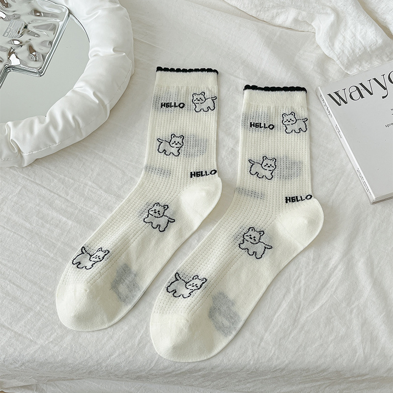 뼈없는 흰색 강아지 그물 양말 여성의 중간 길이 양말 Ins 트렌디 한 활 봄과 여름 얇은 만화 귀여운 스타킹스토어 가기