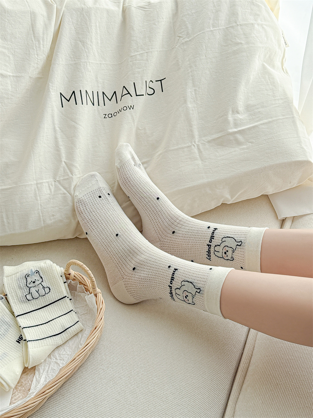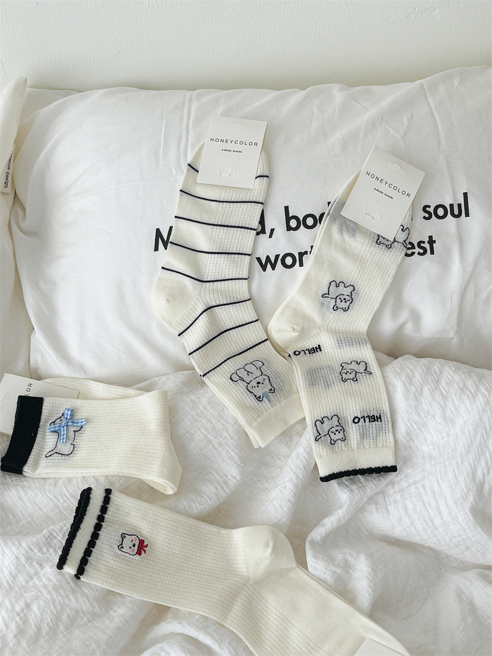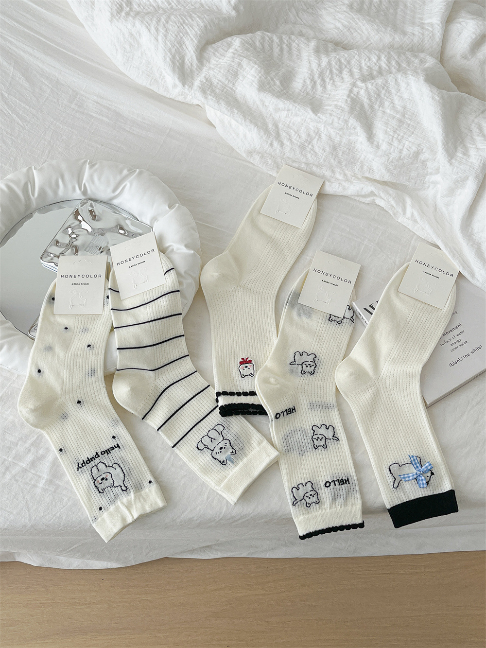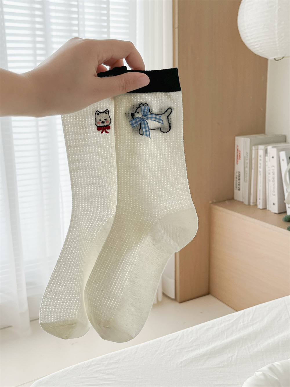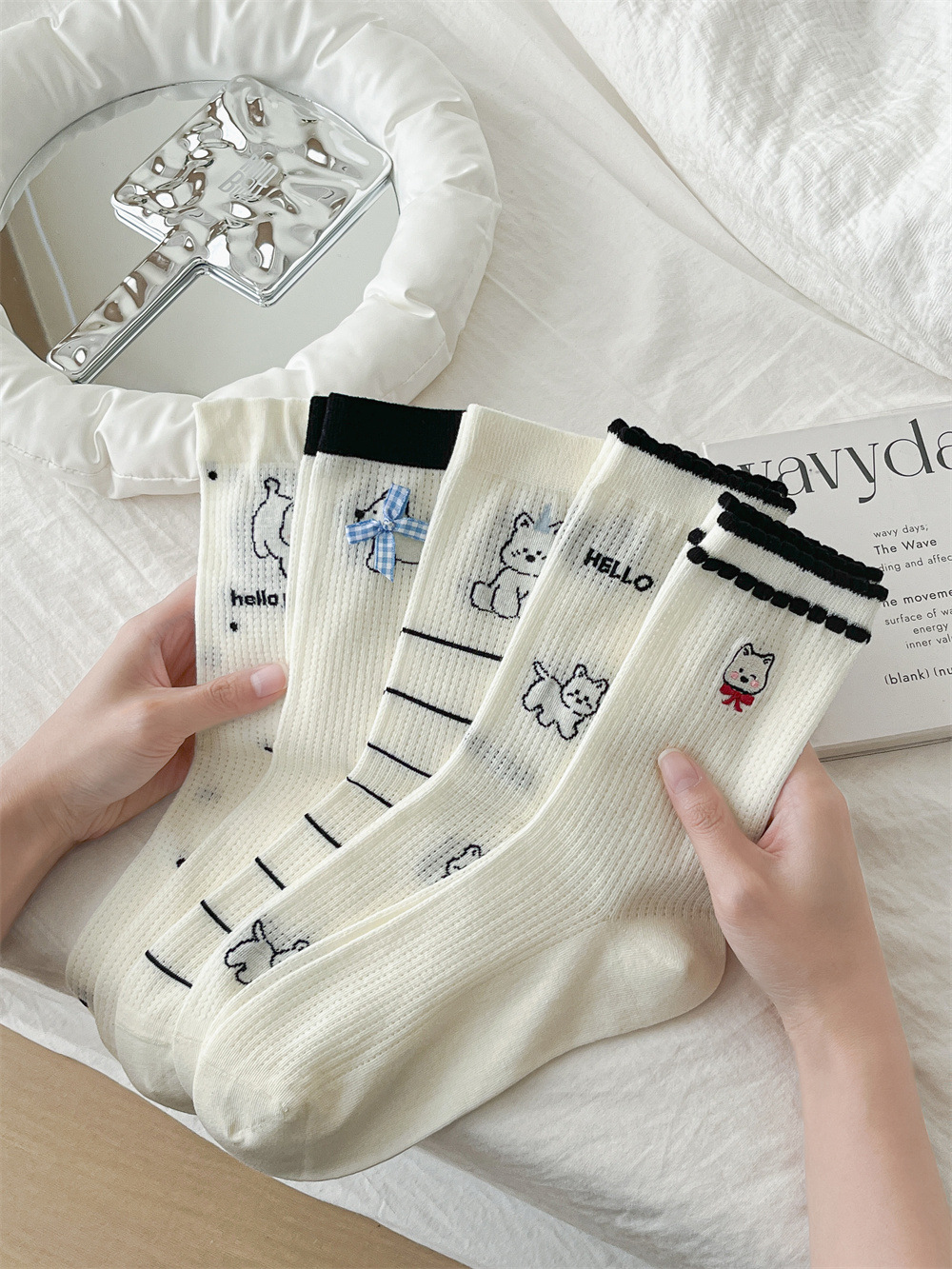 뼈없는 흰색 강아지 그물 양말 여성의 중간 길이 양말 Ins 트렌디 한 활 봄과 여름 얇은 만화 귀여운 스타킹스토어 가기