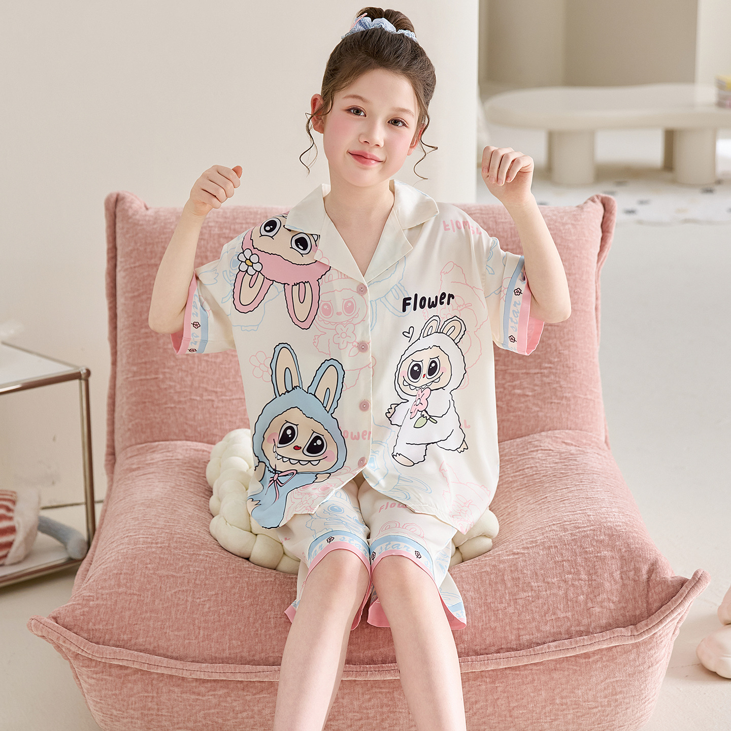 새로운 어린이 아이스 실크 잠옷 소녀 여름 반팔 얇은 귀여운 홈 옷 아기의 큰 어린이 소녀 세트