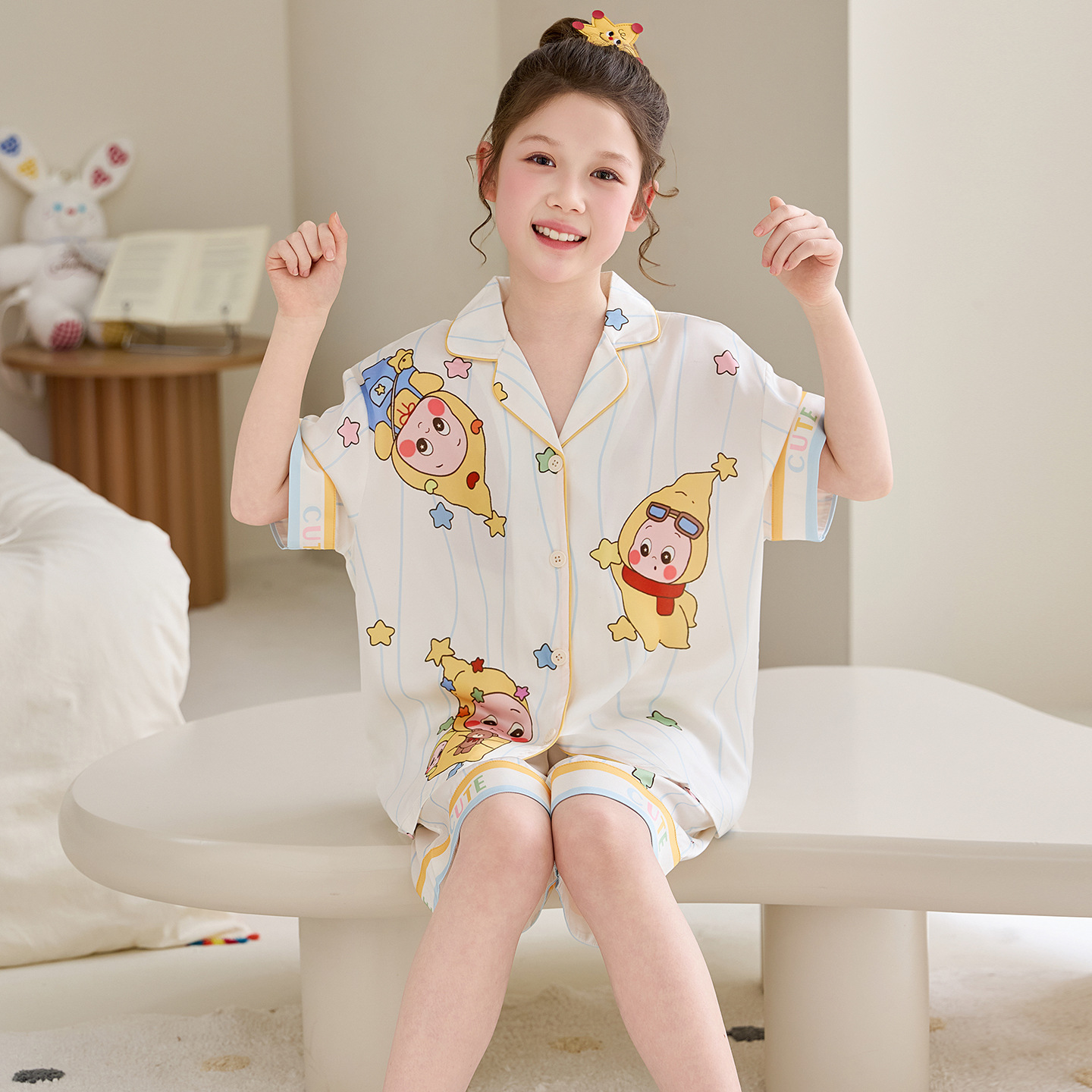 새로운 어린이 아이스 실크 잠옷 소녀 여름 반팔 얇은 귀여운 홈 옷 아기의 큰 어린이 소녀 세트스토어 가기