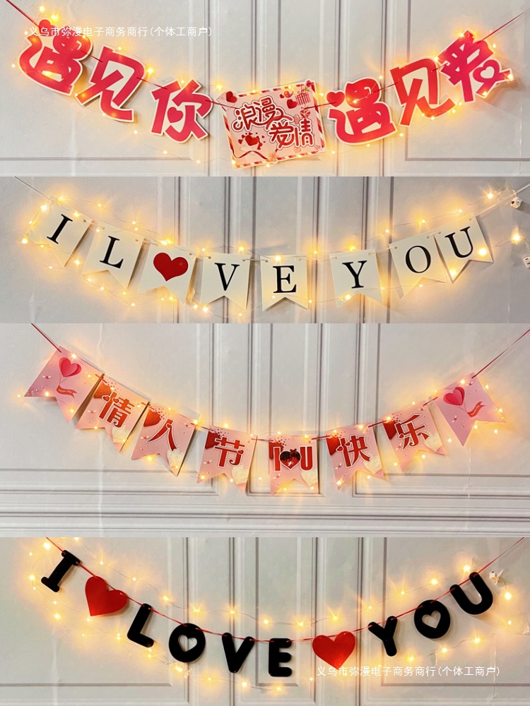 • 핑크 해피 발렌타인 데이 플래그*1+ 3m 따뜻한 흰색 구리 와이어 조명*2