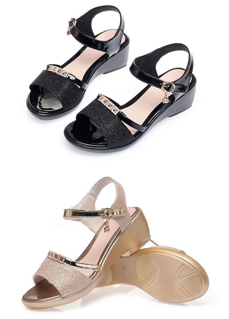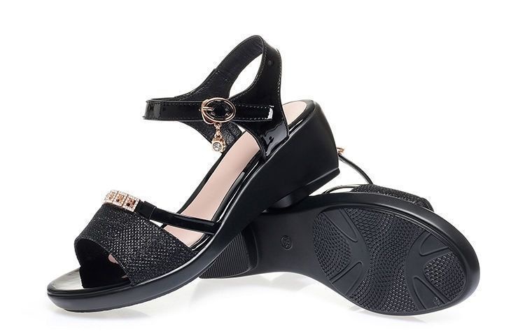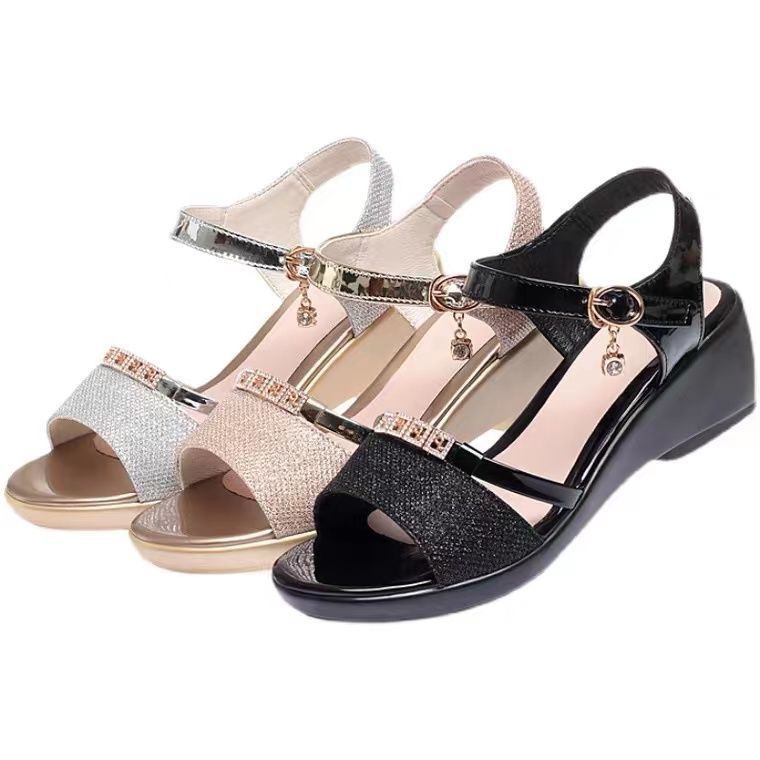 2025 여름 새로운 오픈 발가락 여성 신발 미드 힐 패션 샌들 여성용 웨지 플러스 사이즈 버클 라인스톤 버클스토어 가기