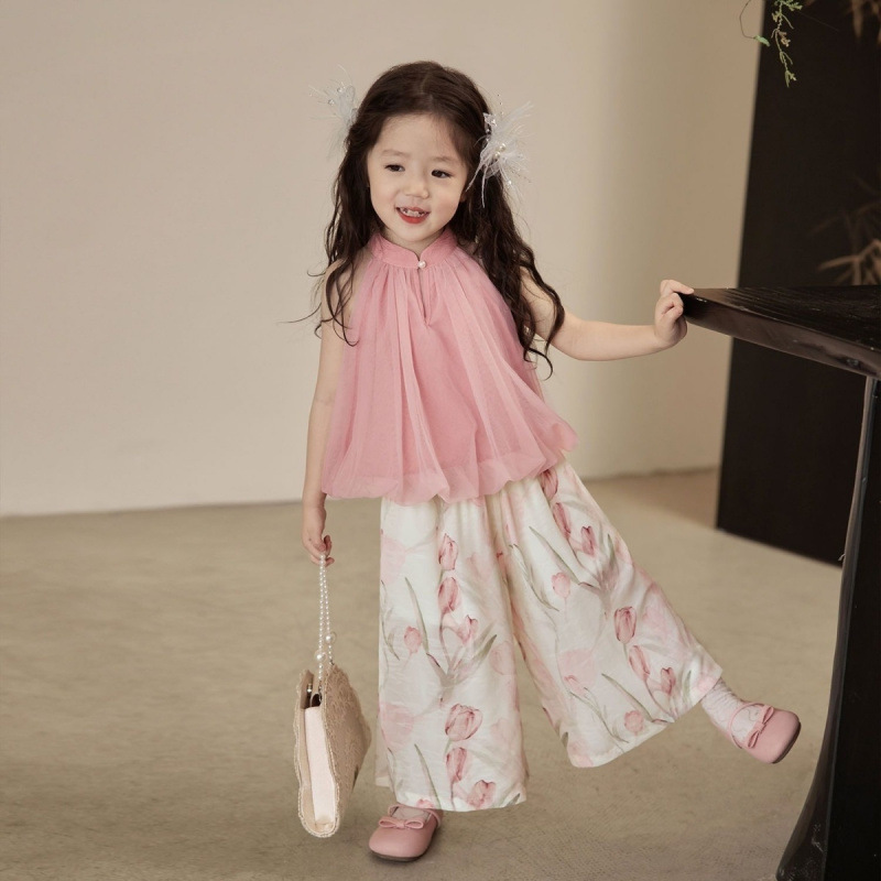 소녀 여름 세트 2025 새로운 도착 중국 스타일 민소매 메쉬 조끼 꽃