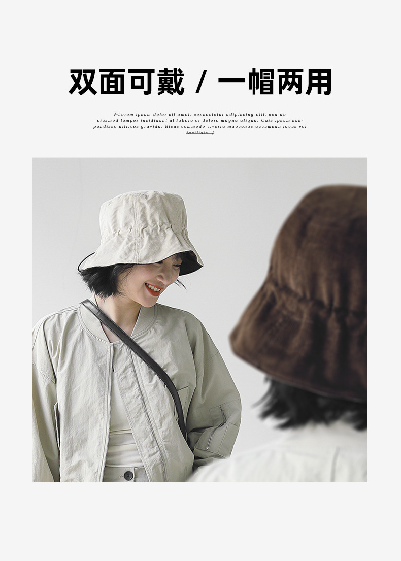 双面戴日系纯色女秋冬显脸小复古文艺百搭盆帽大头围灯芯绒渔夫帽