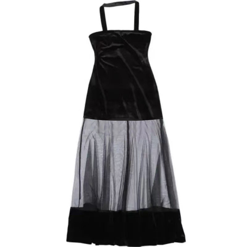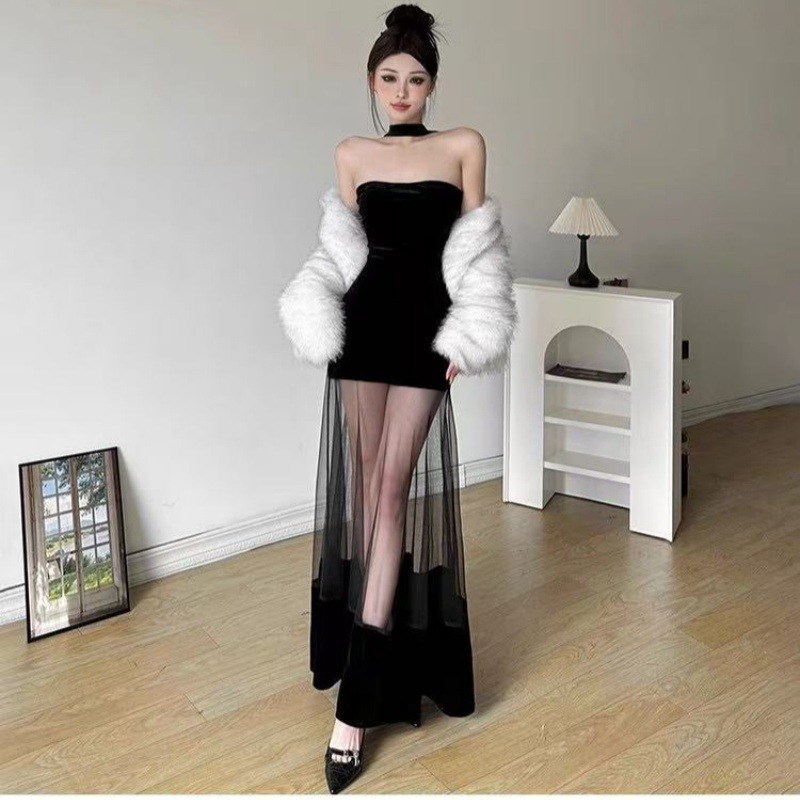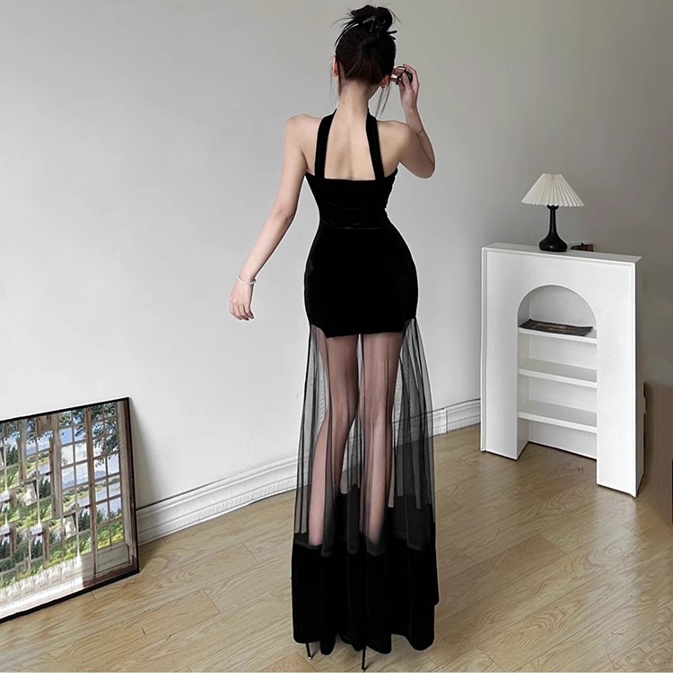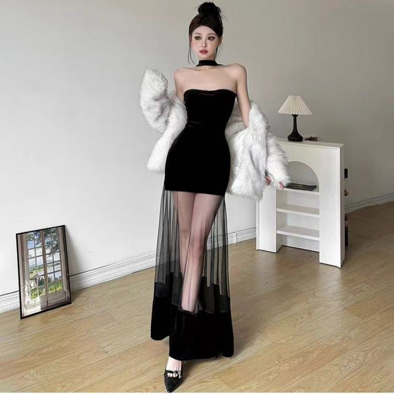 새로운 스파이스 소녀 메쉬 디자인 센스 솔리드 컬러 벨벳 원피스 여성의 순수한 욕망 생일 파티 원피스 슬리밍 원피스스토어 가기