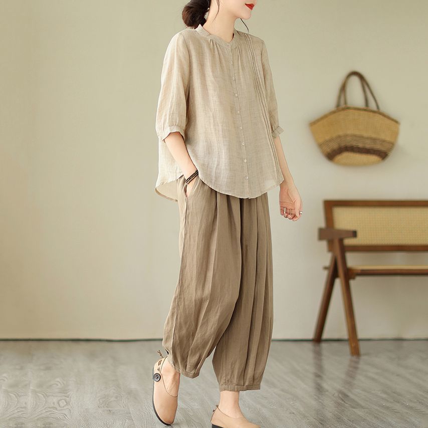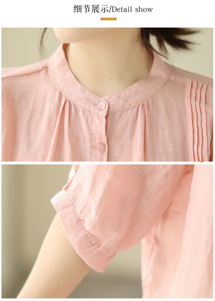 2025 봄과 여름 새로운 느슨한 플러스 사이즈 여성 의류 서양식 면화 및 리넨 라운드 넥 셔츠 여성 어머니 의류 느슨한 슬리밍 탑