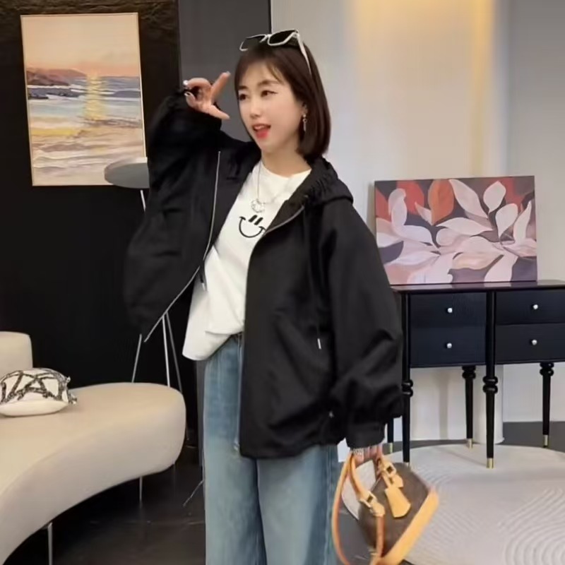 후드가 달린 주름 조커 재킷 여성의 2025 봄 새로운 느슨한 단색 작은 재킷 탑스토어 가기
