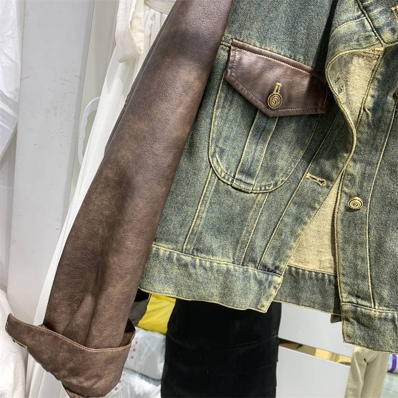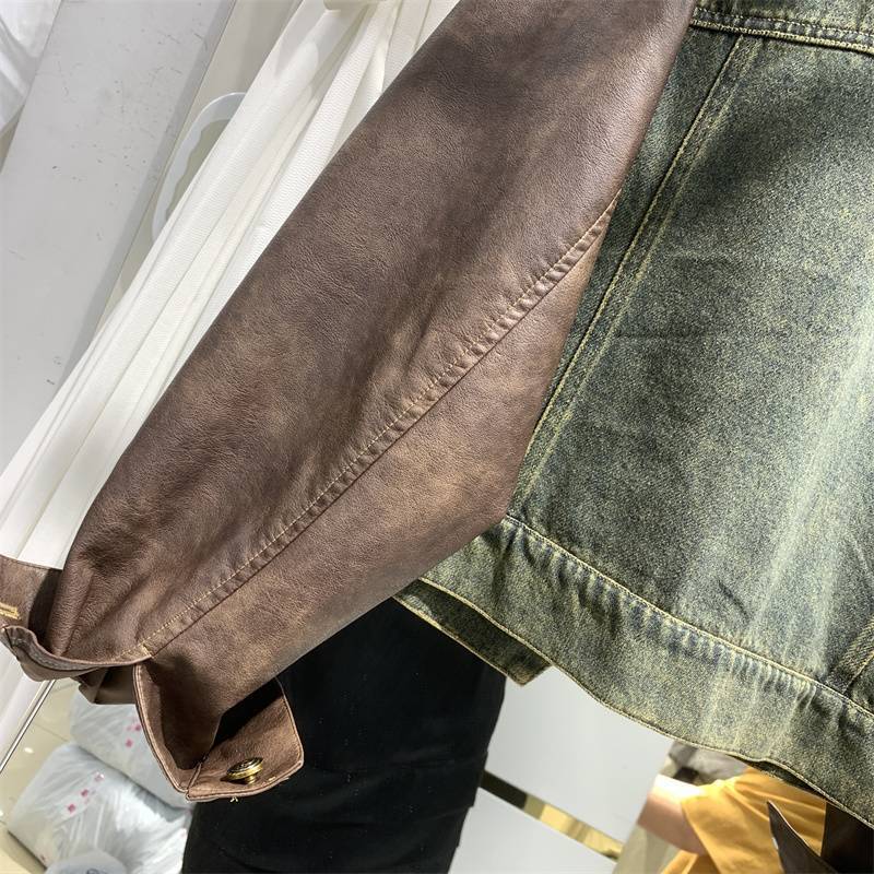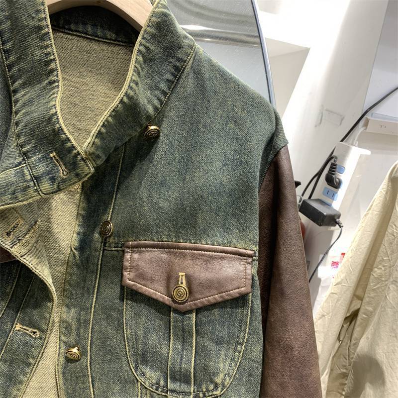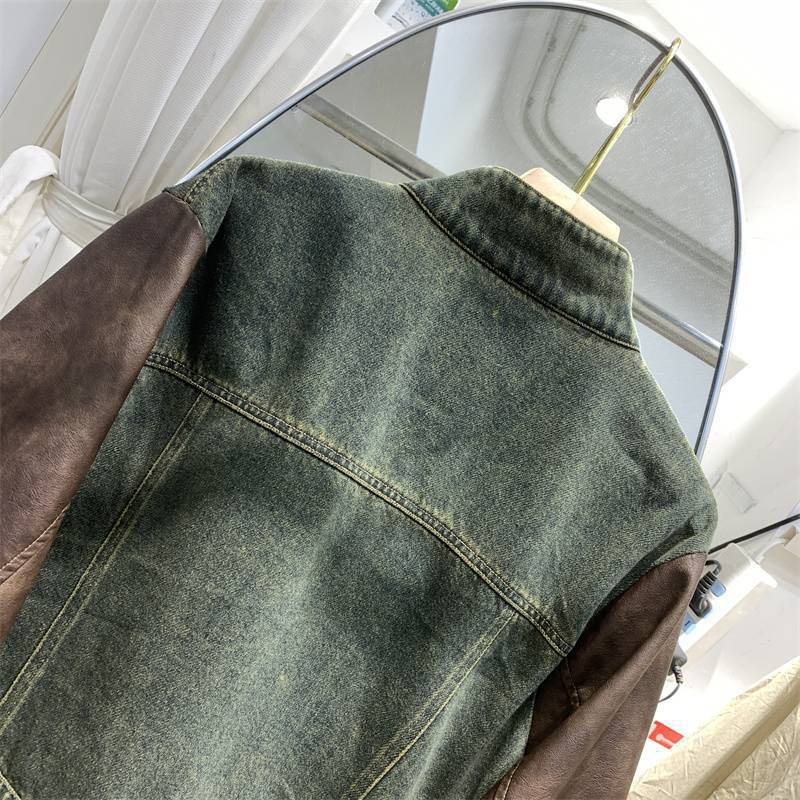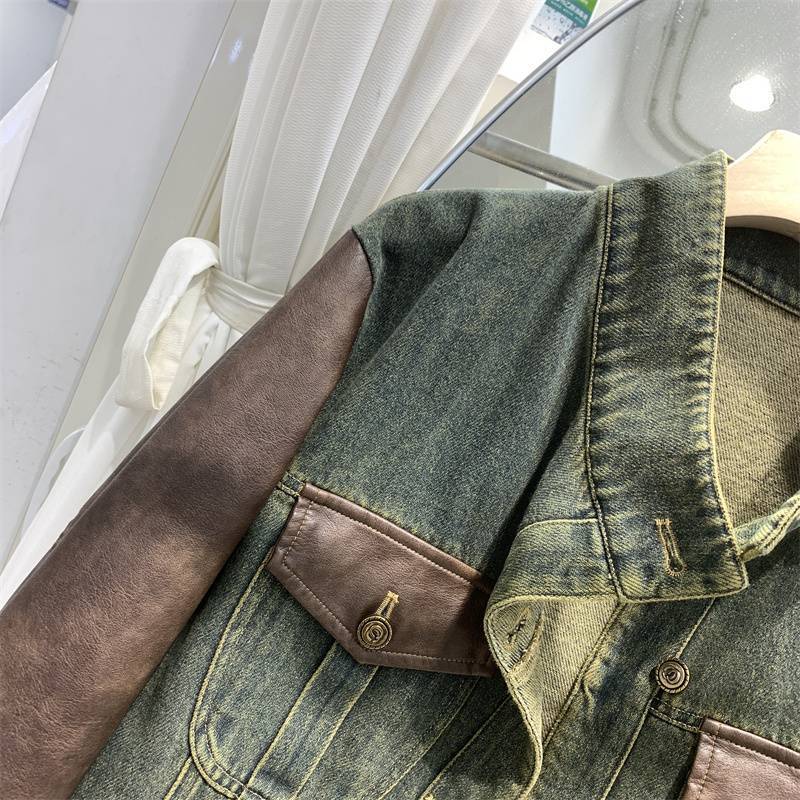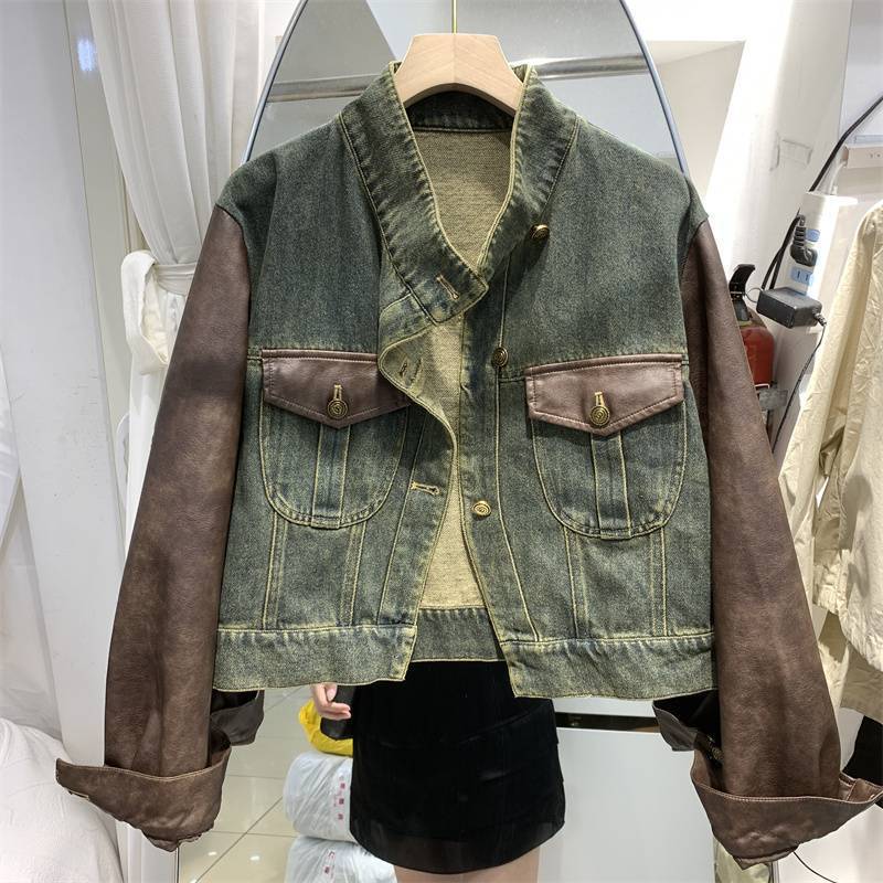 홍콩 스타일의 데님 코트 여성용 PU 가죽 스티칭 재킷 2025 봄 새로운 불규칙한 디자인 가죽 쇼트 탑스토어 가기