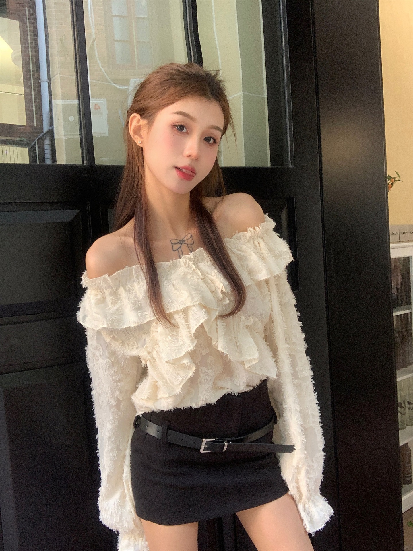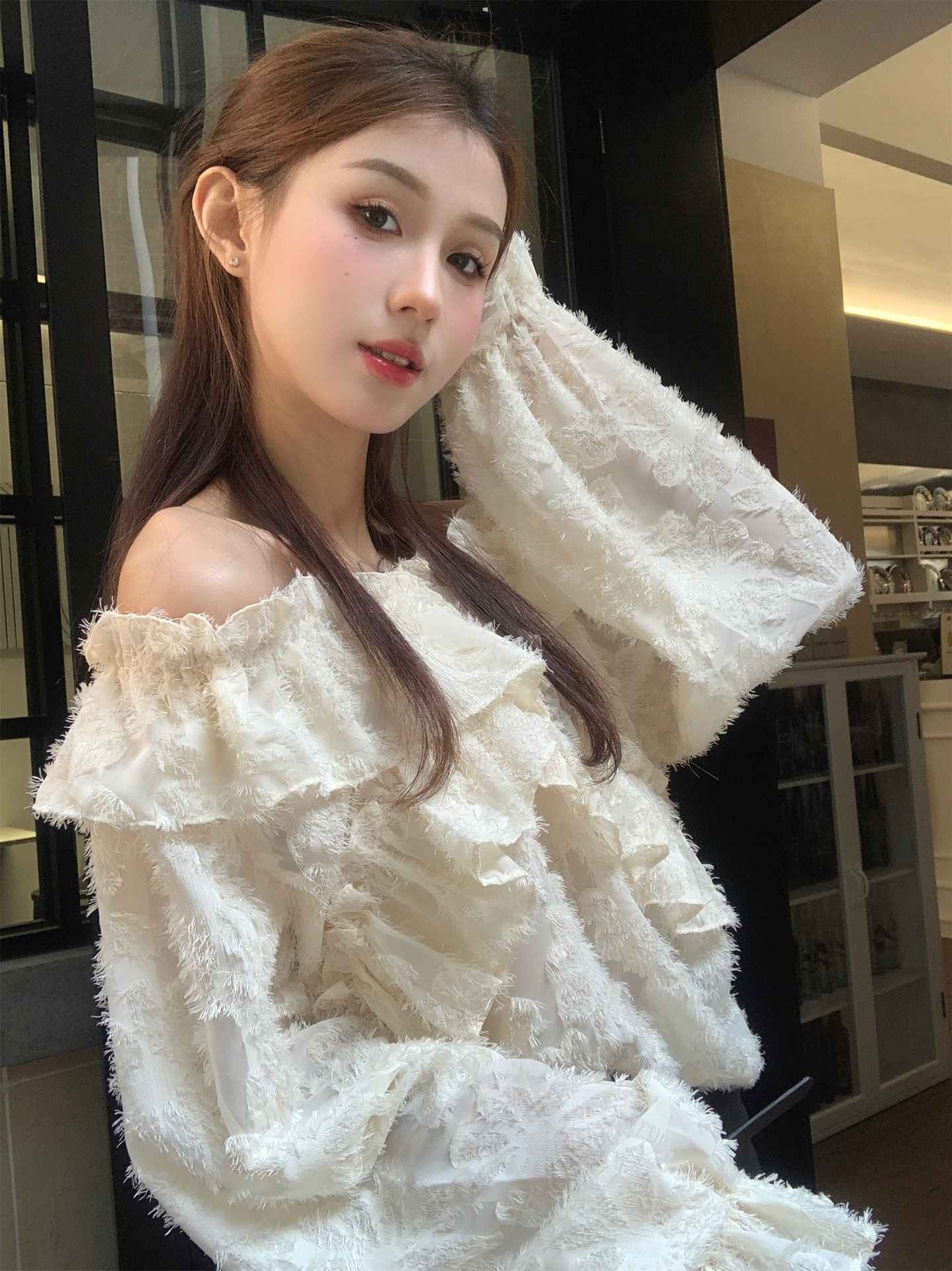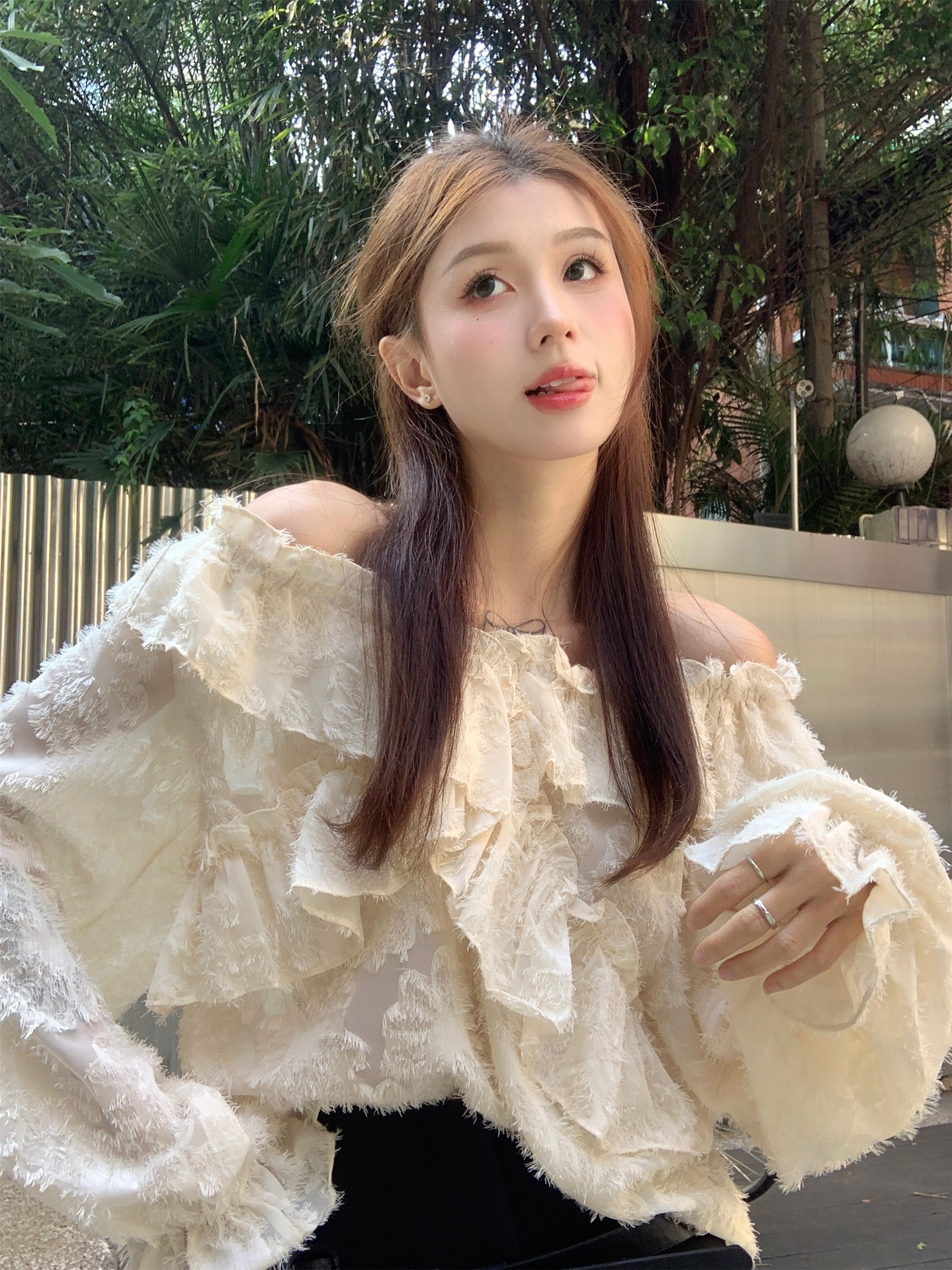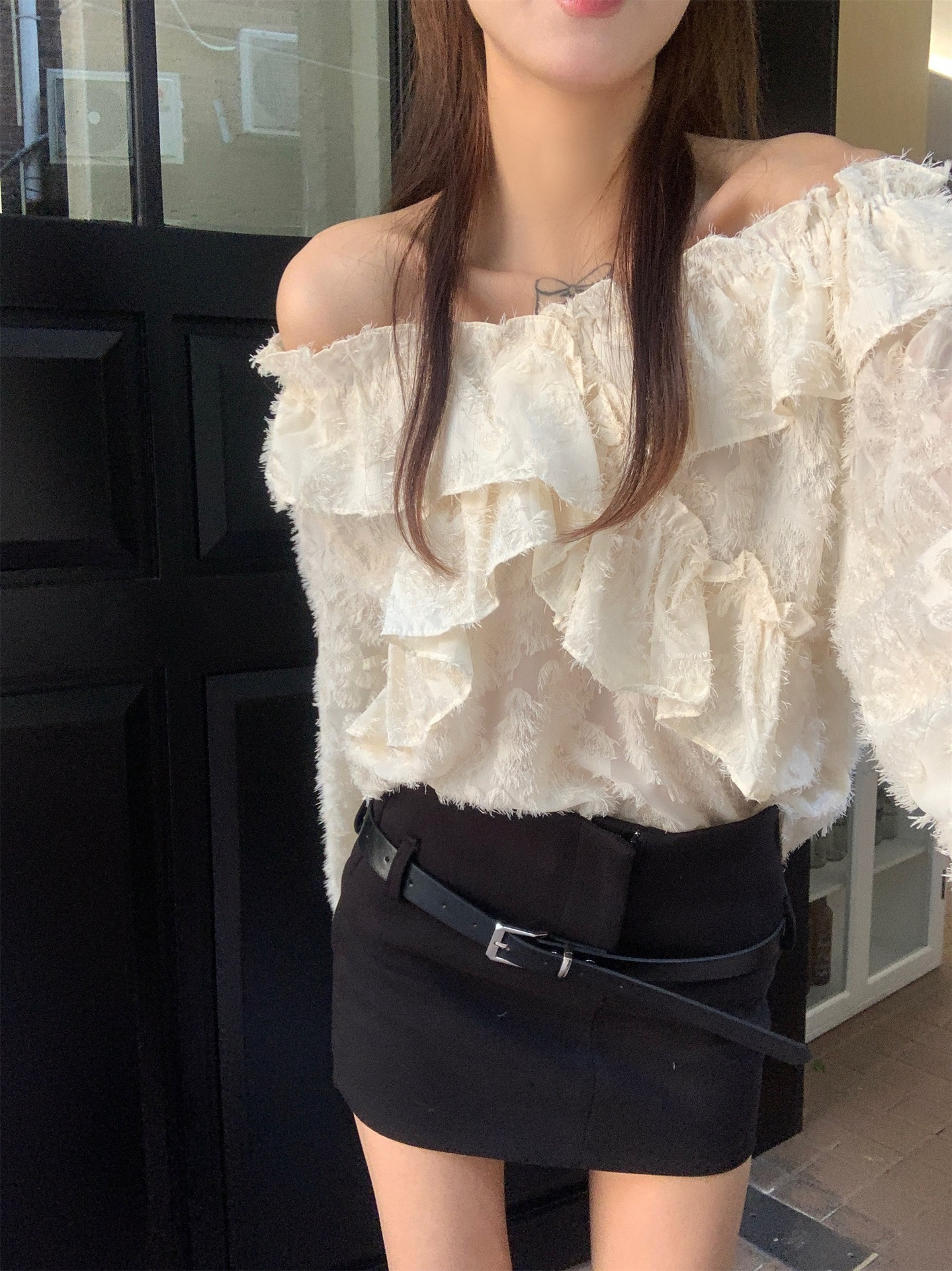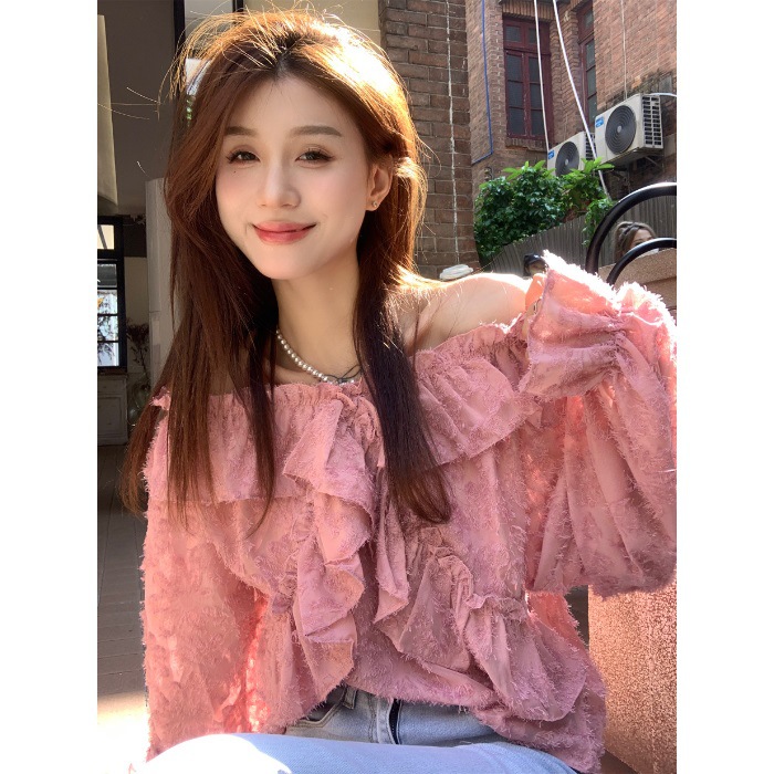 봄과 가을 2025 새로운 부드러운 소녀의 주름진 틈새 쉬폰 셔츠 여성 어깨 디자인 센스 탑스토어 가기