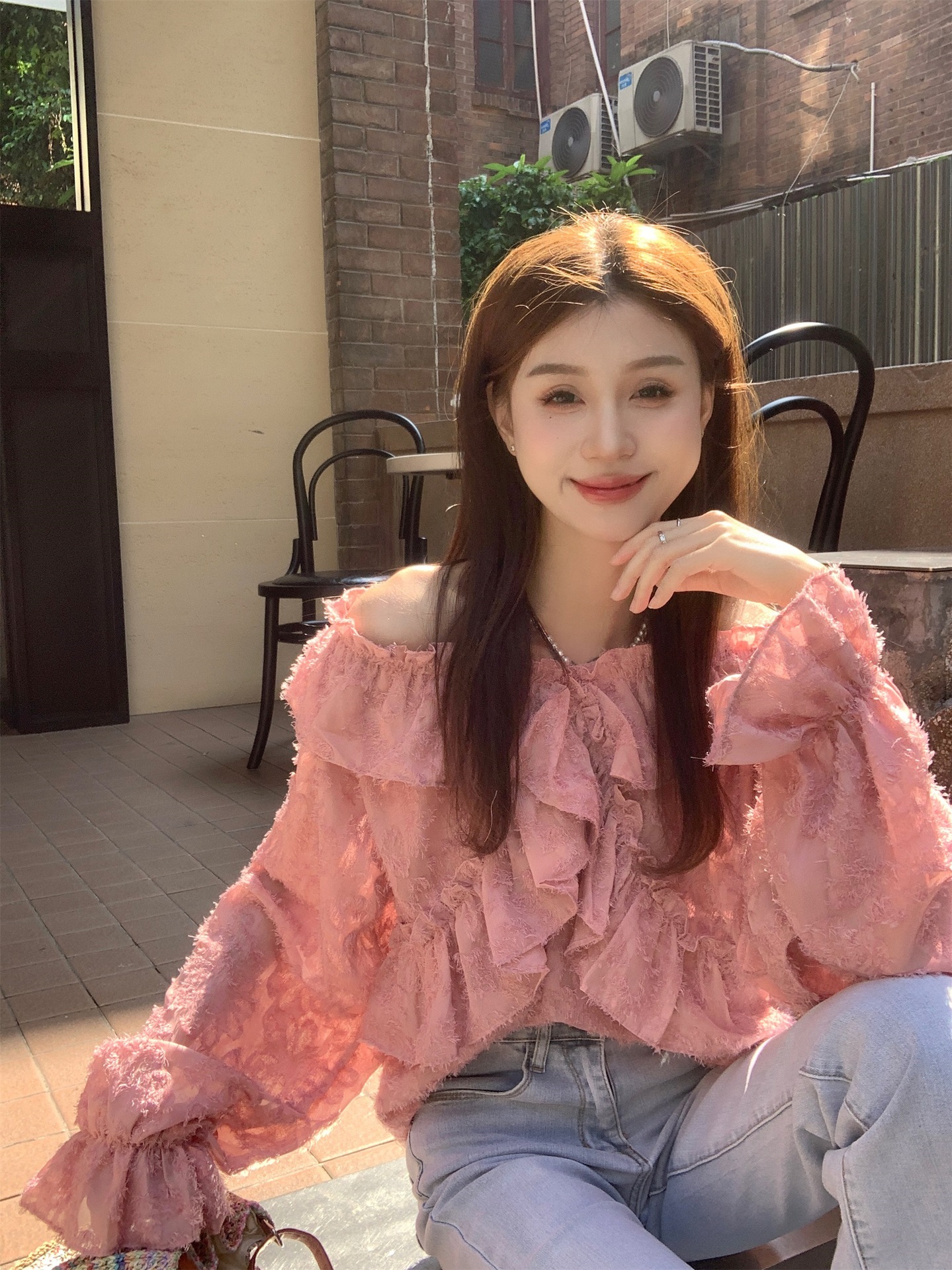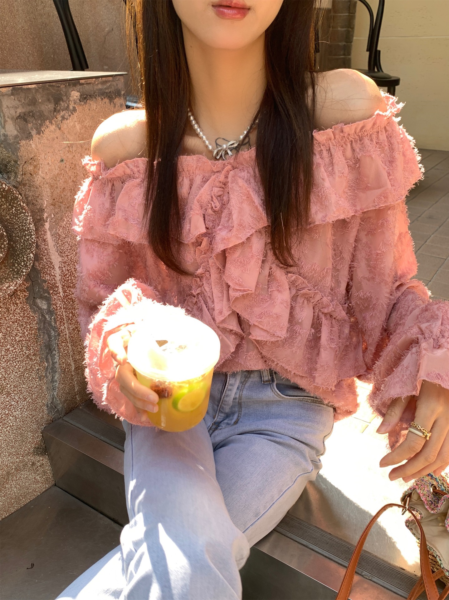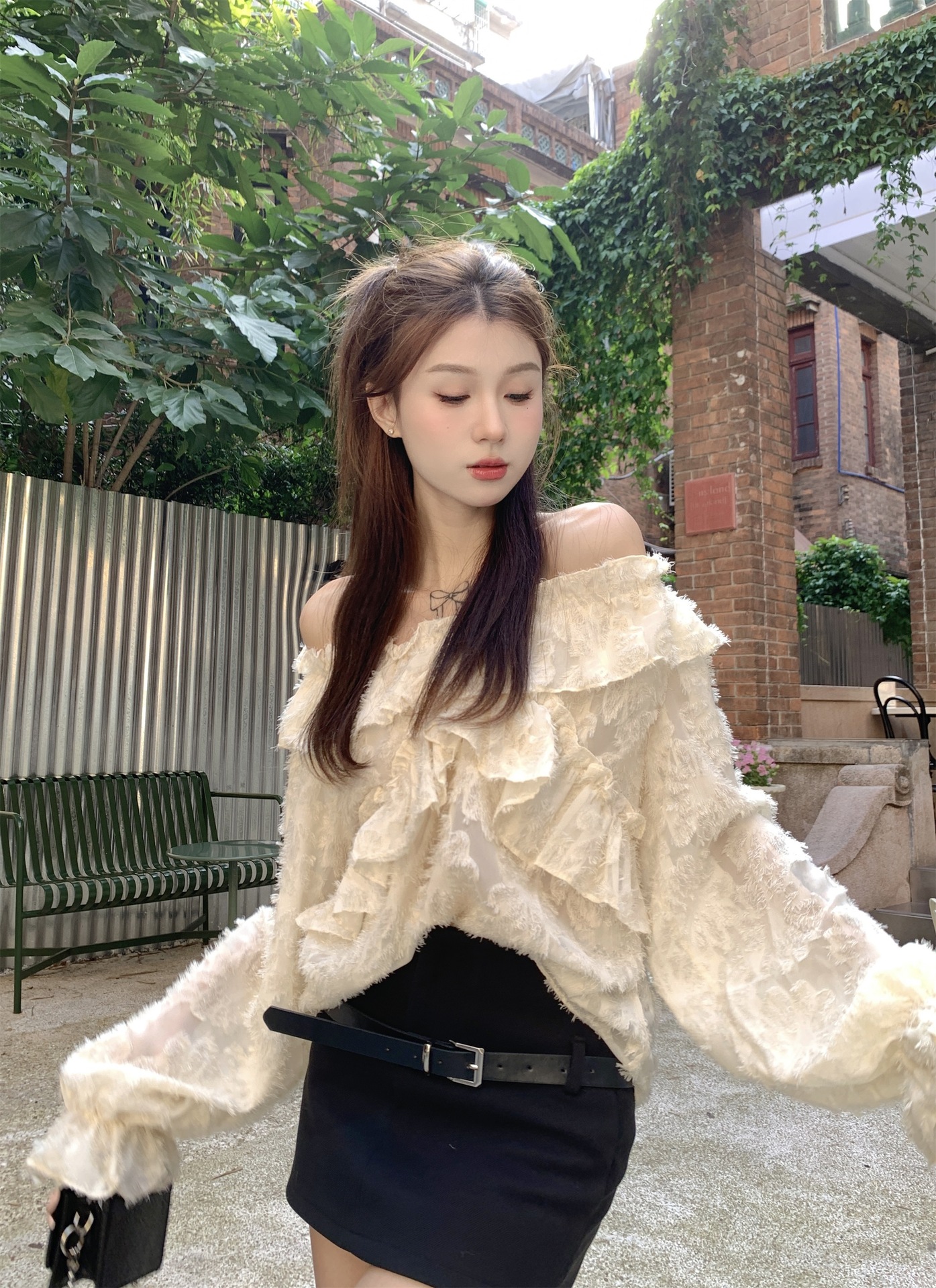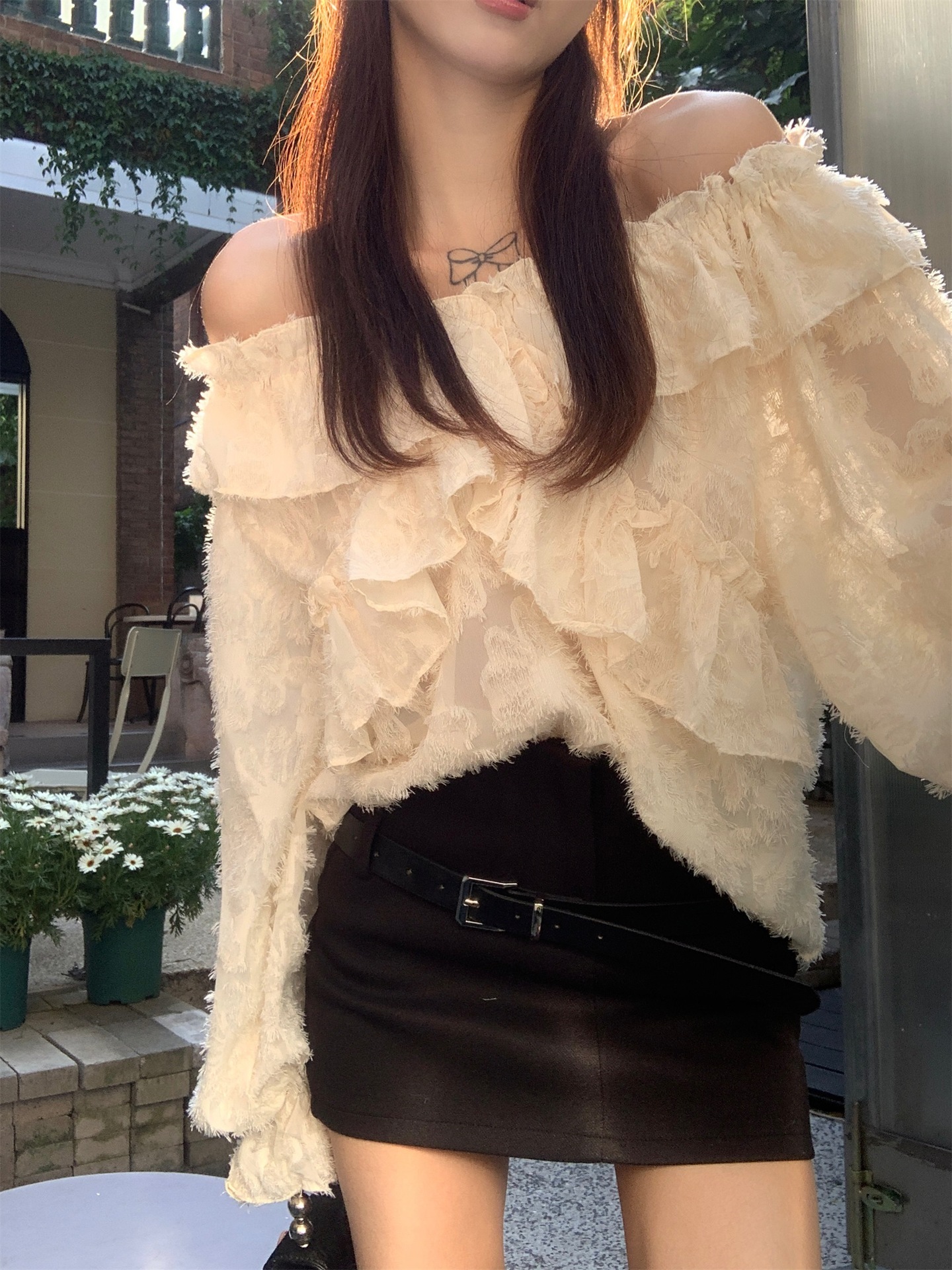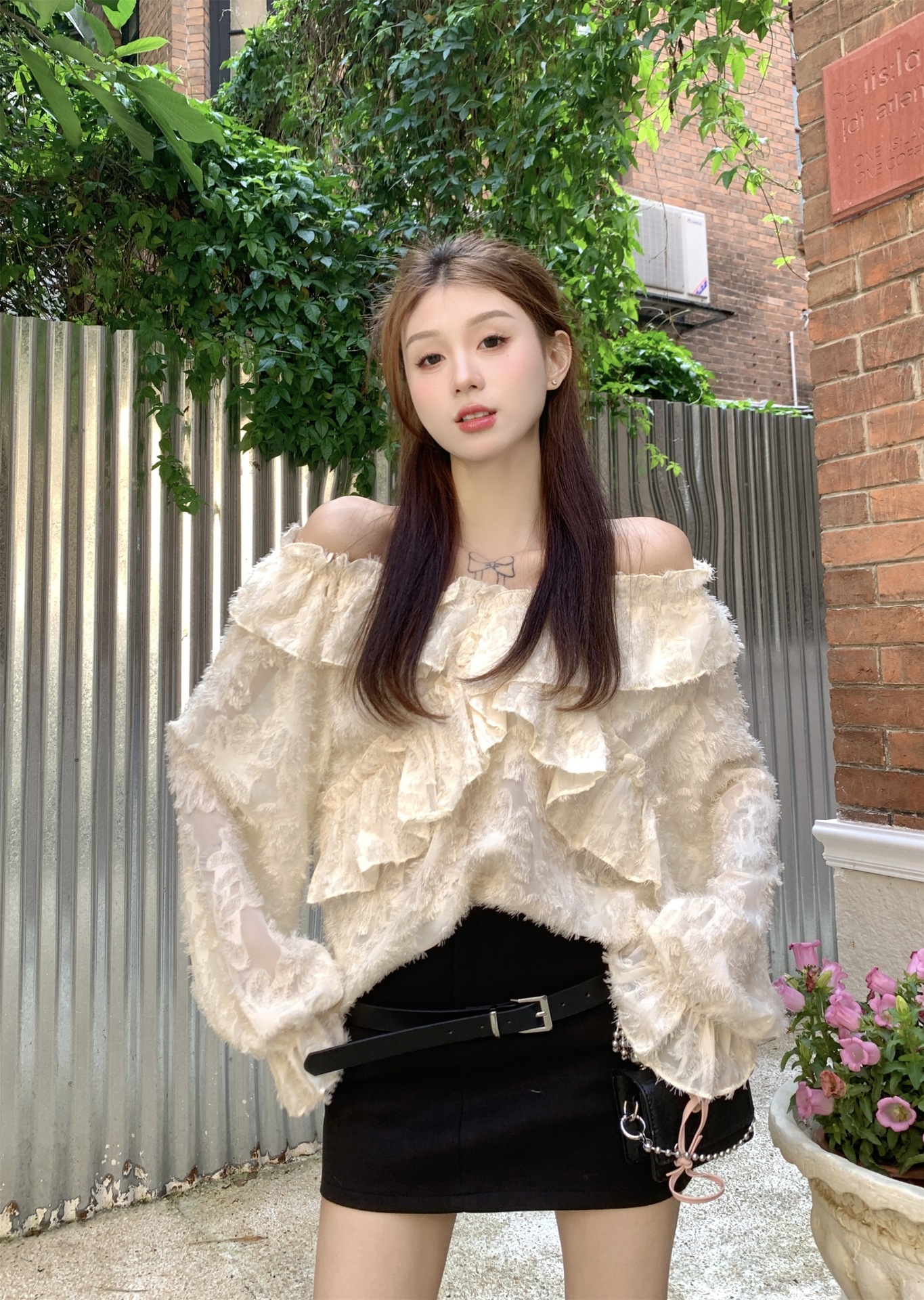 봄과 가을 2025 새로운 부드러운 소녀의 주름진 틈새 쉬폰 셔츠 여성 어깨 디자인 센스 탑스토어 가기