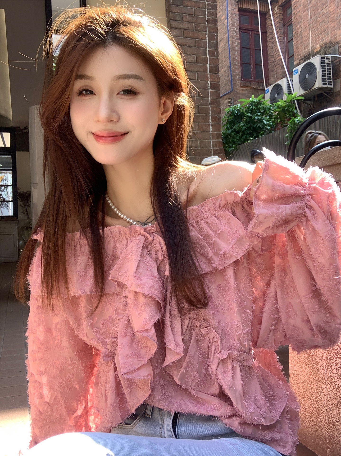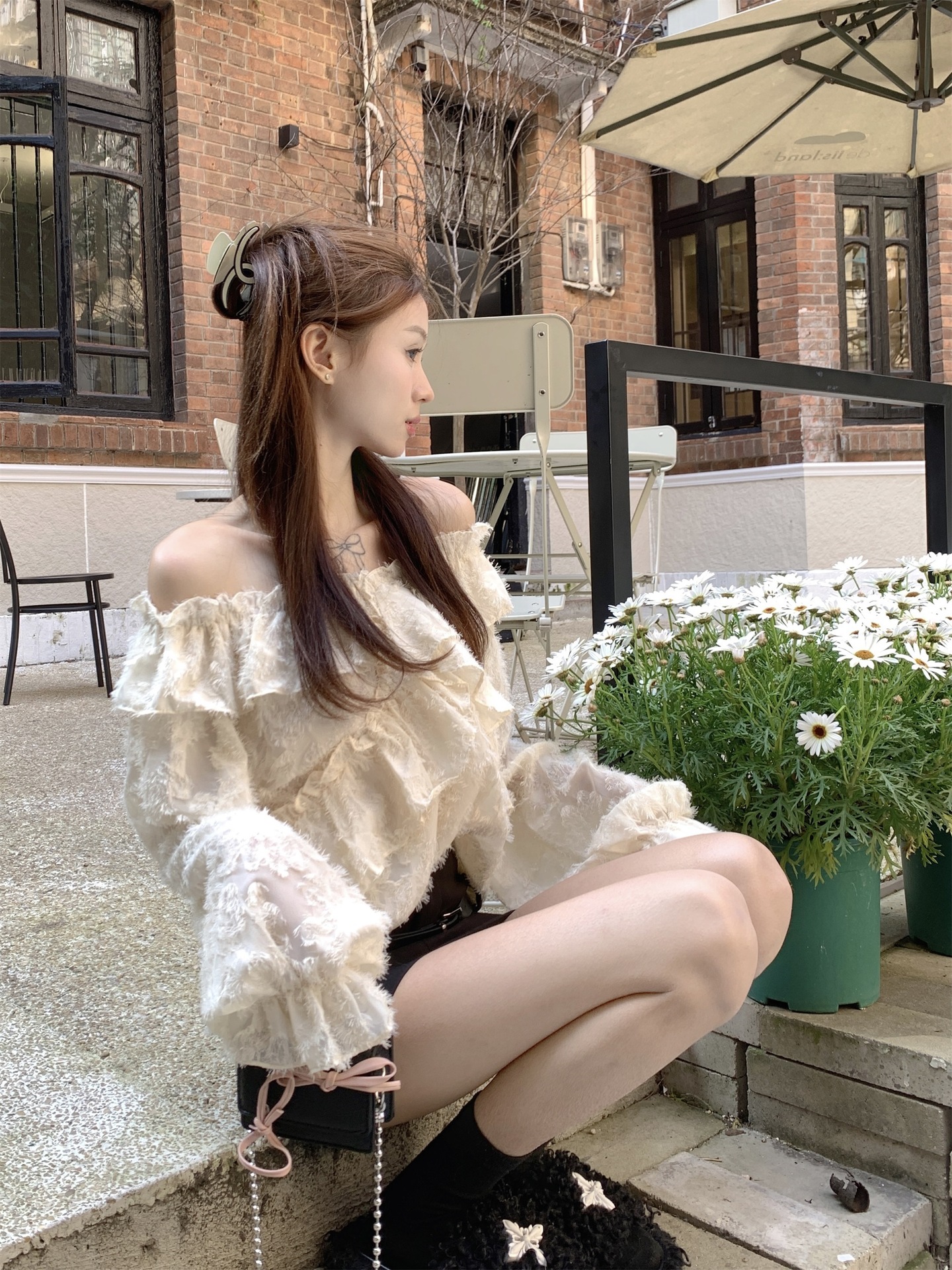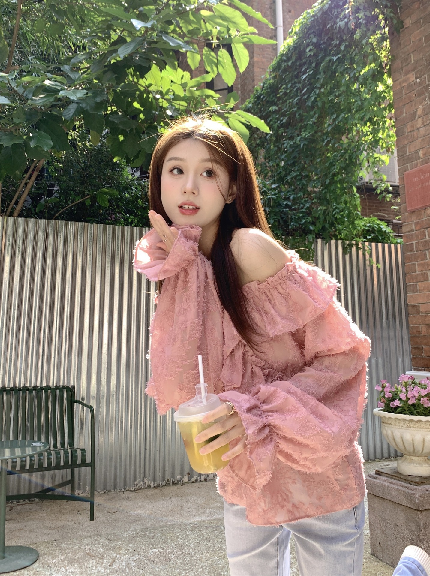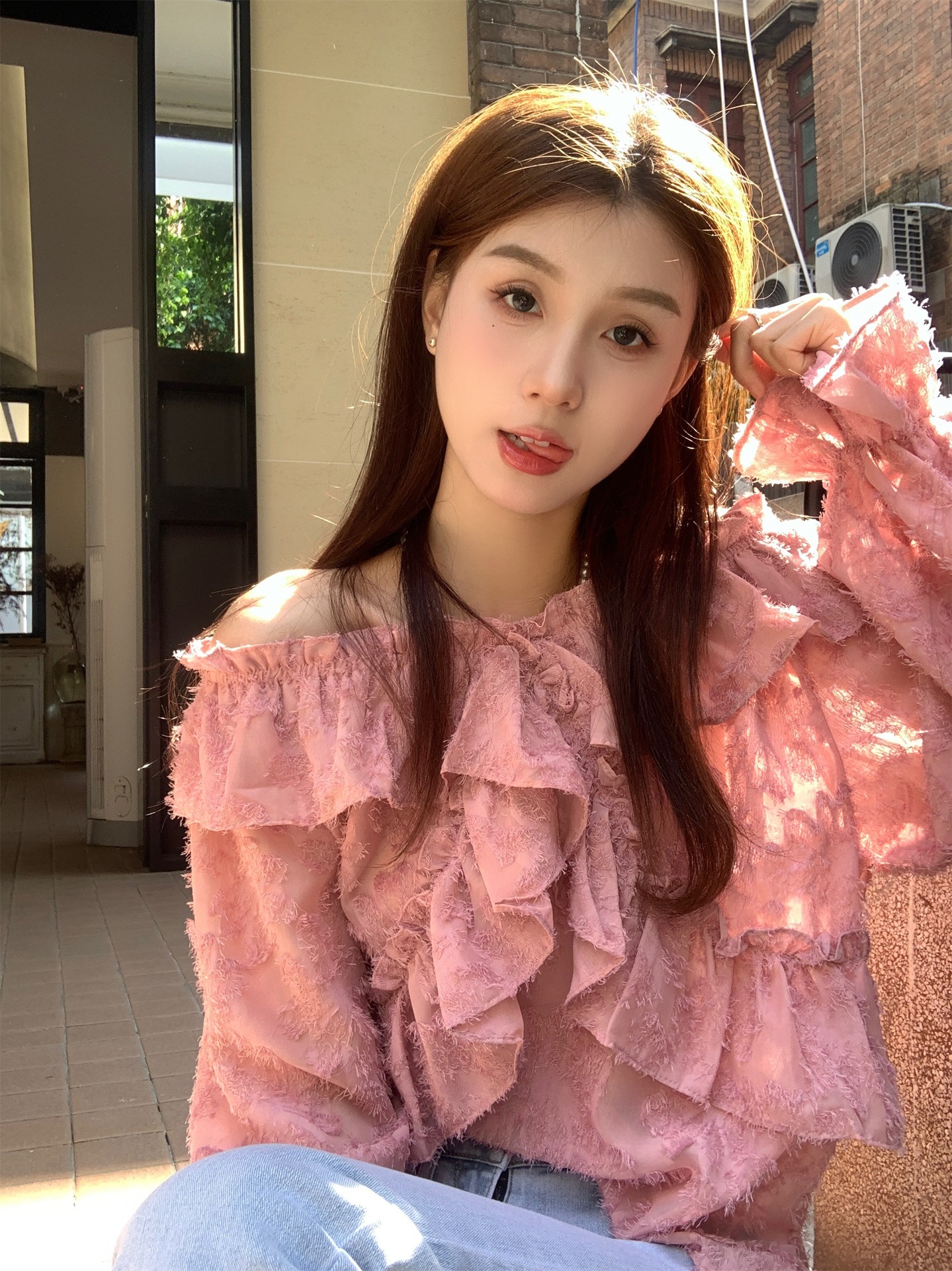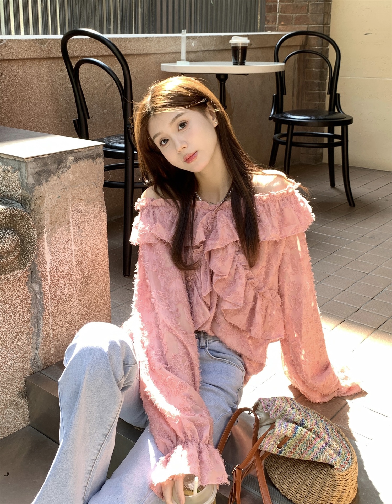 봄과 가을 2025 새로운 부드러운 소녀의 주름진 틈새 쉬폰 셔츠 여성 어깨 디자인 센스 탑스토어 가기