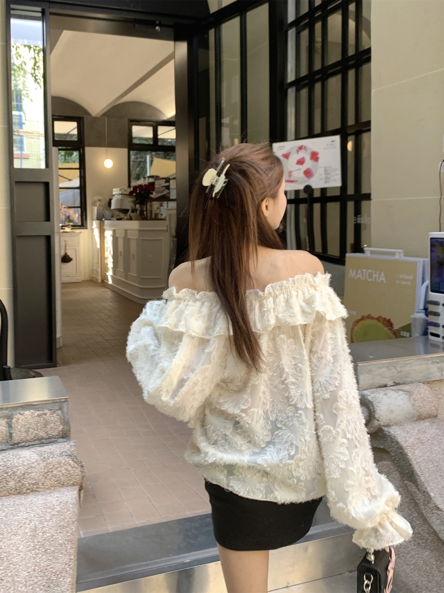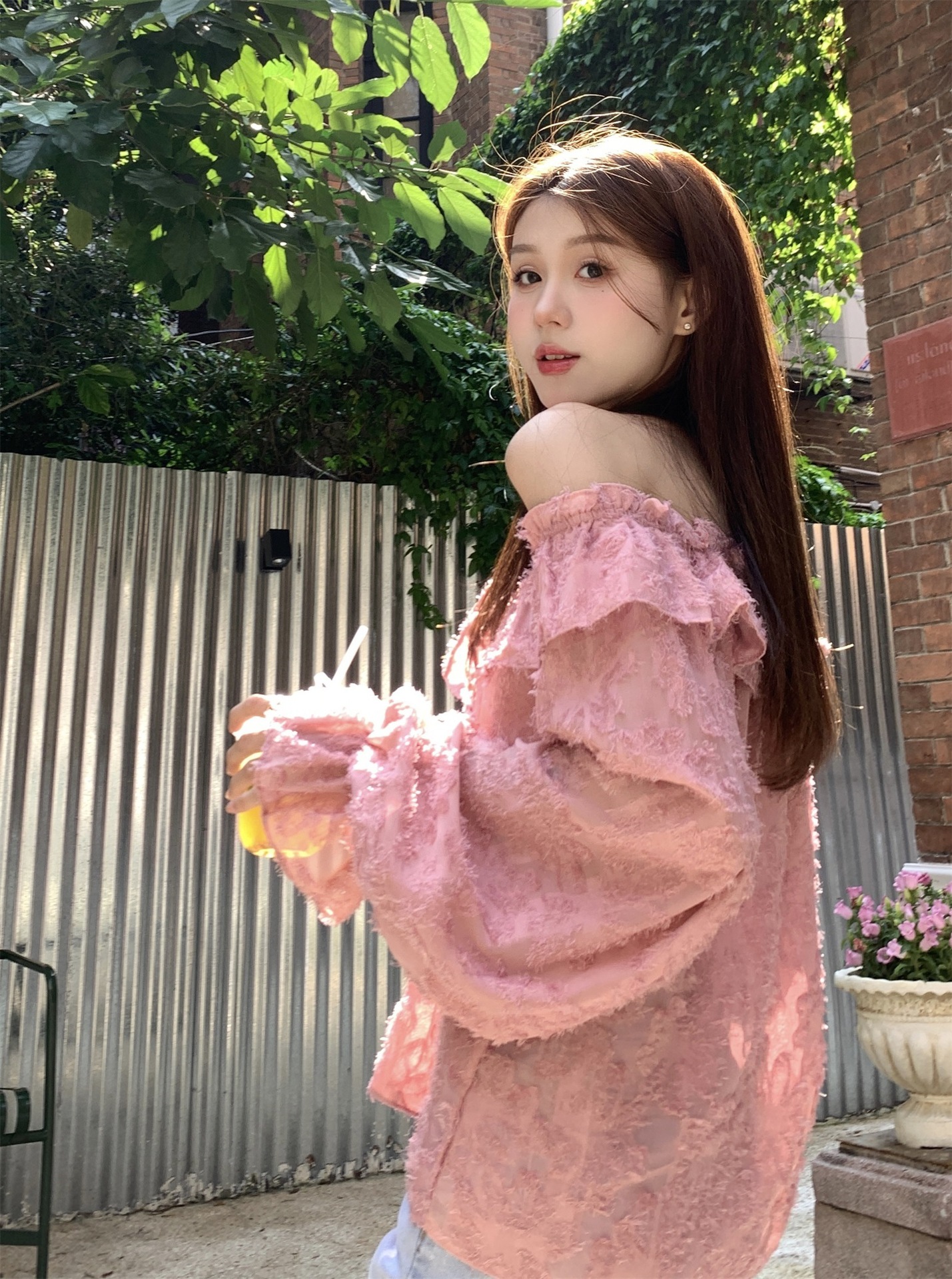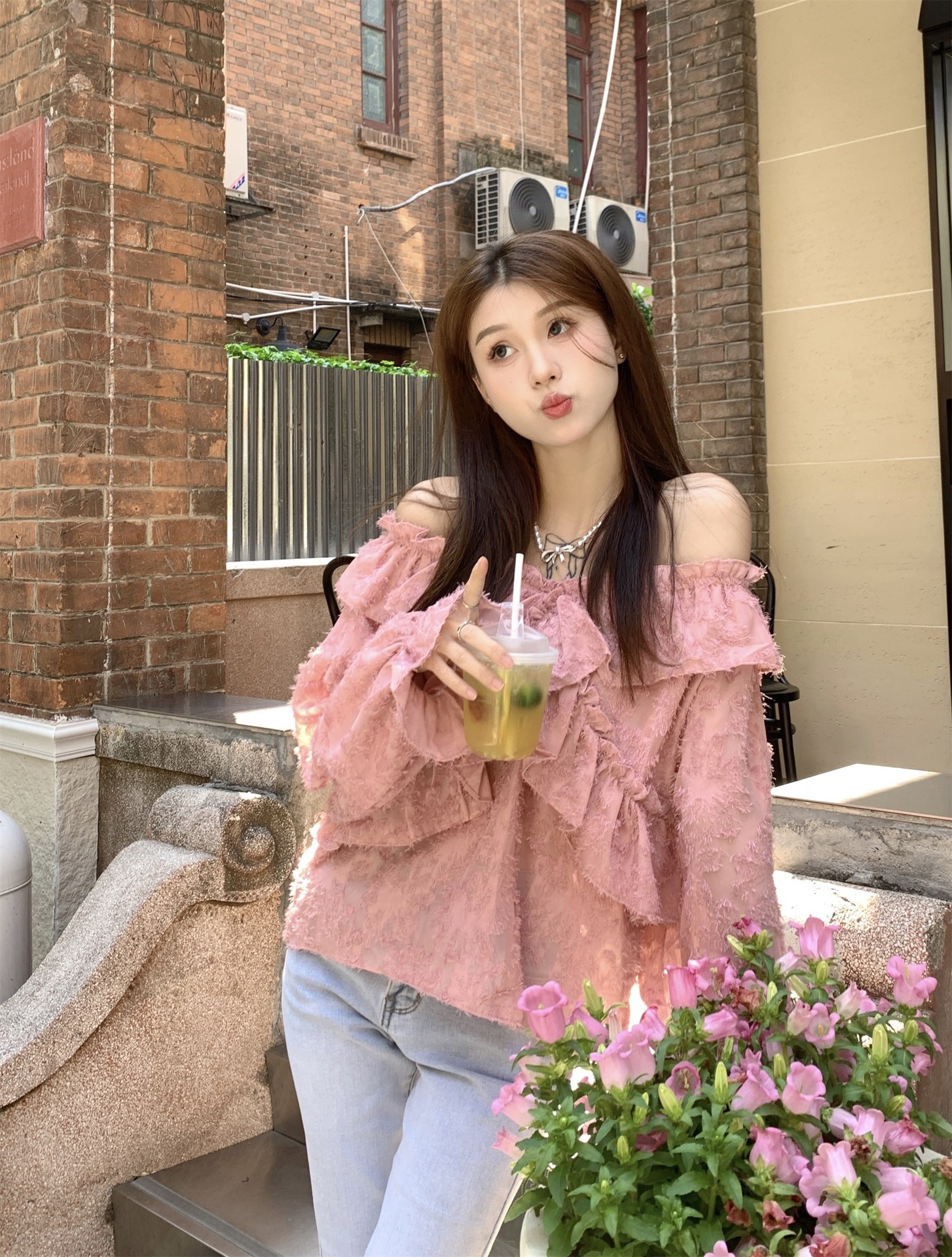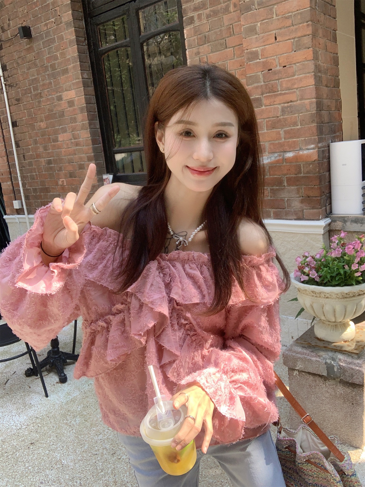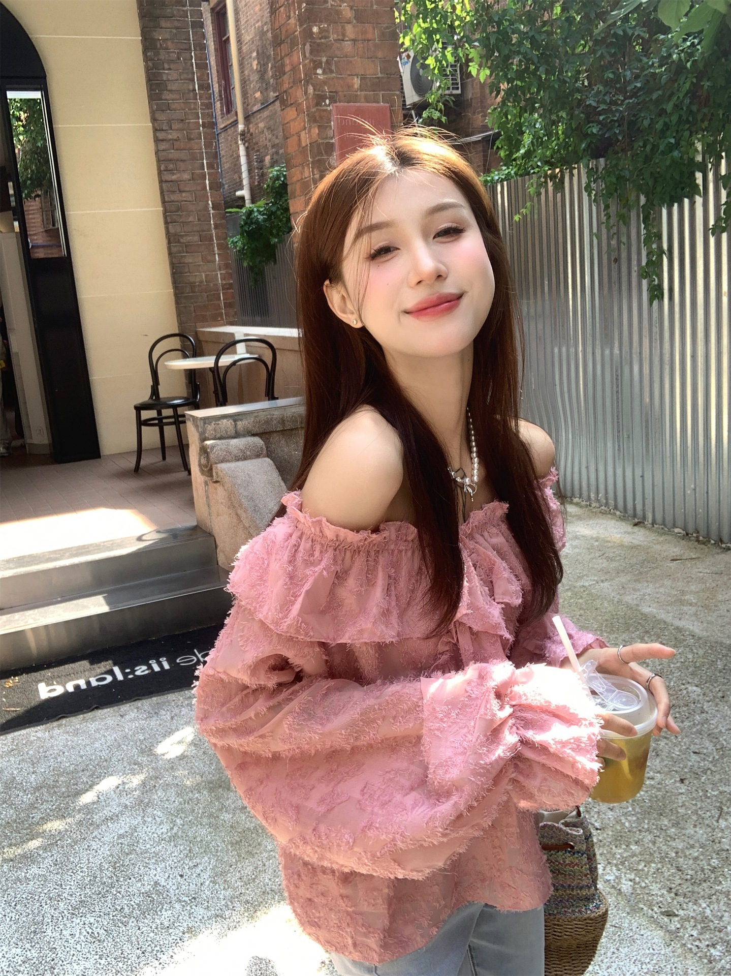 봄과 가을 2025 새로운 부드러운 소녀의 주름진 틈새 쉬폰 셔츠 여성 어깨 디자인 센스 탑스토어 가기