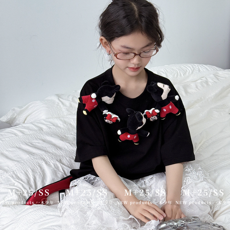 2025 년 여름 새 소녀 큰 아이들 미키 인형 반팔 티셔츠 한국 느슨한 캐주얼 탑 조수 T 도매스토어 가기