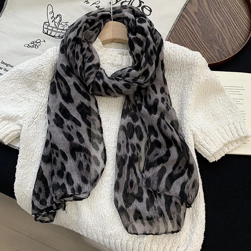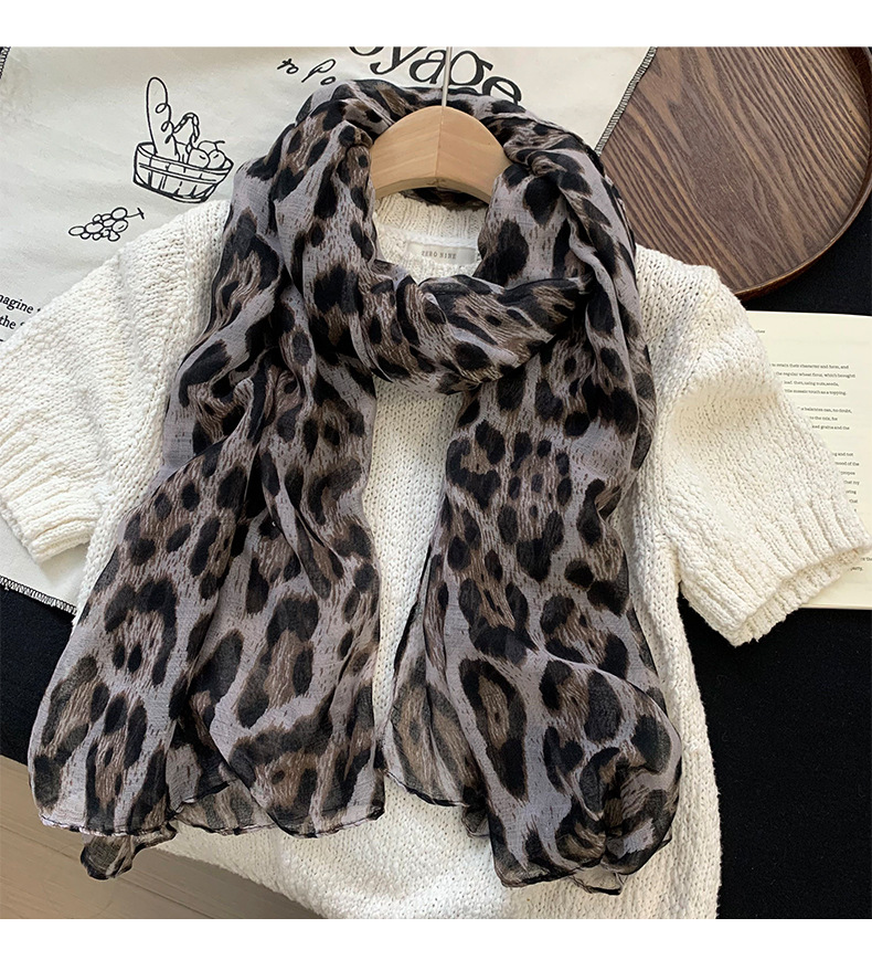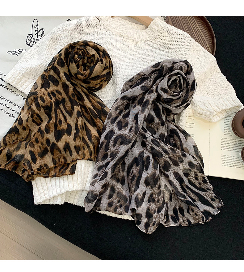 Fangyuan 동일 스타일 밀레니엄 레트로 다크 브라운 레오파드 실크 스카프 목 여성의 얇은 실크 스카프 긴 하이 엔드 스카프 목도리
