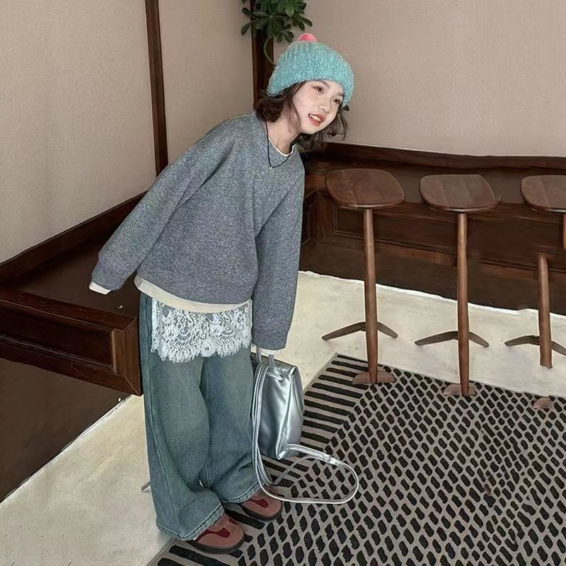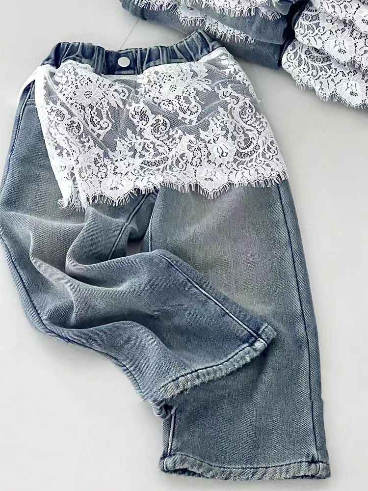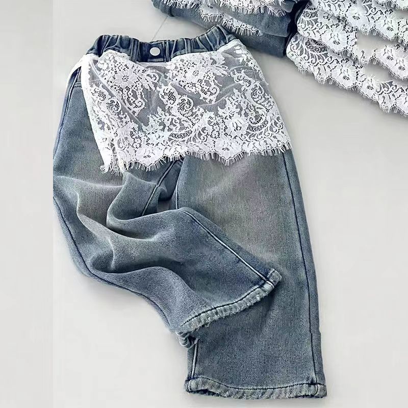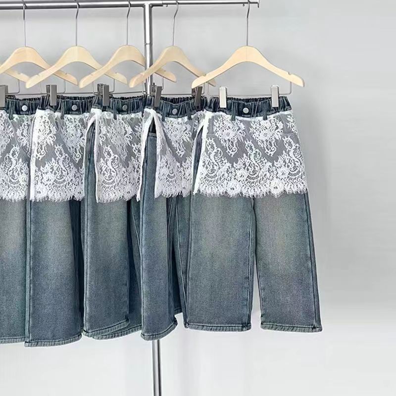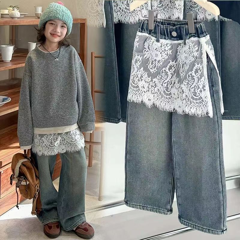 소녀 청바지 2025 봄과 가을 새로운 어린이 캐주얼 느슨한 스트레이트 바지 크고 중간 크기의 어린이 서양식 레이스 와이드 레그 바지