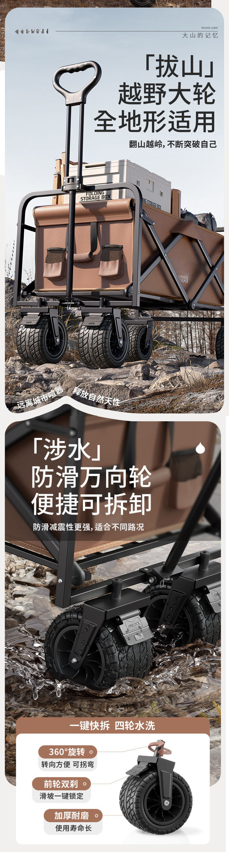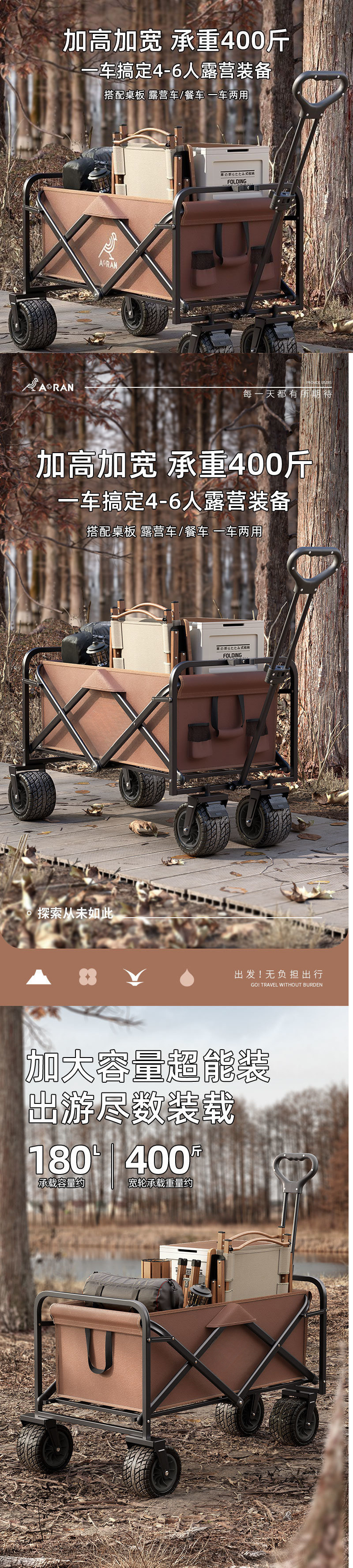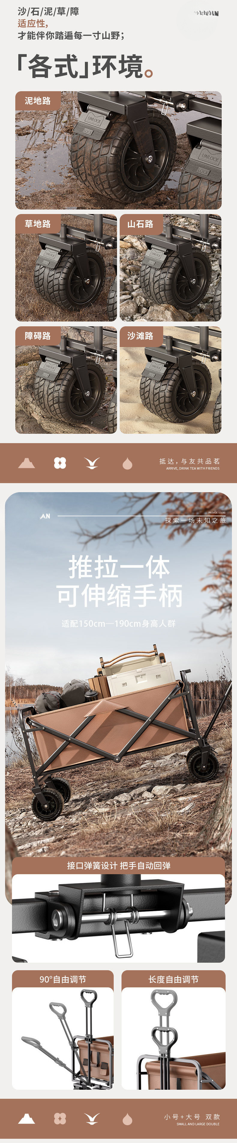 • AR-브라운 [올스틸 프레임/600D 옥스포드 원단]-[확대] 더블 브레이크 오프로드 사일런트 휠 + 테이블