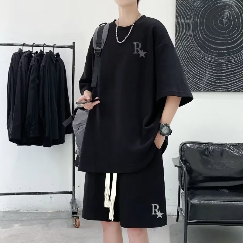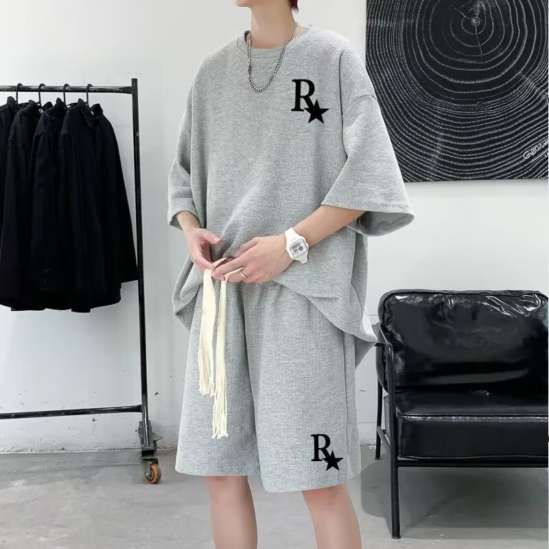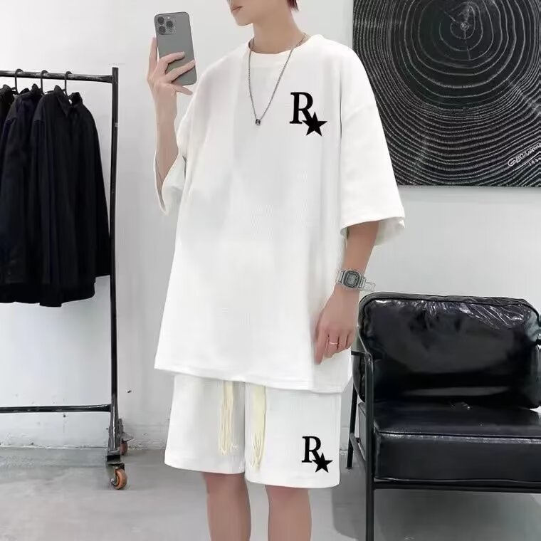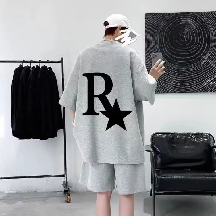 华夫格运动套装男夏季休闲宽松大码高街潮牌印花短袖短裤两件套潮