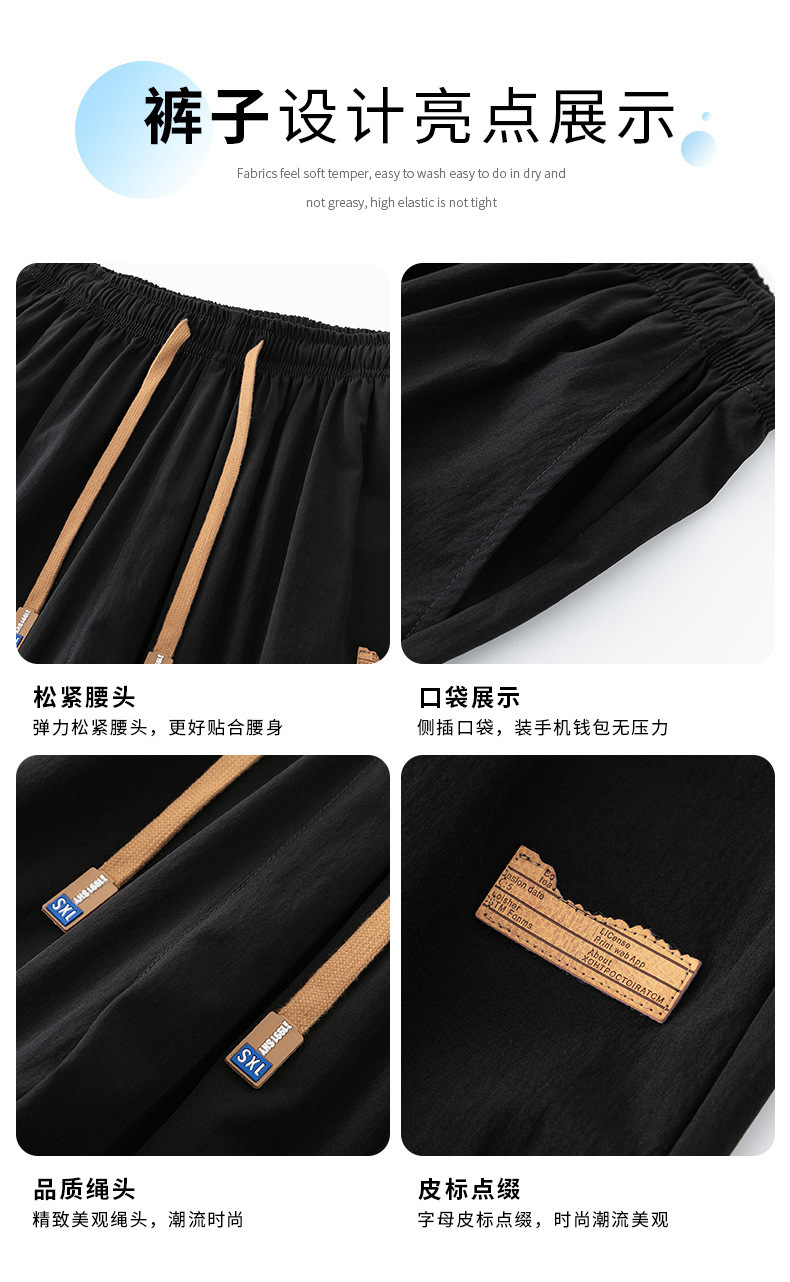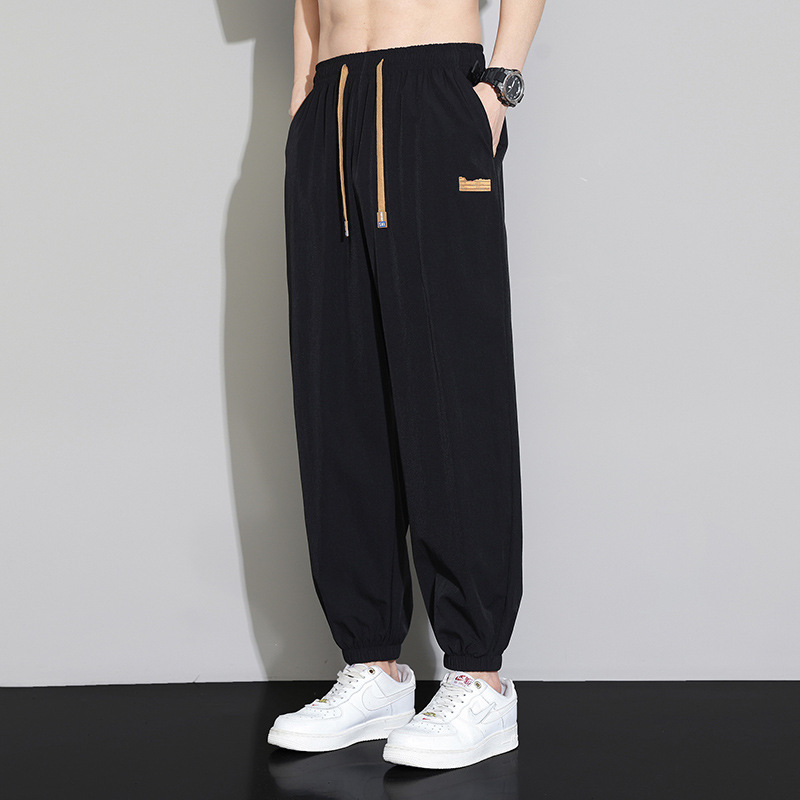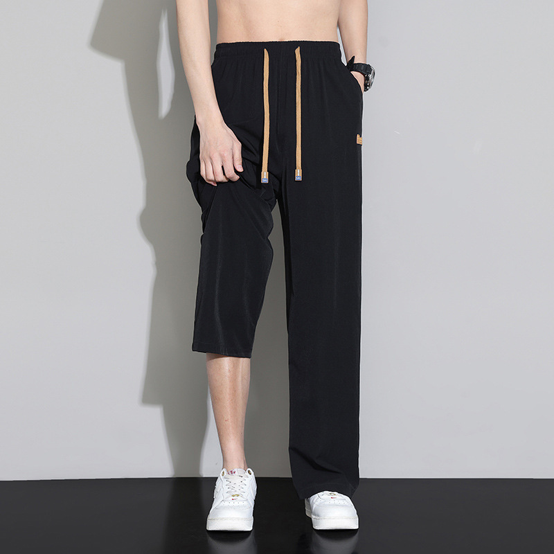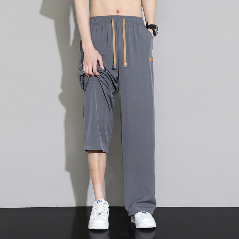 여름 새로운 아이스 실크 남성용 바지는 감각 넓은 다리 느슨한 스포츠 스트레이트 캐주얼 바지 소년을위한 홍콩 스타일 트렌디스토어 가기