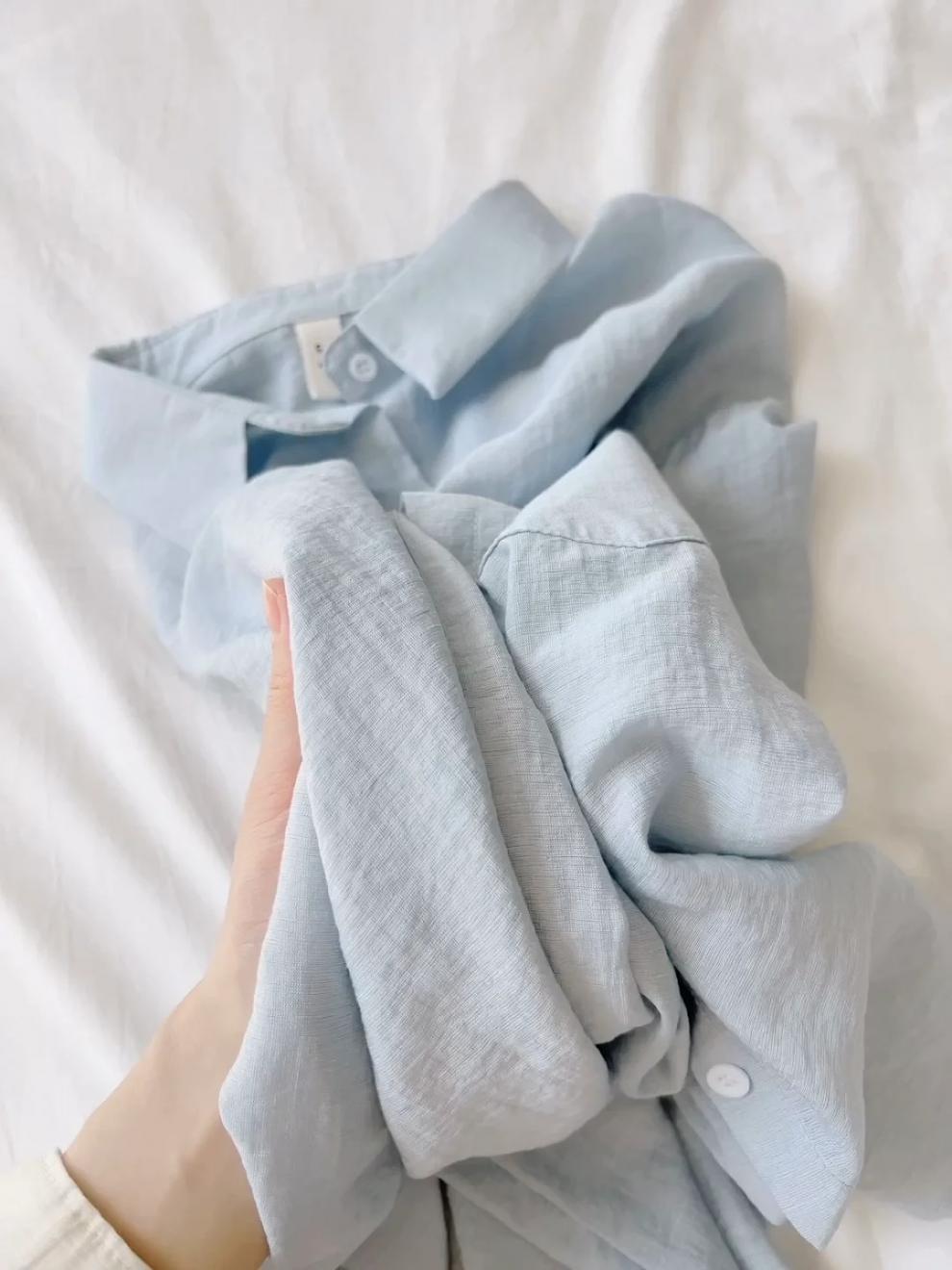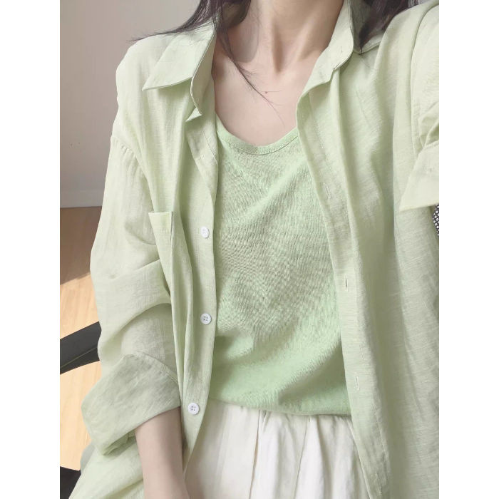 블루 코튼과 린넨 긴팔 자외선 차단 셔츠 여성 코트 여름 얇은 슬림 루즈 캐주얼 폴로 칼라 린넨 셔츠스토어 가기