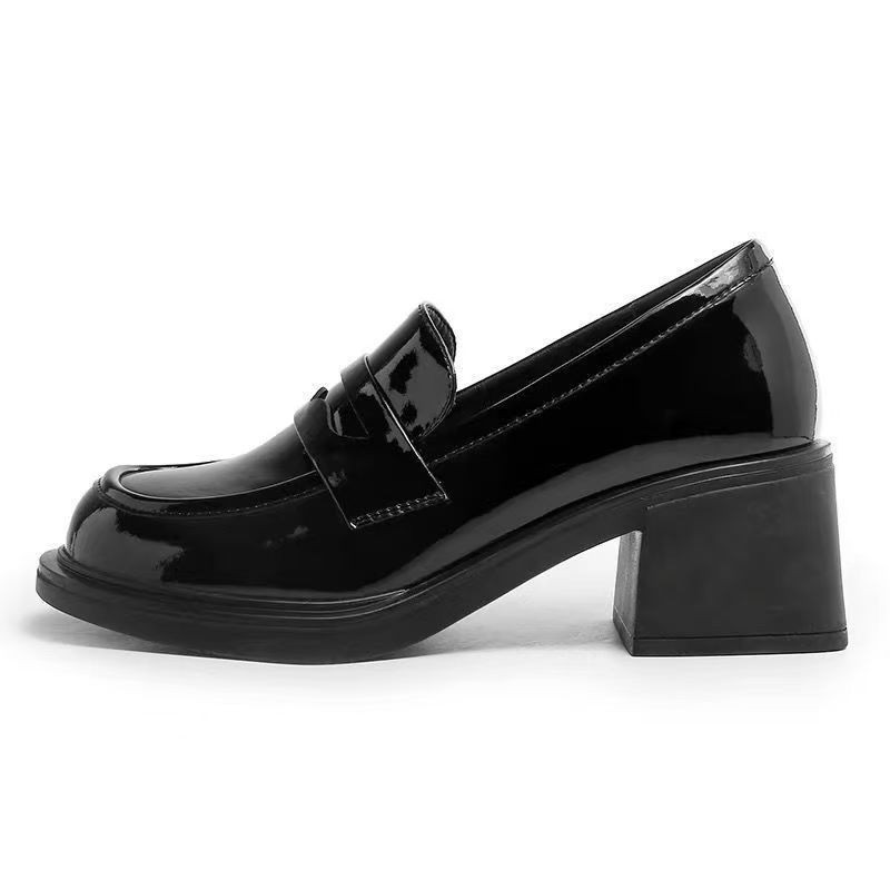 영국 스타일의 두꺼운 가죽 신발 여성의 2025 봄 새로운 레트로 올 매치 프렌치 로퍼 블랙 미드 힐 싱글 레이어 신발스토어 가기
