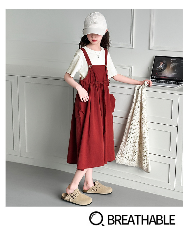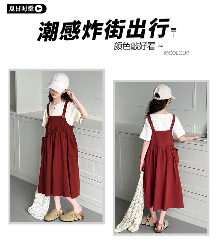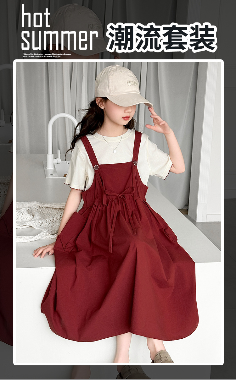 소녀 스트랩 스커트 세트 2025 여름 새 스타일 중대형 어린이 스타일 3 차원 대형 포켓 스트랩 공주 트렌디 스커트스토어 가기