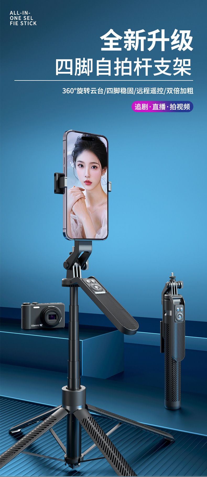 휴대용 휴대폰 셀카봉 360 관광용 ° 회전식 데스크탑 스탠드 블루투스 원격 제어 텔레스코픽 손떨림 방지 셀카 유물스토어 가기