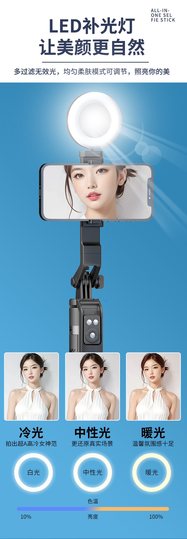 • 미니 - 조명이 달린 흰색 셀카봉 [70cm]