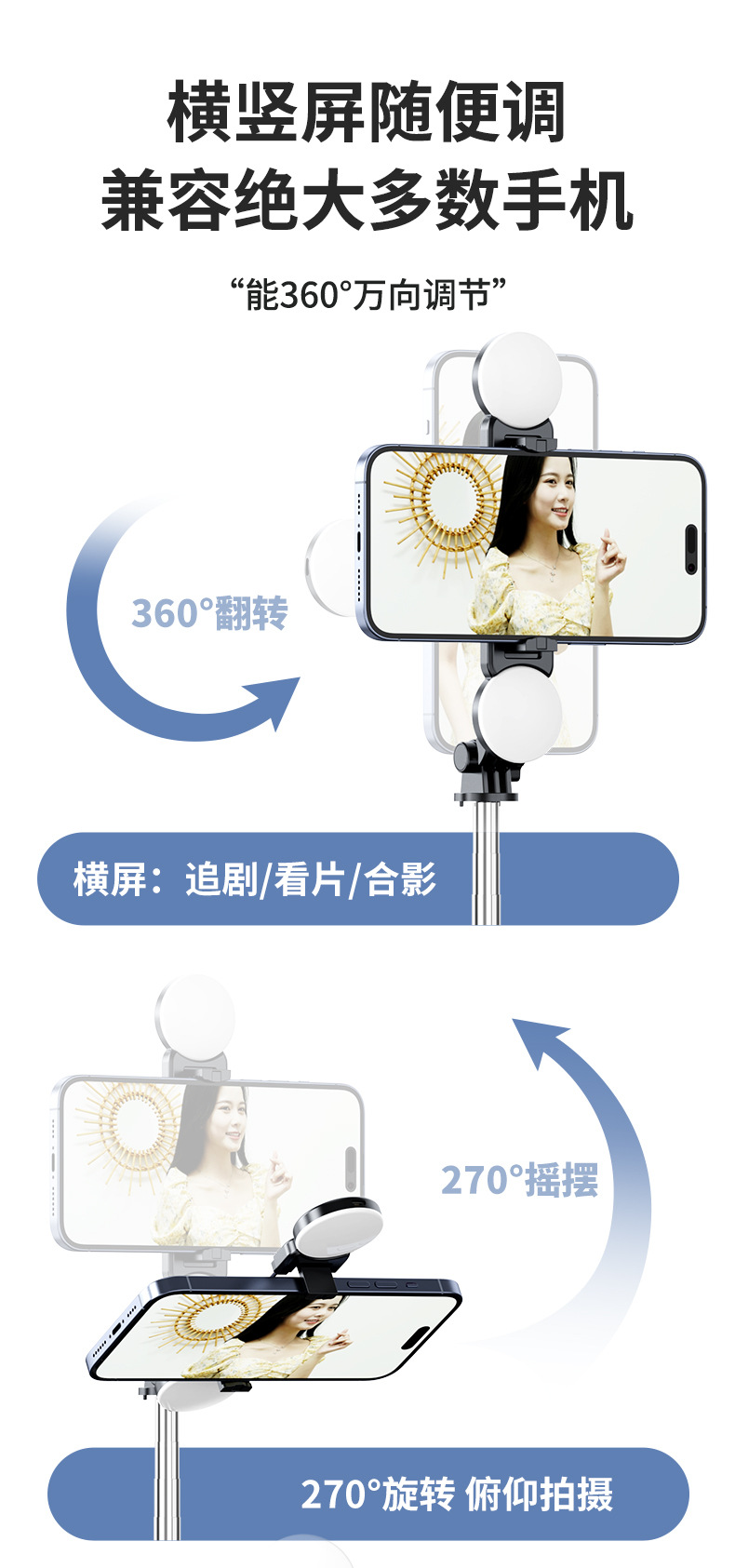 휴대용 휴대폰 셀카봉 360 관광용 ° 회전식 데스크탑 스탠드 블루투스 원격 제어 텔레스코픽 손떨림 방지 셀카 유물