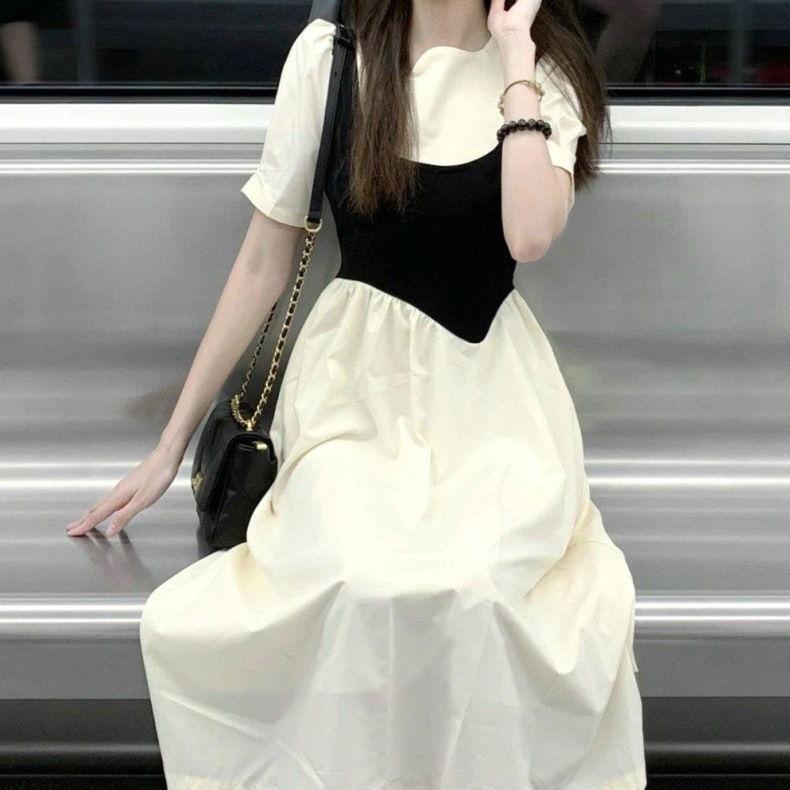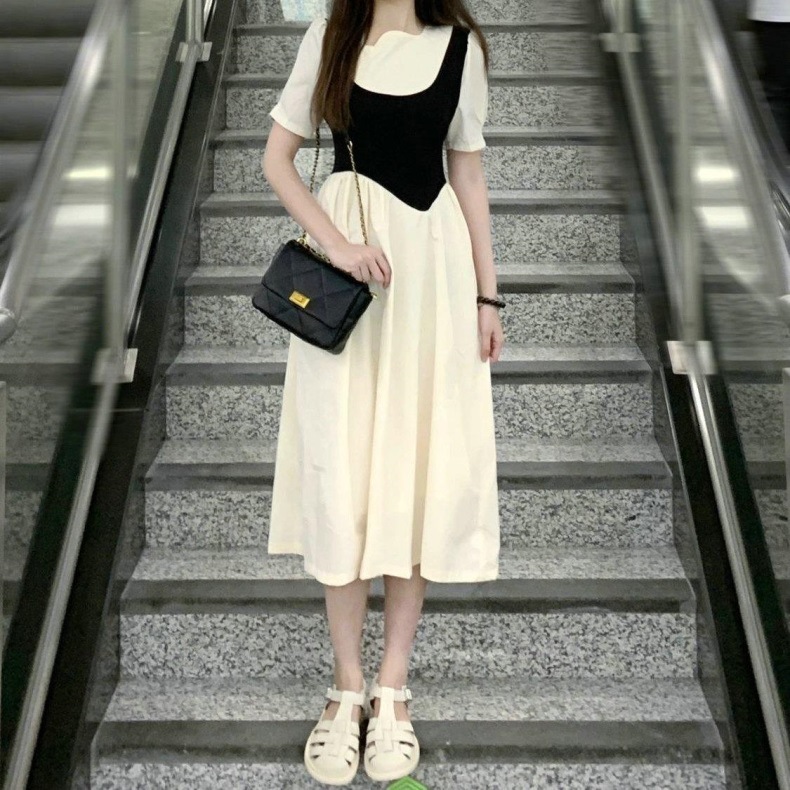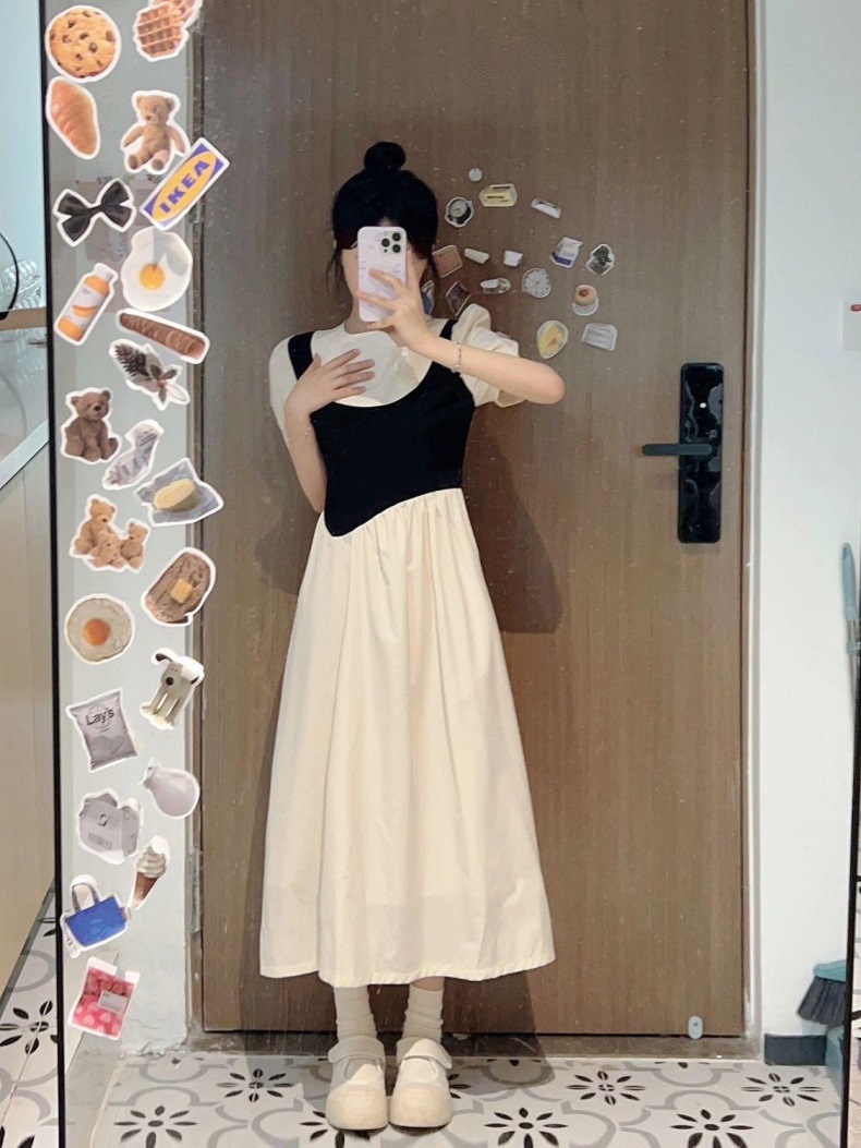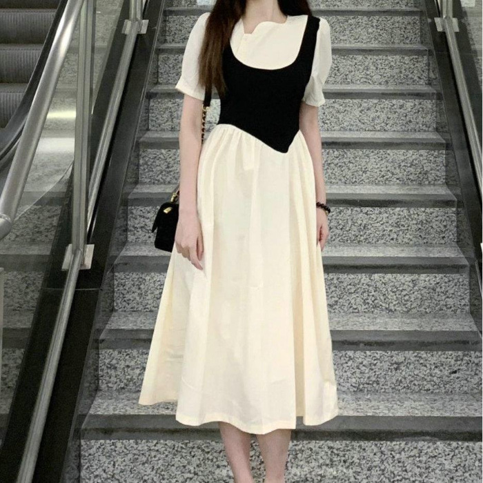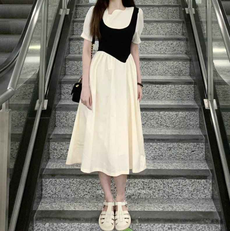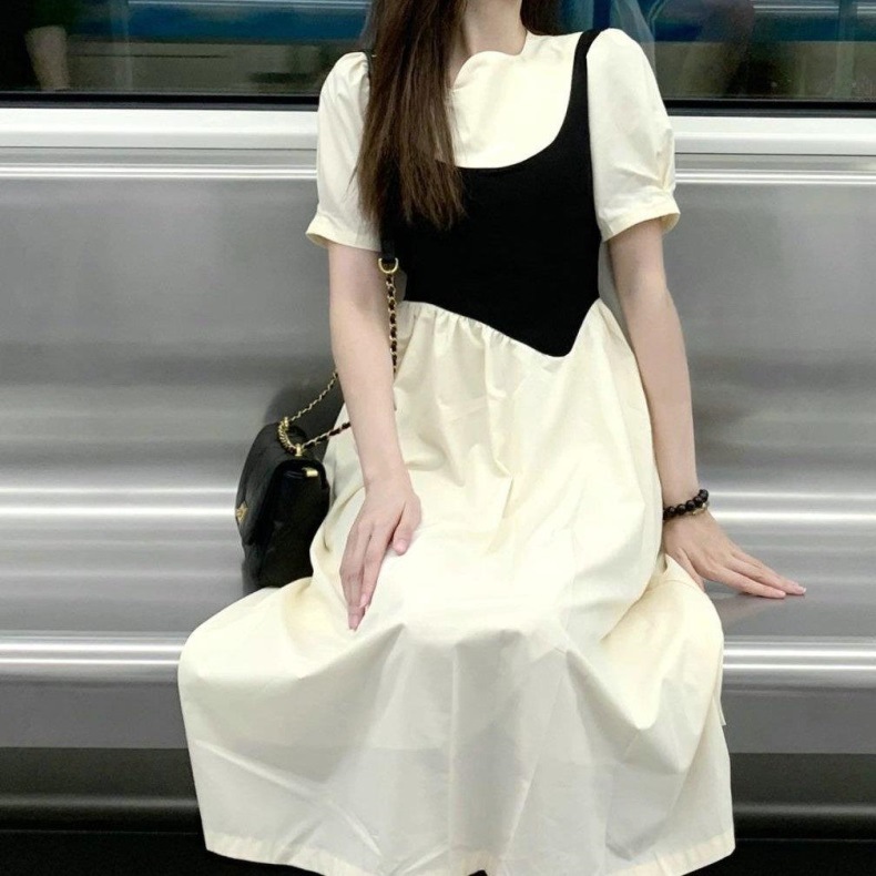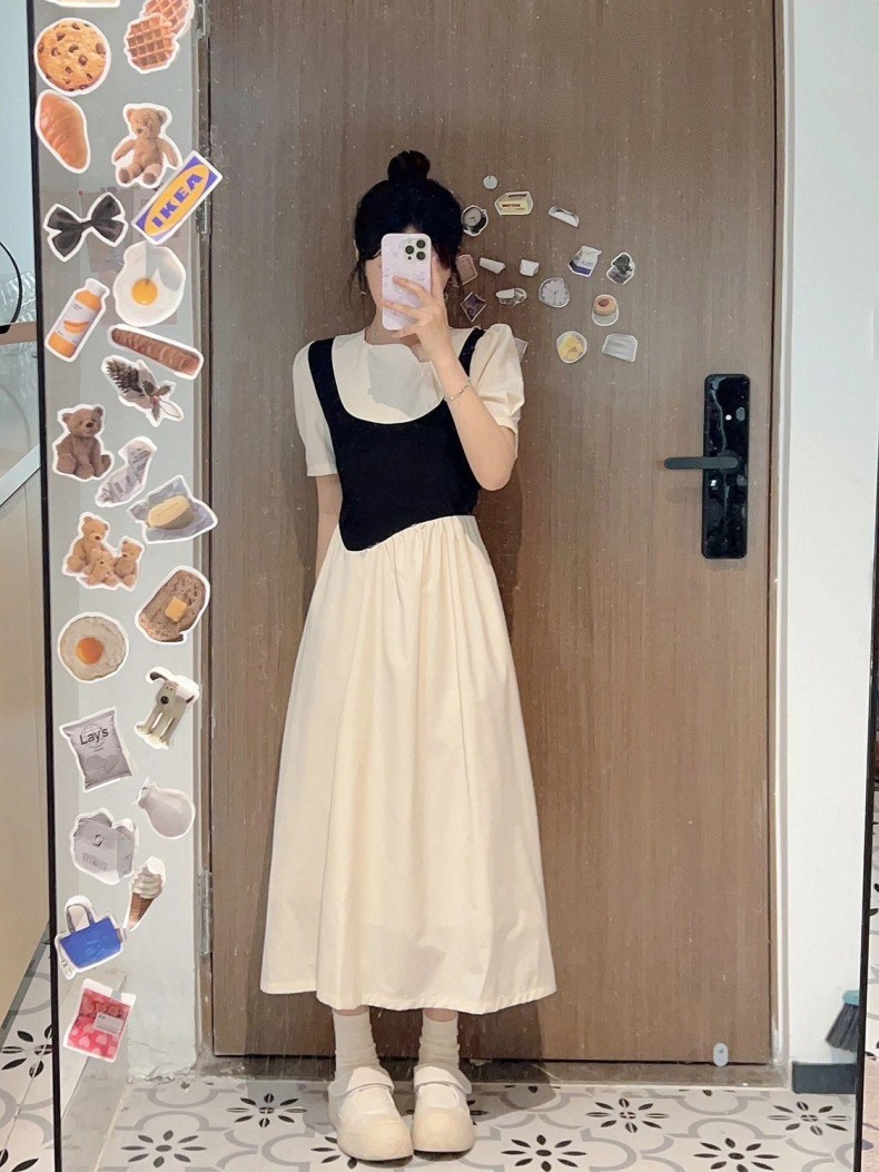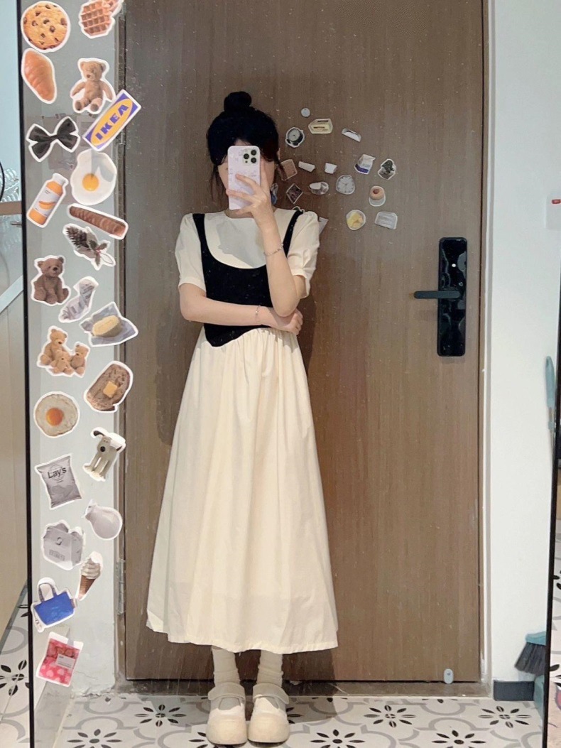 신선하고 달콤한 가짜 투피스 원피스 바느질 기질 허리 폐쇄 학생 일본 여름 대학 스타일 캐주얼 롱 원피스 여성스토어 가기
